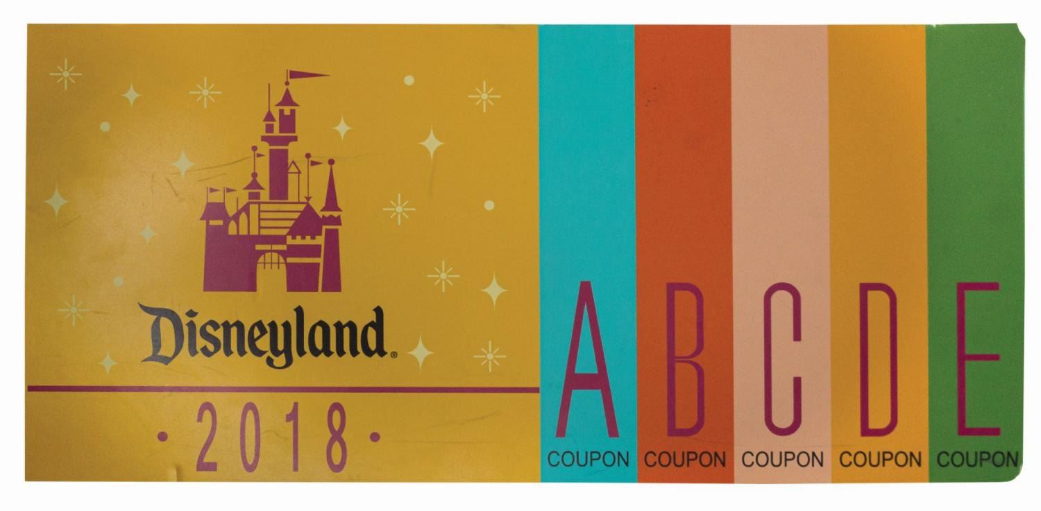 (Disneyland, 2018) A photo op sign in the shape of a classic ticket book used for a Disneyland event. The sign is designed to resemble the old ticket books with the classic A, B, C, D, and E ticket coupons, and bears an image of the Disneyland logo with "2018" below. Measuring 11"x24", the foamcore sign is in good condition with some cracking and chipping at the edges consistent with use. There is some scuffing and other general surface wear.