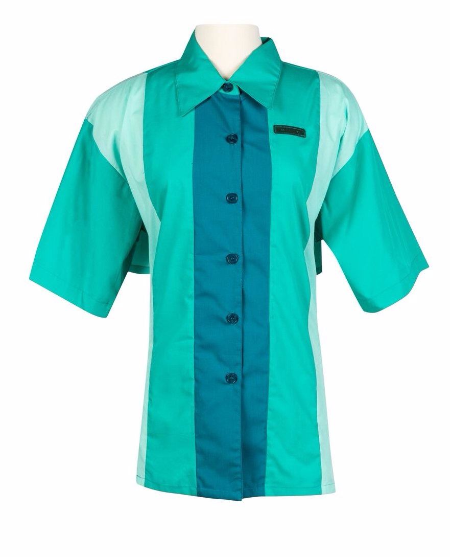 (EPCOT, c.2000) An original female cast member shirt for the "Innoventions" attraction in the Future World area of EPCOT Center. This shirt features stripes in shades of blue, and still retains its original Disney wardrobe tag inside. This shirt is a female size 2XL and is in very good condition with minor wear from use.