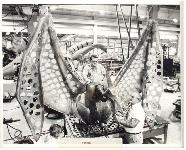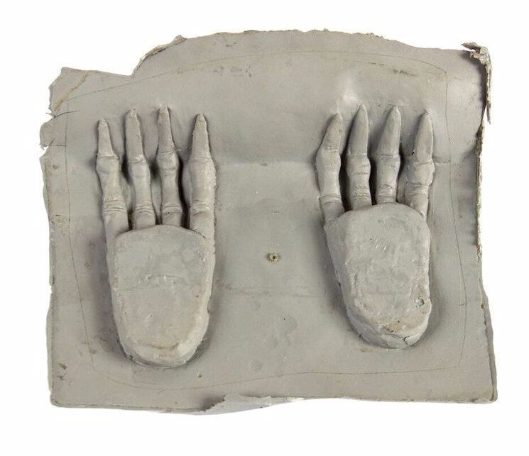 (EPCOT, 1981) A pair of (2) molds used in the creation of feet for the animatronic Pteranodon figures within EPCOT's "Universe of Energy" pavilion. The molds are for the top and bottom half of the feet, and come with a publicity photo of one of the Pteranodon figures being built with Disney stamps on the back. The molds measure approximately 7"x9" and 1.5" deep, and the set is in overall good condition with some wear throughout from use.