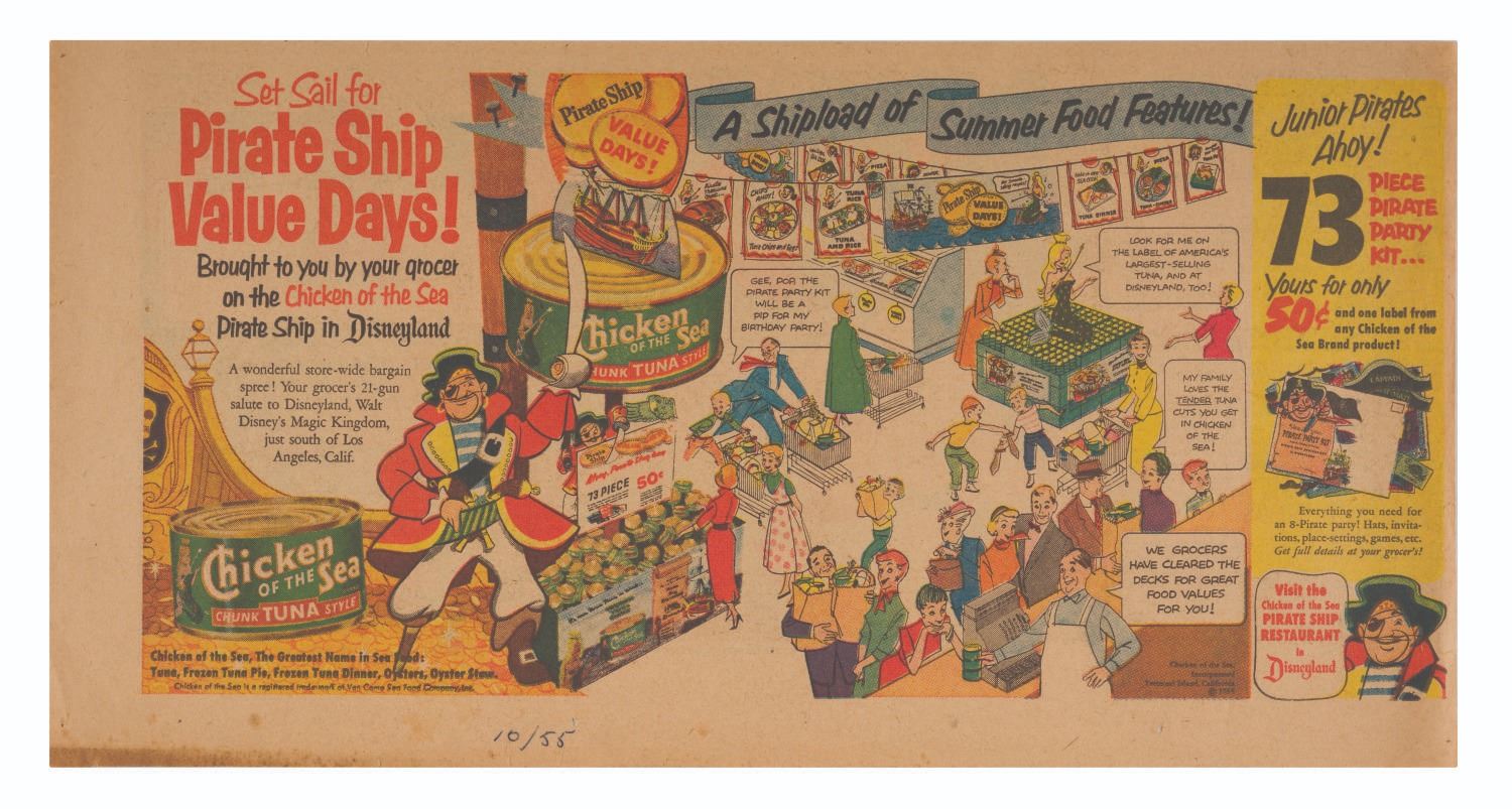 (Disneyland, 1955) An advertisement for the Pirate Ship Value Days grocery promotion from the Chicken of the Sea Restaurant at Disneyland. Measuring 7.5" x 14.5", the piece is in very good condition.