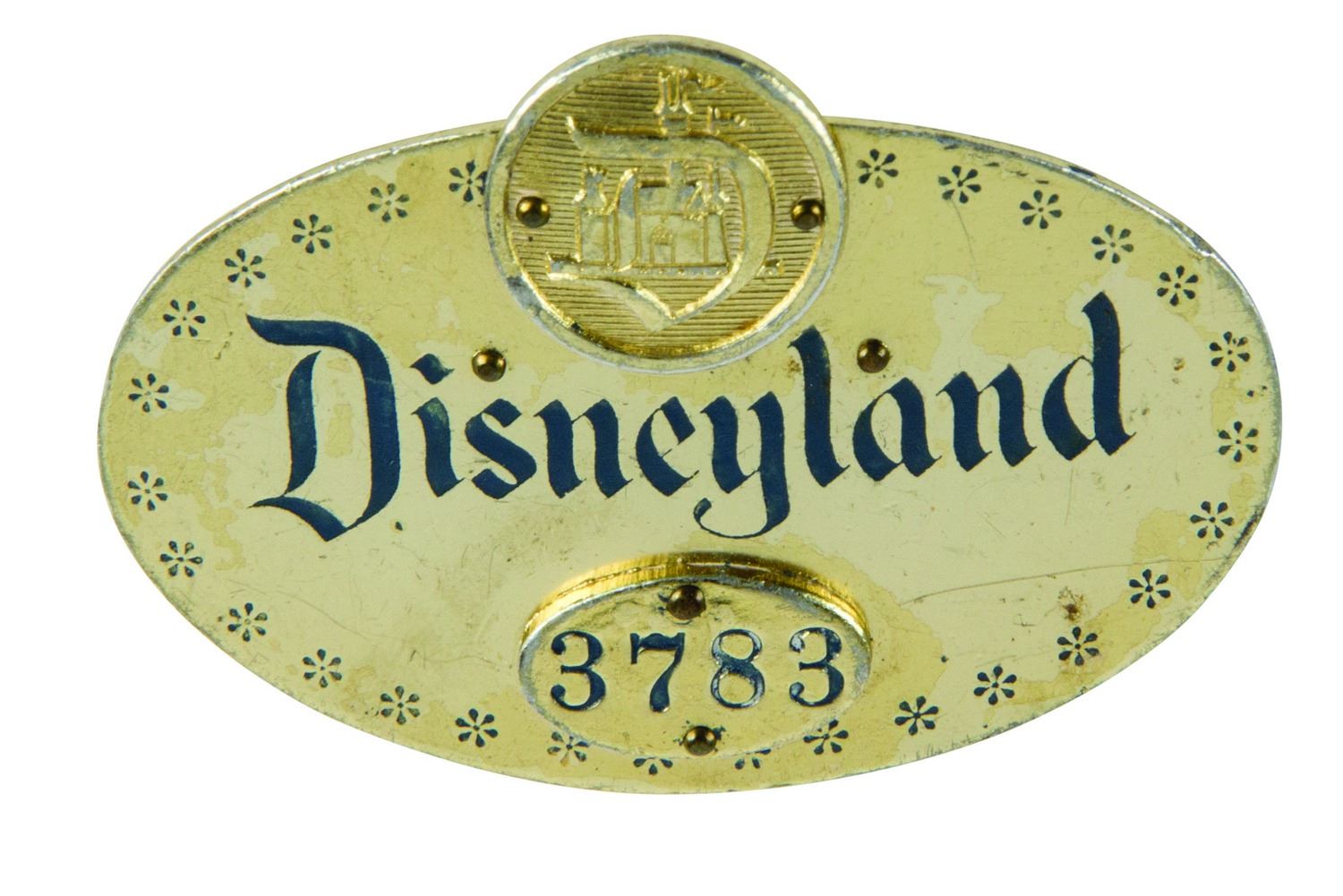 (Disneyland, c.1960) An extremely rare original Disneyland metal ID badge of the style used in the park between 1955 and 1962. Before the well-known modern-style Disneyland cast member name tags were issued, Disneyland supplied these stamped aluminum employee ID number badges to all cast members. Walt Disney himself carried one of these with the ID #1. This badge is number 3783 and measures 2"x2.5". The badge is in good condition with some expected scuffing and minor tarnishing from use.