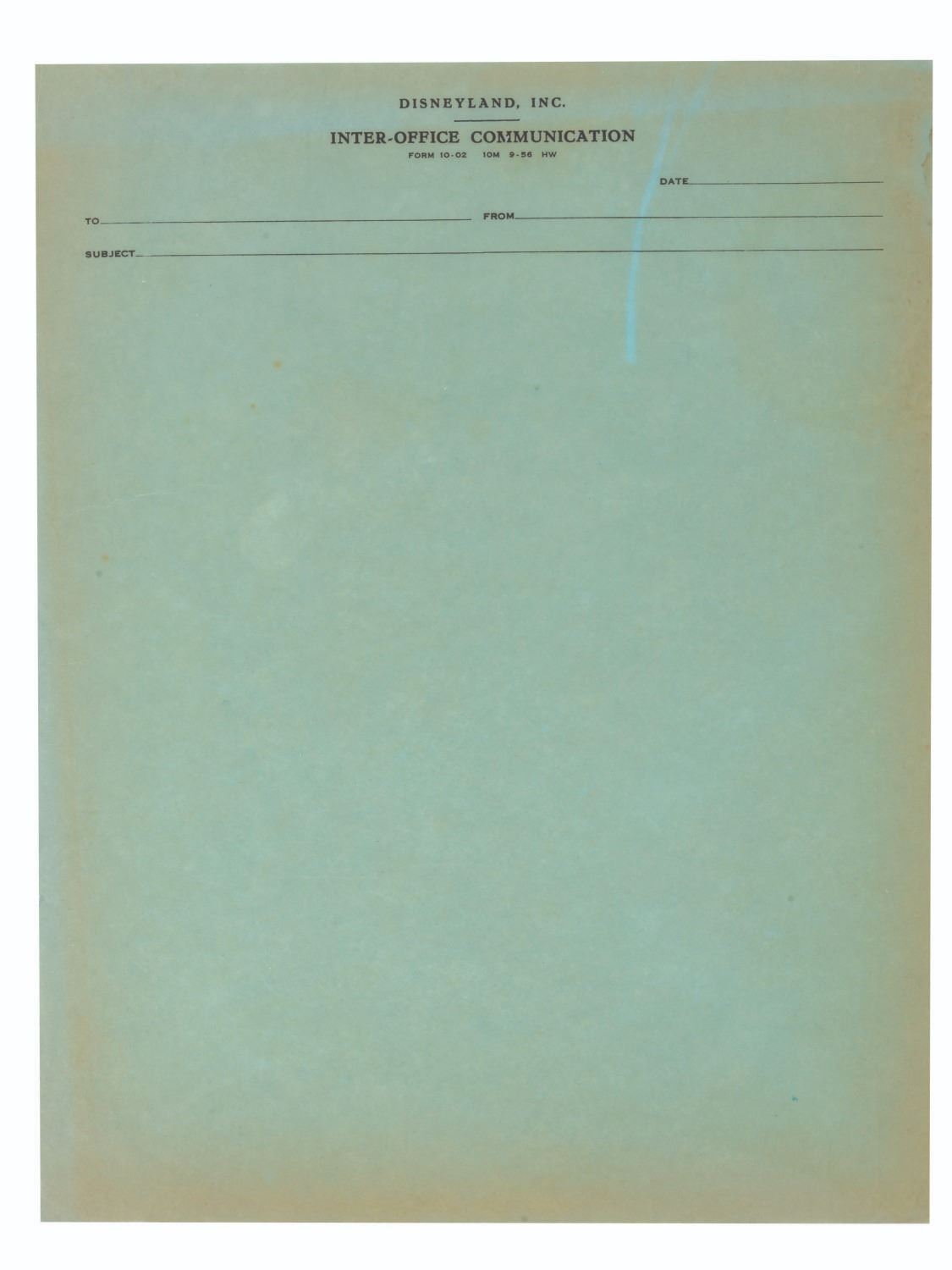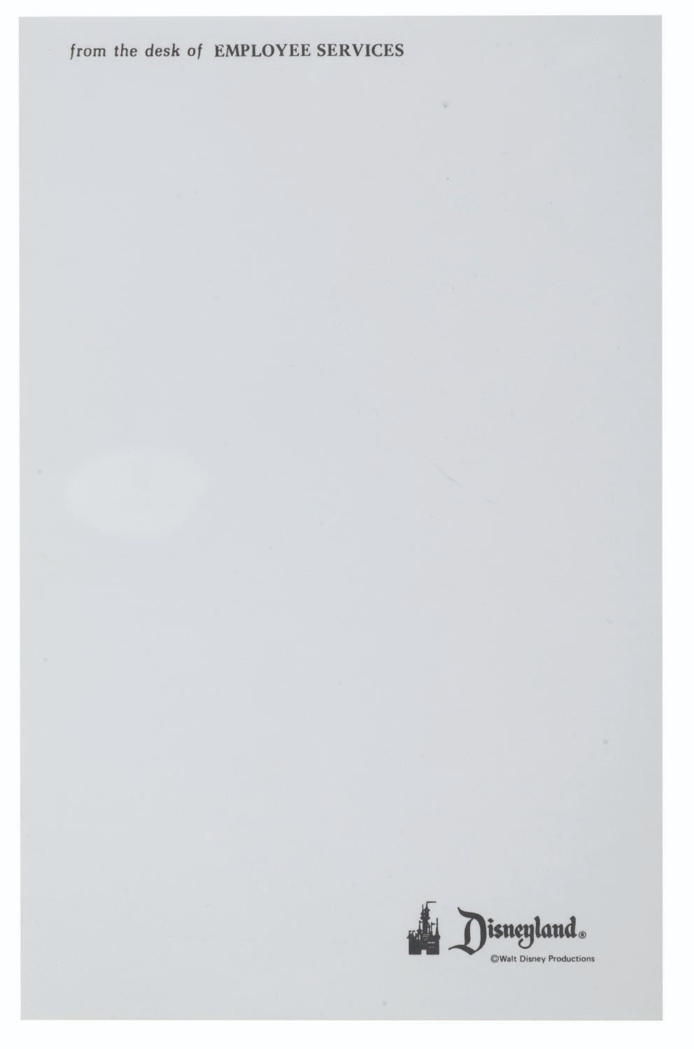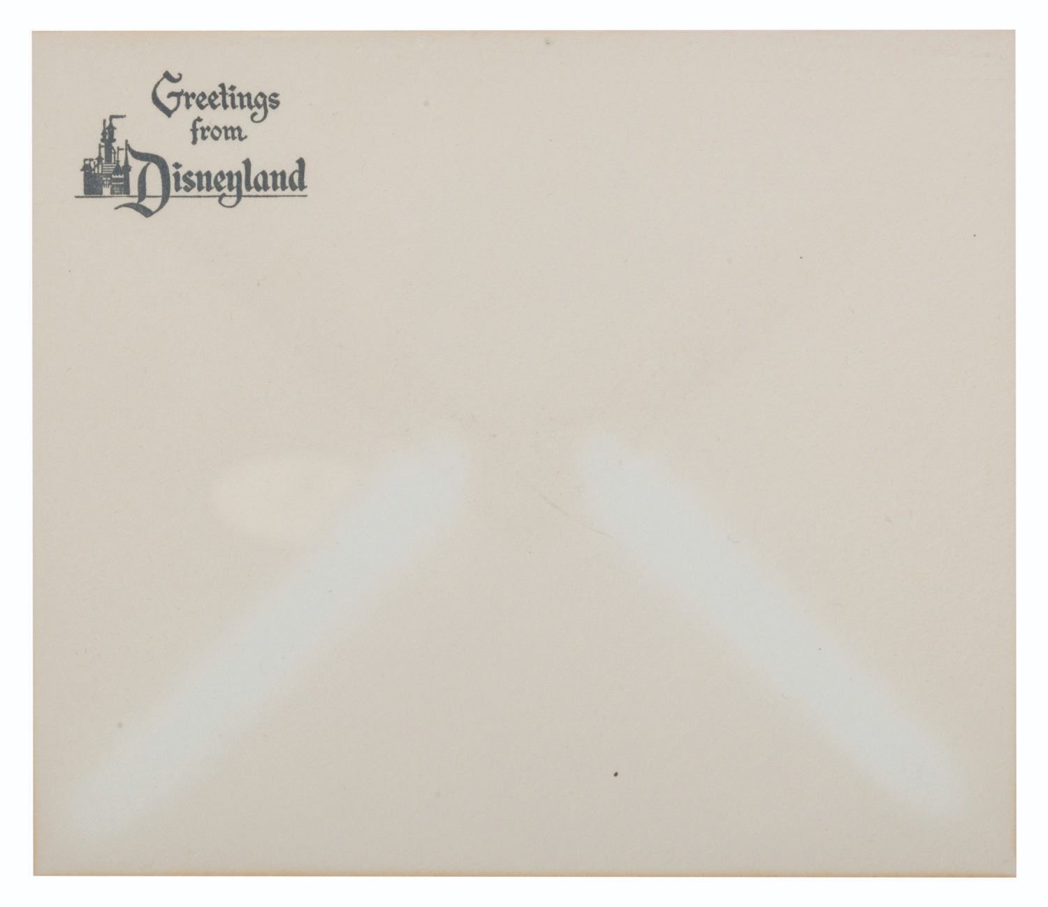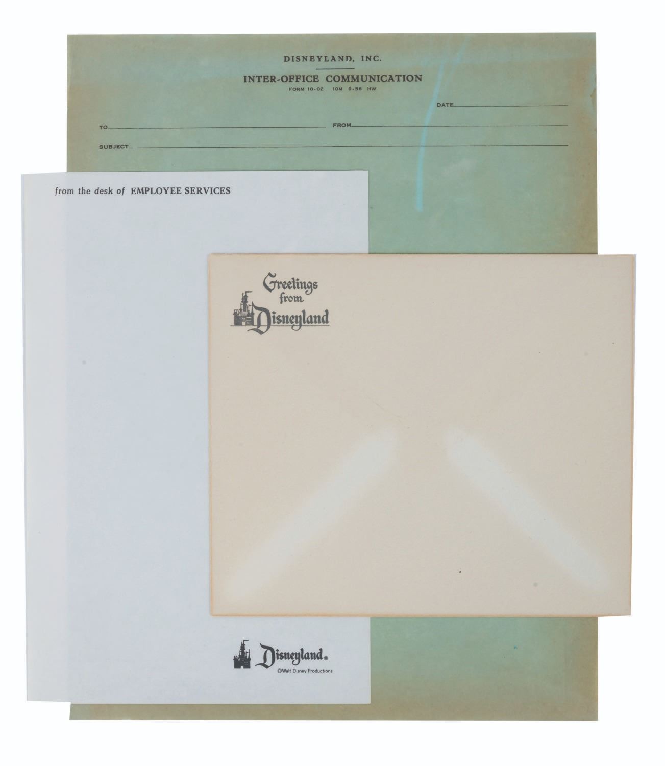 (Disneyland, 1950s-70s) Early Disneyland stationery including an inter-office communication sheet, a "from the desk of Employee Services" sheet and a "Greetings from Disneyland" envelope. Measuring 8.5" x 11", the inter-office sheet is in good condition with discoloration and wear from age. The employee services sheet measures 5.5" x 8.5" and is in very good condition. The envelope measures 4.75" x 6.75" and is in good condition with typical discoloration from age.