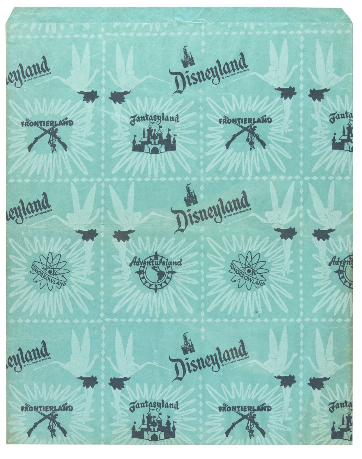 (Disneyland, c.1955) An original shopping bag from the early years of the park. The bag pattern, which was designed by Imagineers and artists at the studio, was used by various concessionaires and the imagery is so iconic of the park, that it was later used again during the park's 55th anniversary celebration. This scarce original bag measures approximately 18.5"x14.5". It is in very good condition, with minor discoloration on the bottom of the left and right edges. The back of the bag has some wear and discoloration from its original use; however this does not affect the vibrant imagery on the front.