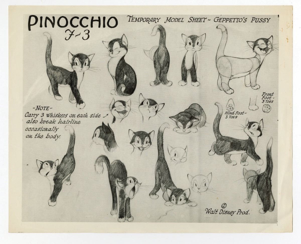 (Walt Disney Studios, 1939) A very early studio photostat model sheet featuring an early version of Figaro from "Pinocchio". Titled, "Temporary Model Sheet - Geppetto's Pussy". Measures 10"x12.5". In very good condition with minor edge wear.