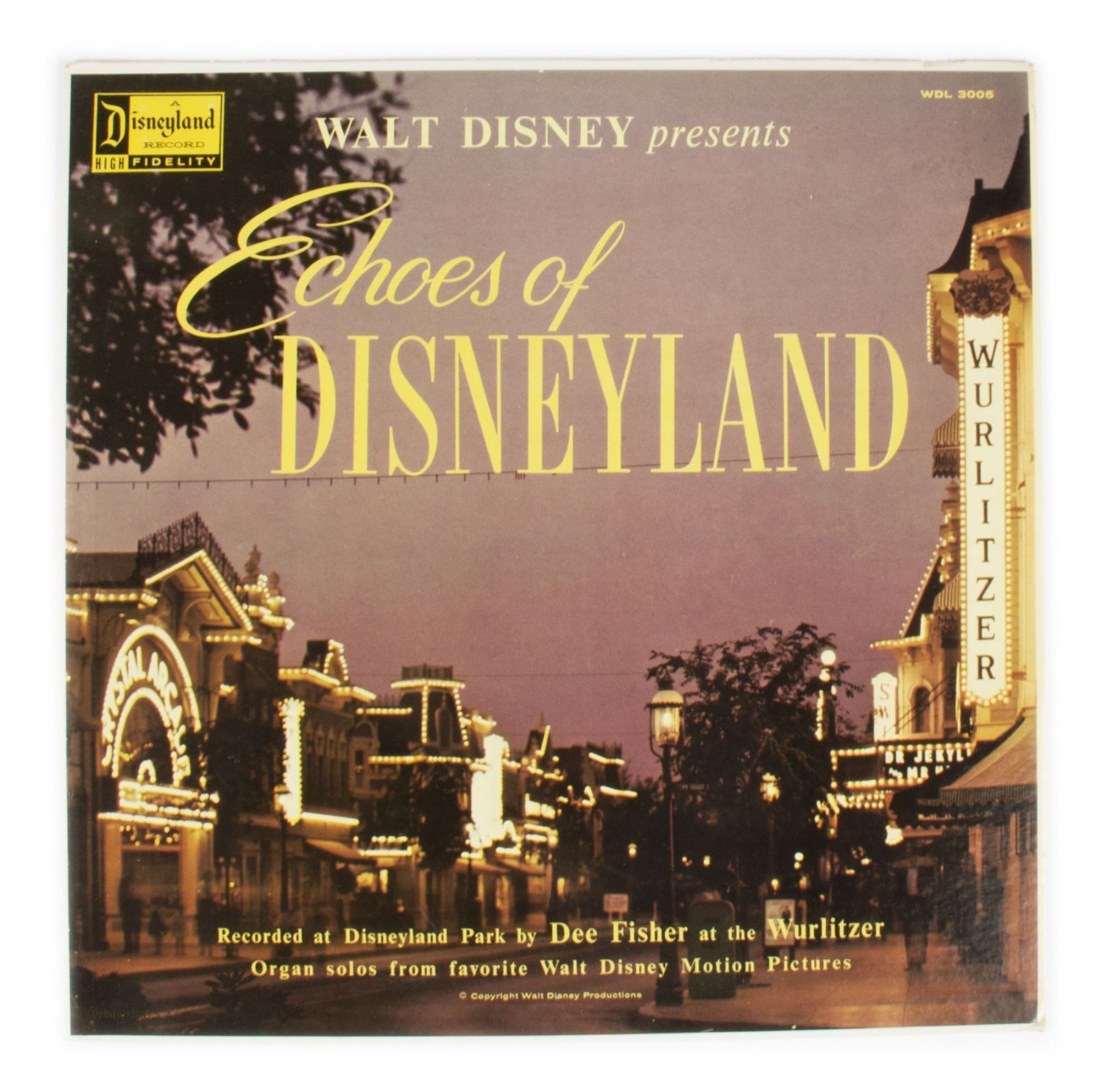 (Disneyland, c.1956) A very rare Disneyland record titled "Echoes of Disneyland" which contains organ solos from fan favorite Disney films. This record was performed by Dee Fisher, Manager of the Wurlitzer store on Main Street, and was recorded on Fisher's electric organ in the Main Street Wurlitzer store. The record measures 12.5"x12.5" and the condition is very good with minor edge-wear to the album cover.