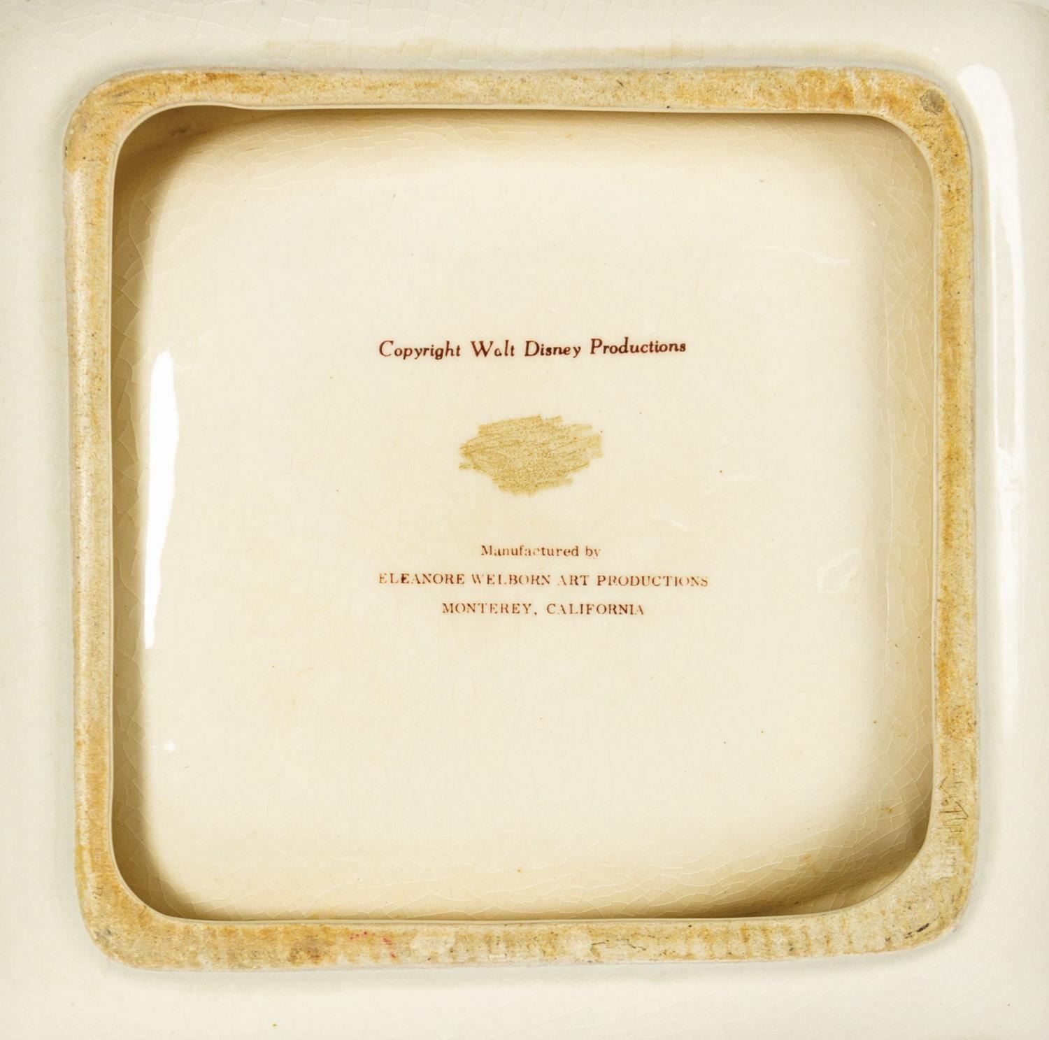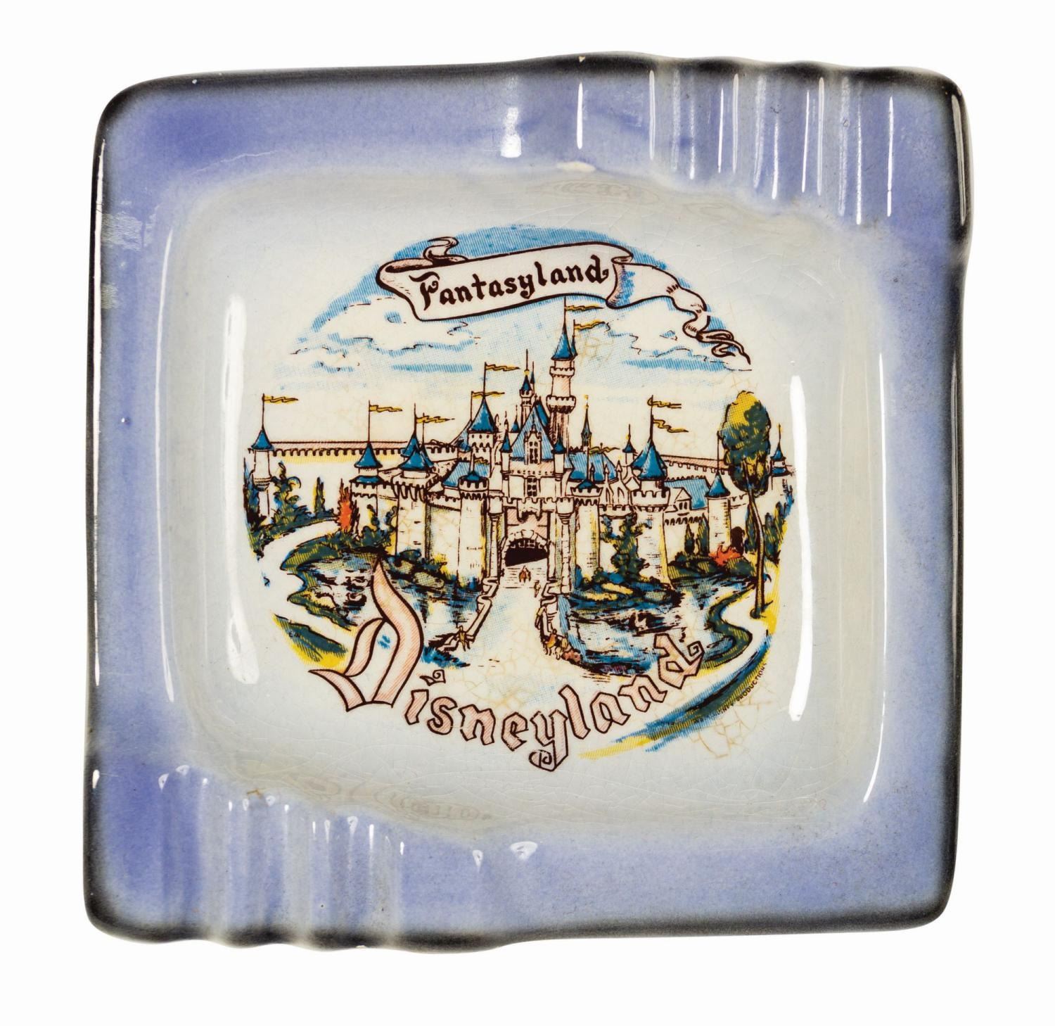 (Disneyland, c.1955) A vintage Fantasyland ashtray created by Eleanor Welborn Art Productions for Disneyland. Hand selected by Walt Disney as the first official ceramic supplier to the park prior to its opening, many of Eleanor Welborn's original souvenir designs were based on Imagineering concept art as the actual attractions had yet to be built. The ashtray features a colorful central image of Sleeping Beauty castle in the well and is marked on the reverse with maker's information. Measuring 6.25"x6.25" and 1.25" deep, the ashtray is in very good condition with crazing to the glaze throughout and some yellowing in the image.