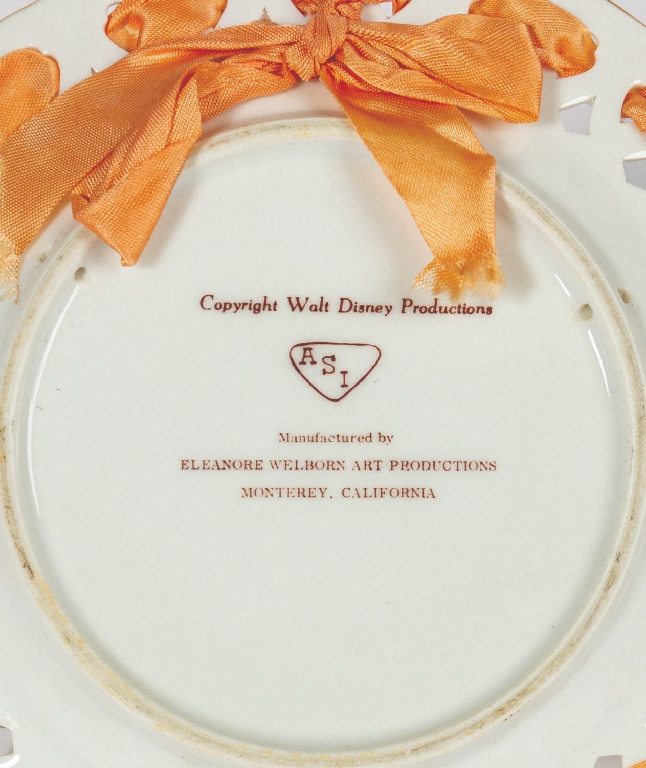 (Disneyland, c.1955) An ornate vintage Main Street lace plate created by Eleanor Welborn Art Productions for Disneyland. Hand selected by Walt Disney as the first official ceramic supplier to the park prior to its opening, many of Eleanor Welborn's original souvenir designs were based on Imagineering concept art as the actual attractions had yet to be built. The plate retains its silk ribbon and is marked with maker's information on the reverse. Measuring 6.25" in diameter, the plate is in very good condition with some rubbing and chipping to the gold-tone border accents.