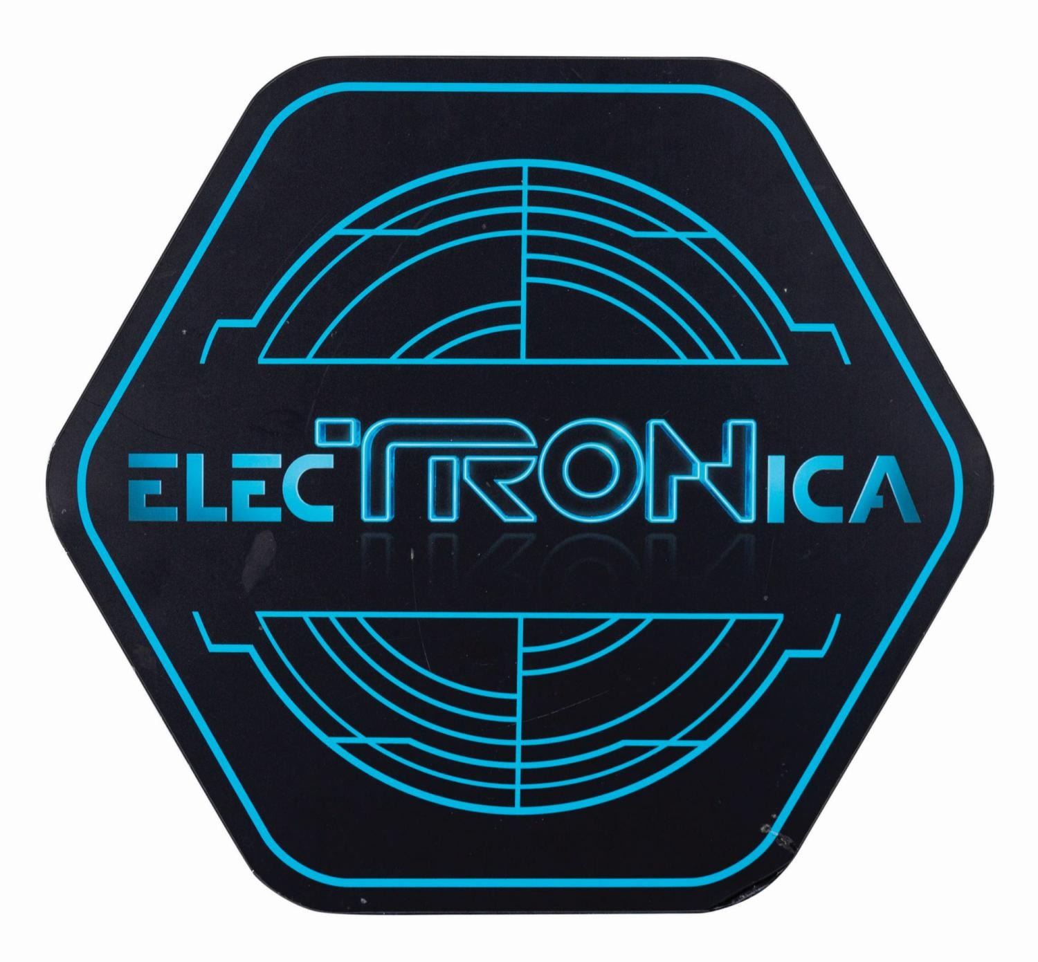 (California Adventure, c.2010) A sign used during the ElecTRONica event at Disney's California Adventure. Created in part to promote the film Tron: Legacy which premiered two months after the event began, this nighttime celebration featured a DJ, a laser light show, the End of the Line Club, and Flynn's Arcade. Printed and adhered to thin metal with a plastic core, the sign is in the film's signature blue and black and reads "ElecTRONica." Measuring 16.25"x18", the sign is in good condition with some expected scuffing and scratching to the surface from park use. There is some impact damage causing slight bending at the upper right and lower right corners, with peeling at the lower right.