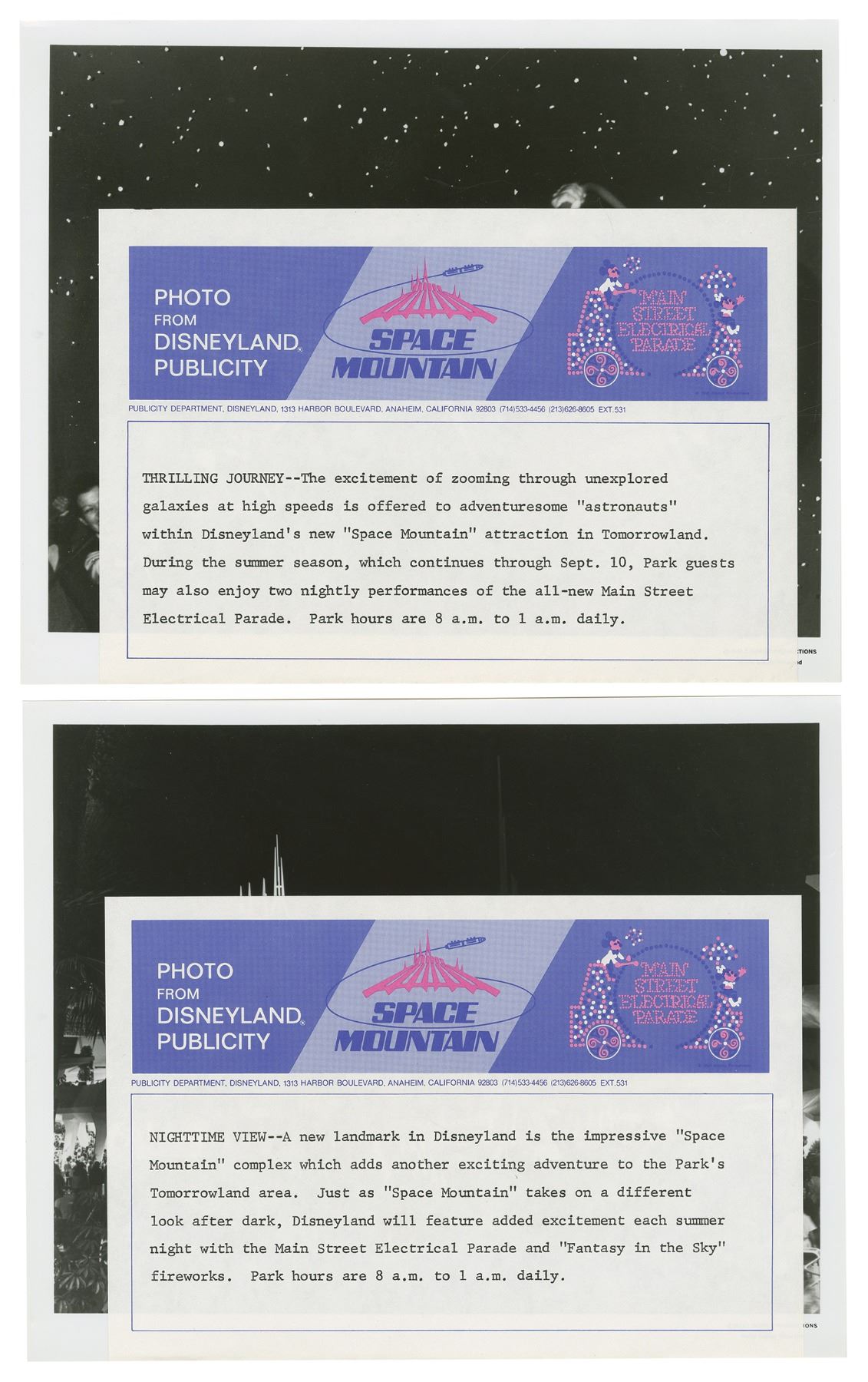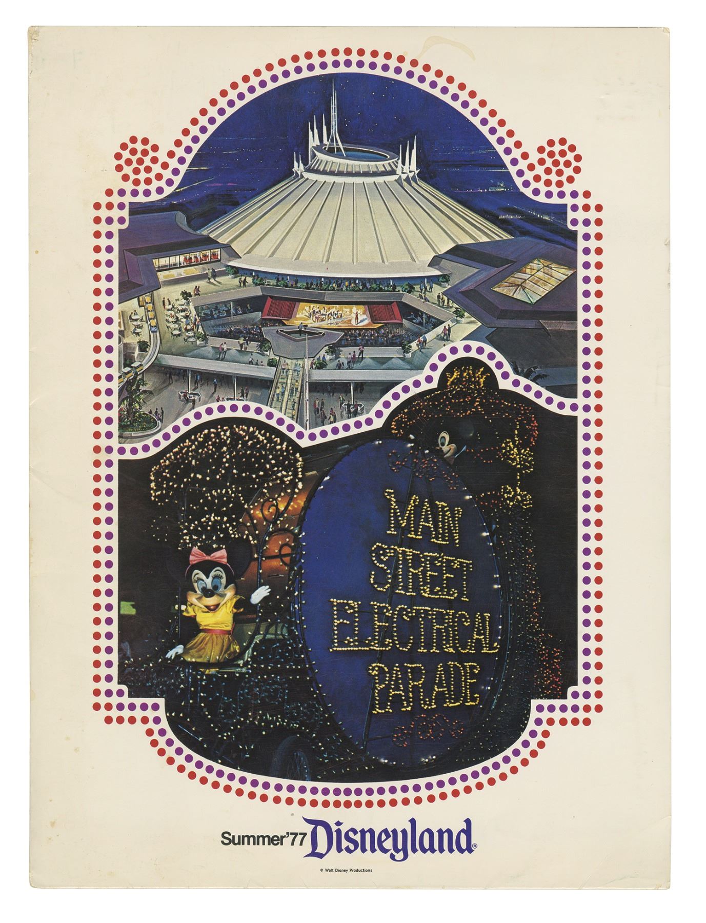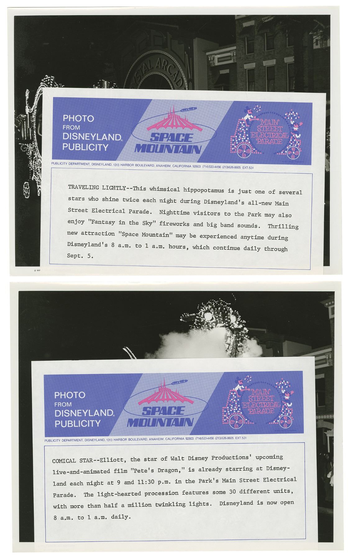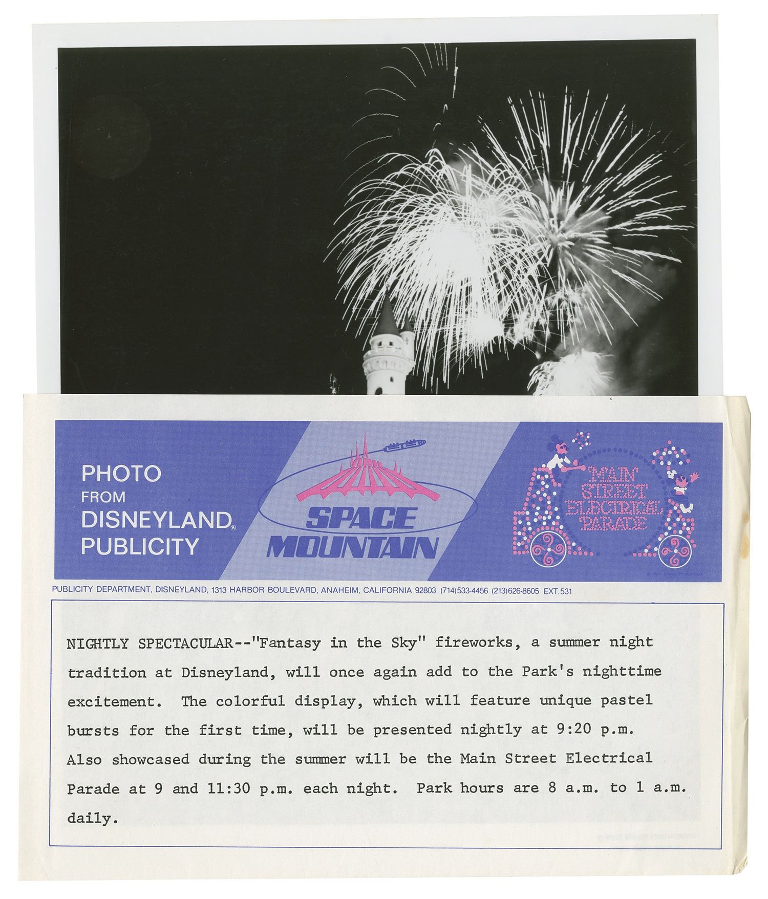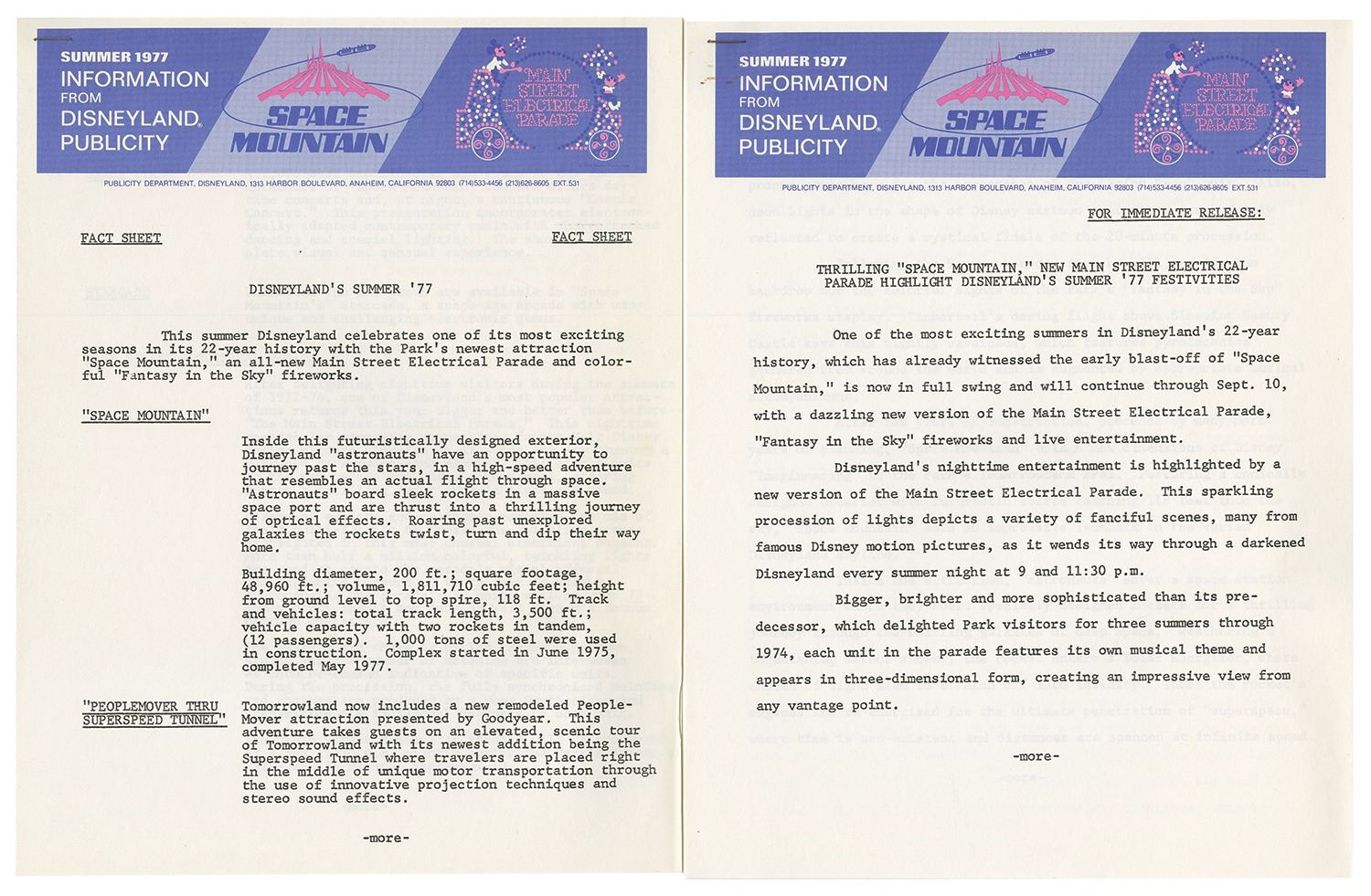 (Disneyland, 1977) A very rare press packet created for the Summer 1977 season of the Main Street Electrical Parade and the opening of Space Mountain. Included within are (5) photos of the attractions, and 8 sheets of press information relating to these fan favorite Disneyland experiences. The outer folder measures 12"x9" and the set is in very good condition with minor surface wear to the cover.