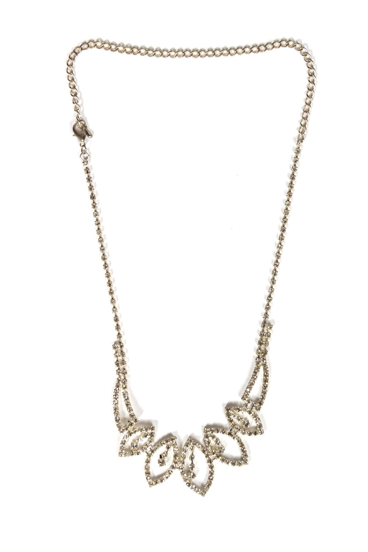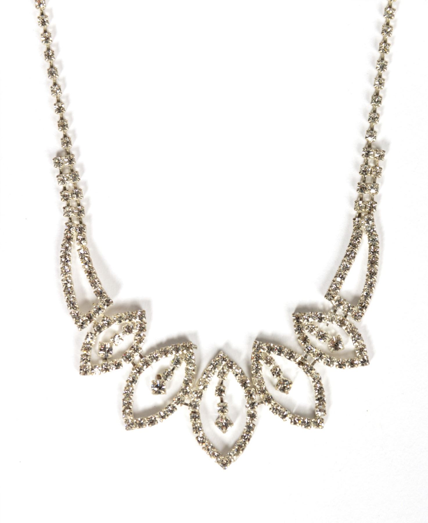 (ABC, c.1950s) A rare necklace prop that was used in the television show Bewitched. Following its use during production of the show, the necklace was kept and used by Elizabeth Montgomery until her untimely death in 1995. The necklace was used throughout the 8 seasons of the show by Samantha's wacky cousin Serena, as well as by Casey Rogers and several other actresses. The necklace features dozens of prong set Austrian crystal rhinestones in an oval pattern that sparkle in an array of rainbow colors. The necklace measures 11" long with it's 7" extra extension chain, so that it can be worn as a necklace or a choker. The condition is very good with minor wear from use.