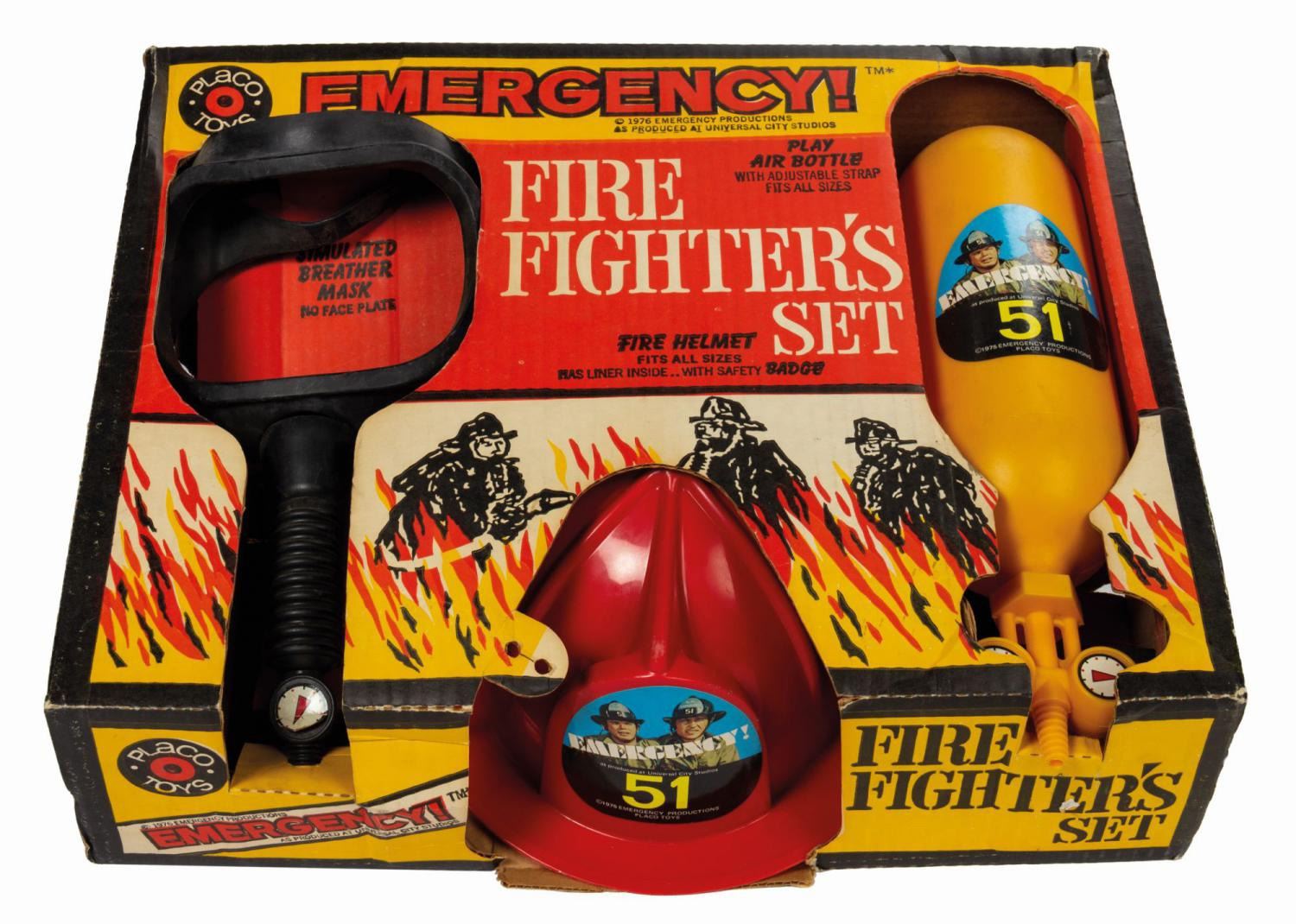 (Placo Toys, 1975) A rare vintage Emergency! Firefighter's Set manufactured by Placo Toys. The set includes a plastic fire helmet, simulated breather mask, and a plastic play air bottle. Measuring 13.5"x17" and 4.75" deep, the set is in very good condition. The original box was later sealed with packing tape on the reverse, with an added strip of cardboard down the center for support. Otherwise, it exhibits only minor stress from handling. The items in the set are unused with some surface wear from age.