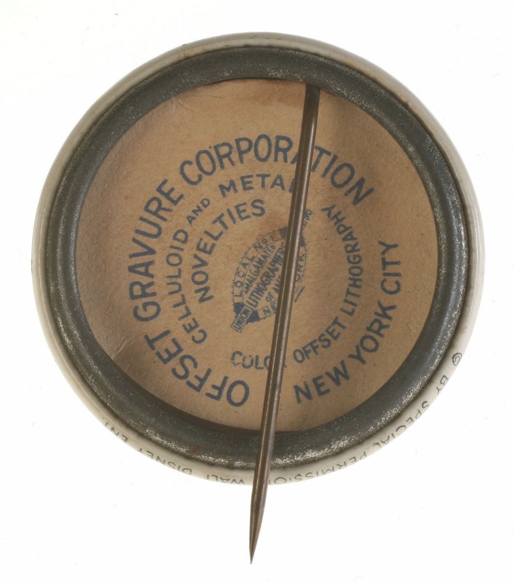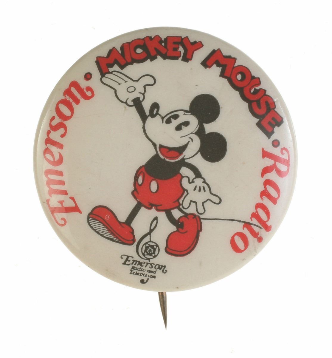 (Emerson, c.1934) Emerson Radio and Phonograph became a Disney Licensee in 1933. This rare promotional button measures 1.25" in diameter and still retains its paper manufacturing insert. In very good condition with minor wear.