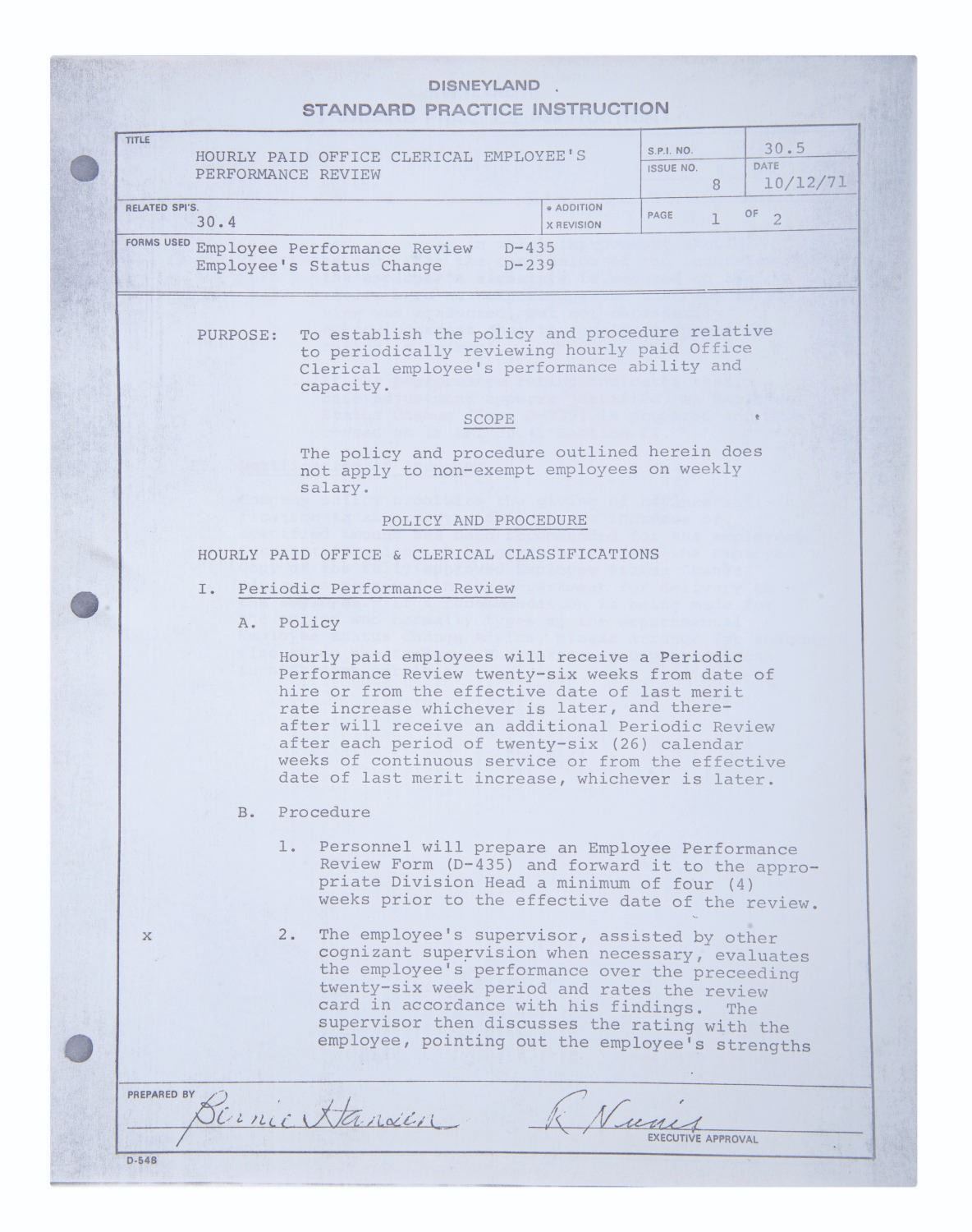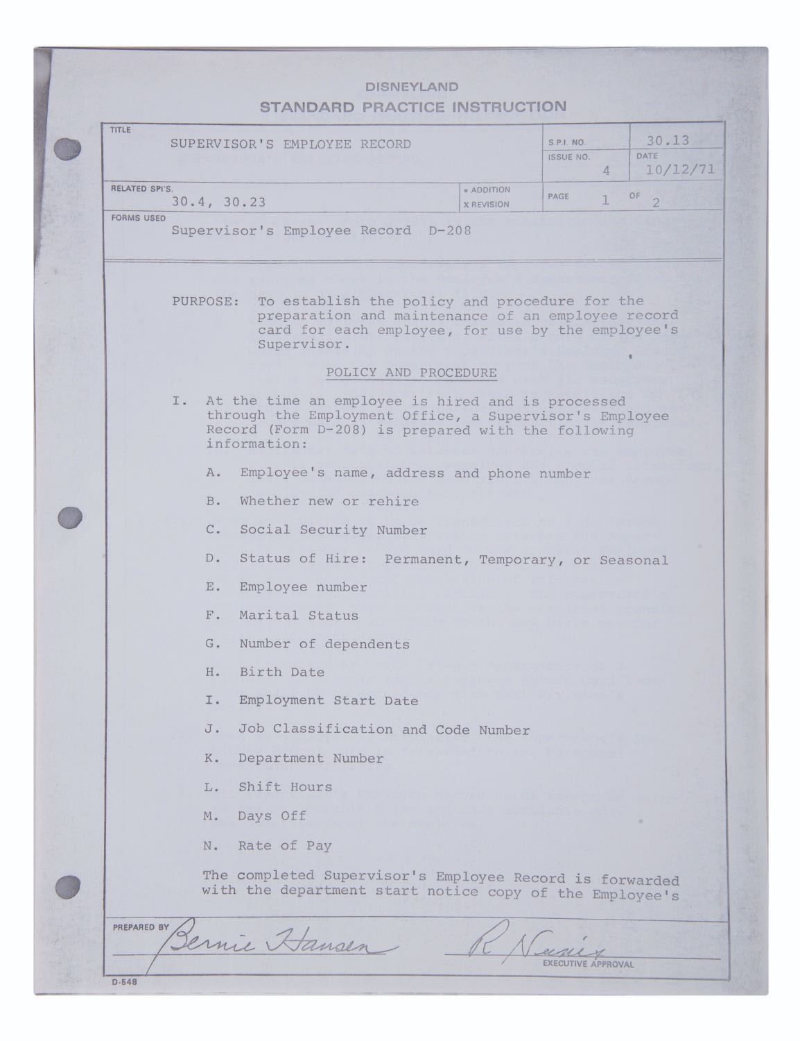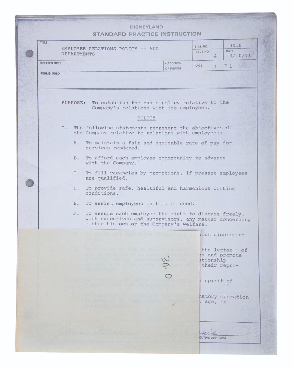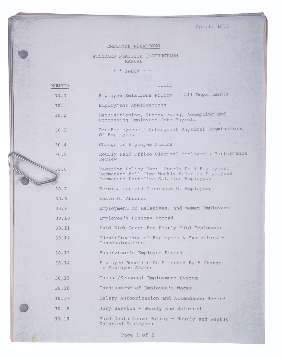 (Disneyland, 1975) A mimeograph copy of the first 15 sections of the Disneyland Employee Relations Standard Practice Instruction Manual. The document outlines the Park's policies for interviewing, hiring, vacation time and other Human Resource needs of employees. Measuring 8.5"x11," the document is in good condition with light wear from handling.