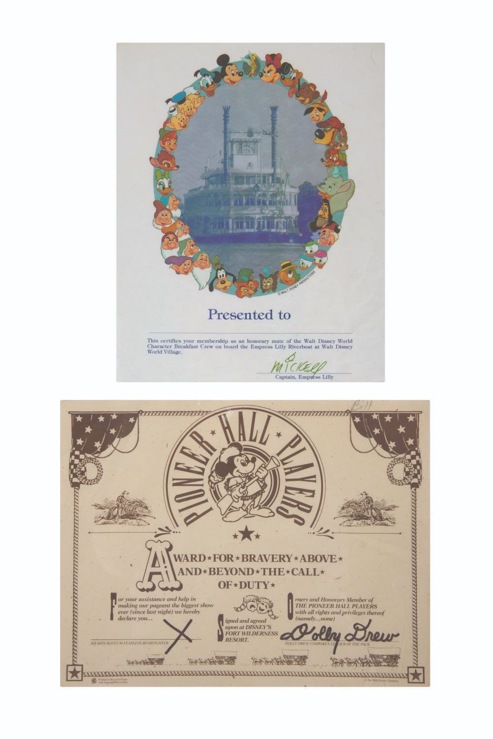 (Walt Disney World, 1990s-2000s) A pair Walt Disney World certificates including one from the Walt Disney World Breakfast Crew aboard the Empress Lilly and one from the Pioneer Players at the Fort Wilderness Resort. Measuring 10” x 8” and 8.5” x 11”, the certificates are in good overall condition with mild creases and slight wear to edges and corners.