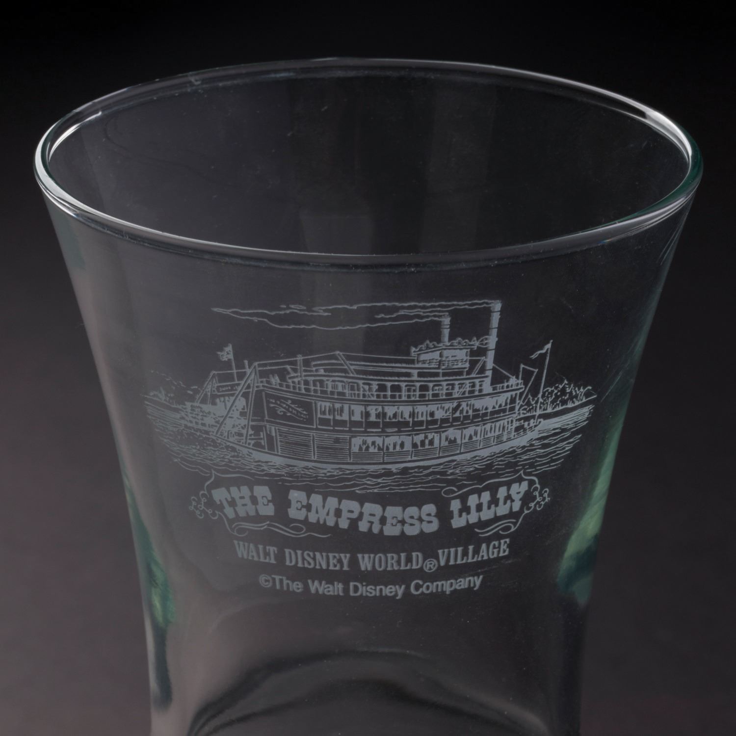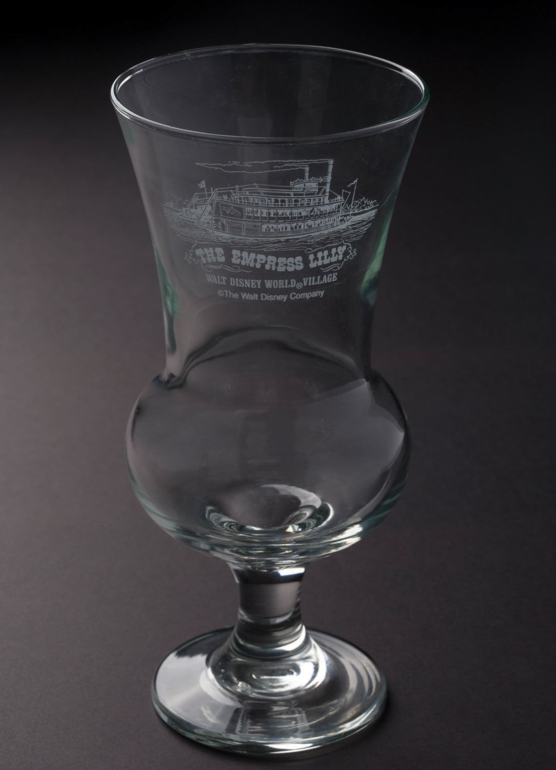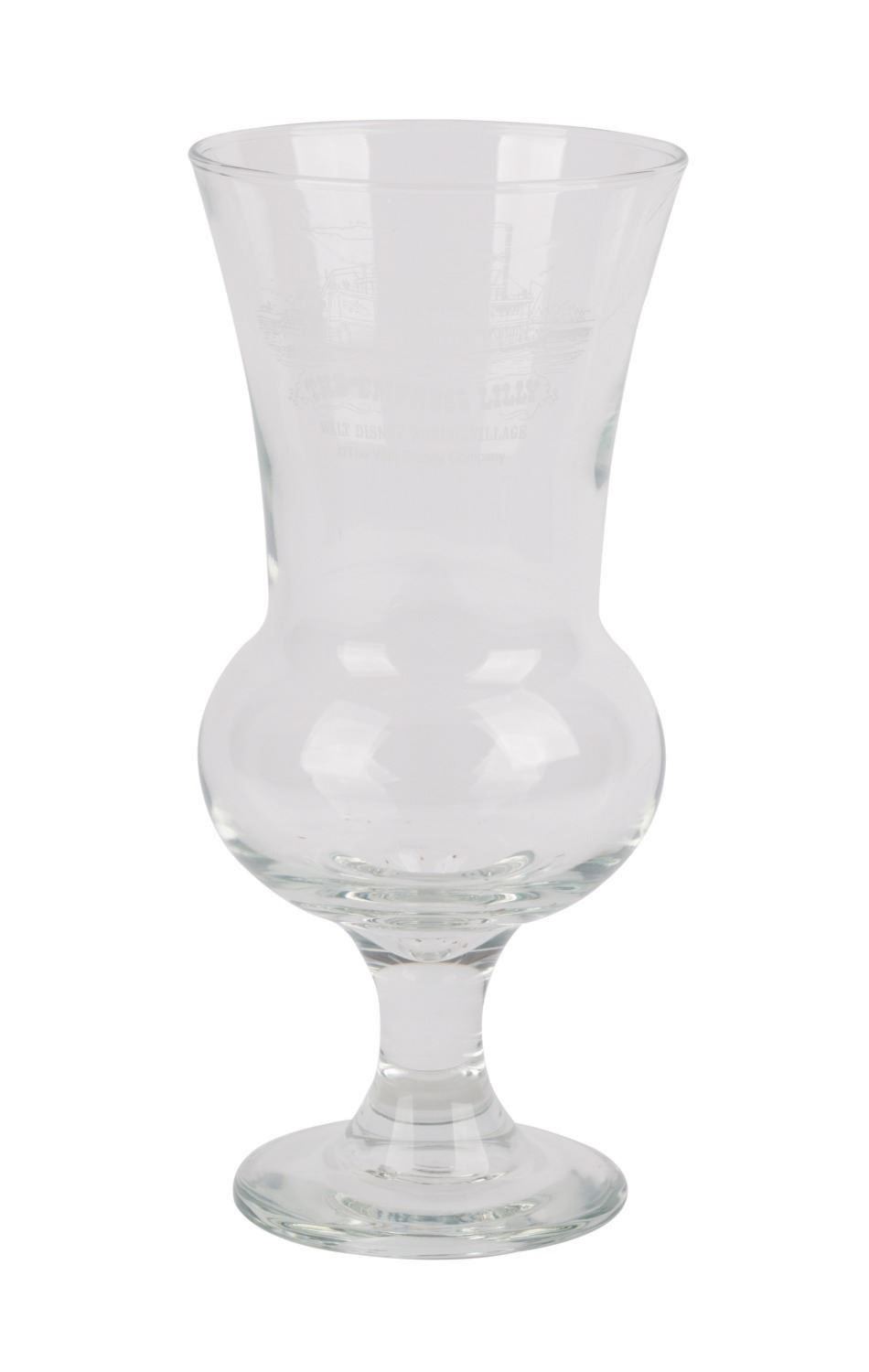 (Walt Disney World, 1980s) A souvenir glass of the Empress Lilly at Walt Disney World Village. The Empress Lilly paddle steamer was once boarded at Walt Disney World Village and offered guests the unique opportunity to enjoy breakfast, dinner, and live entertainment on Lake Buena Vista. Measuring 8.5" tall and 4" in diameter, the glass is in fine condition with Walt Disney Company Backstamp.