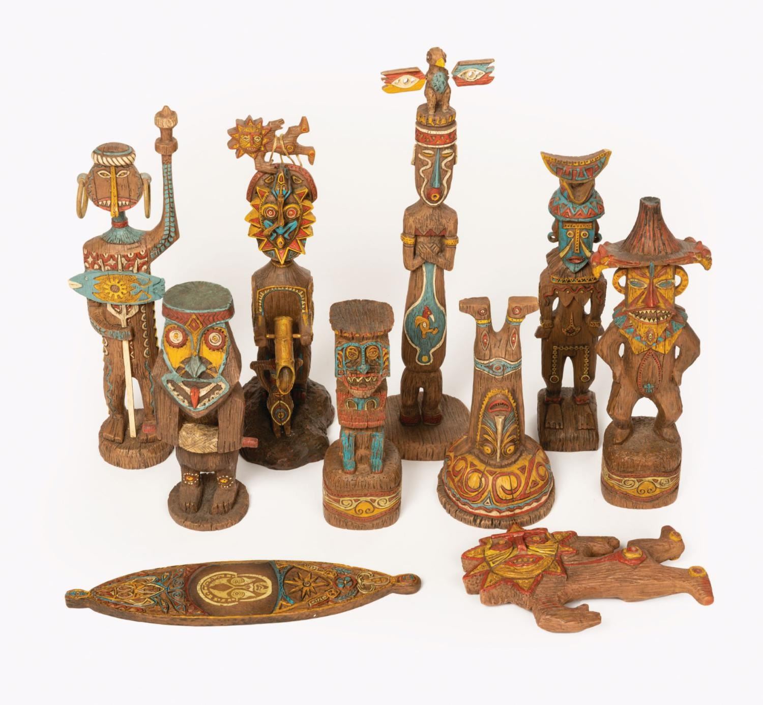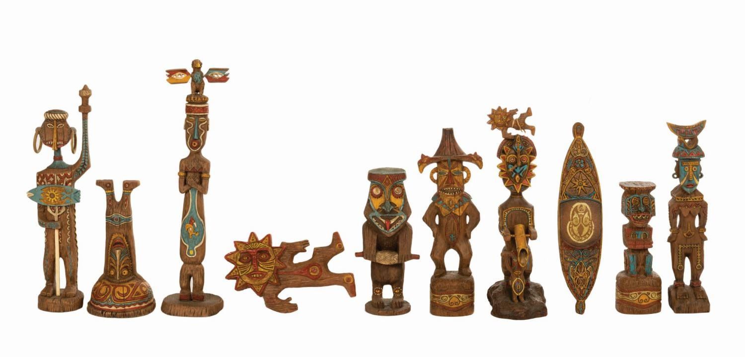 (Disneyland, 2005/08) The Enchanted Tiki Garden Gods boxed set 1 & 2 by Kevin Kidney & Jody Daily. In honor of Disneyland's 50th anniversary, these sets of Enchanted Tiki Garden figures were released, each limited to an edition of 1000 pieces. The complete collection of (10) resin and metal figures includes: Tangaroa-Ru, Ngendei, Uti, the "Playful Sun," Rongo, Pele, Maui, Koro, Hina Kuluua, and a Tiki Room Shield. Ranging in size from approximately 4.5" to 8" tall, each miniature is in fine condition with minimal wear. Both original boxes have been retained, showing minor wear including an impacted corner on the larger box.