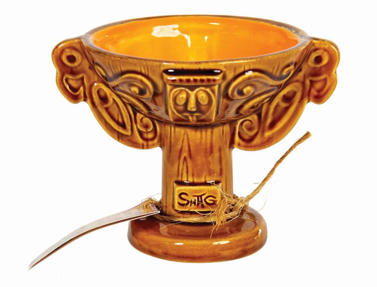 (Disneyland, 2003) A limited edition tiki goblet created by Shag to celebrate the 40th anniversary of the Enchanted Tiki Room. This gorgeous ceramic goblet features tiki imagery around the outside and a vibrant orange interior. A plaque is molded into one side of the stem, which reads, "Walt Disney's Enchanted Tiki Room 40th Anniversary." Part of a limited edition release, the goblet is hand-numbered 138/500 on its original tag and signed by Shag. Measuring 4.75" tall and 6.25" in diameter at the handles, the goblet is in very good condition with some crazing throughout.