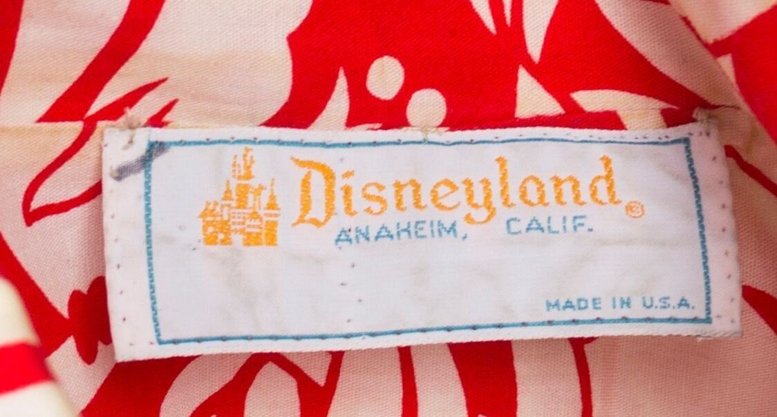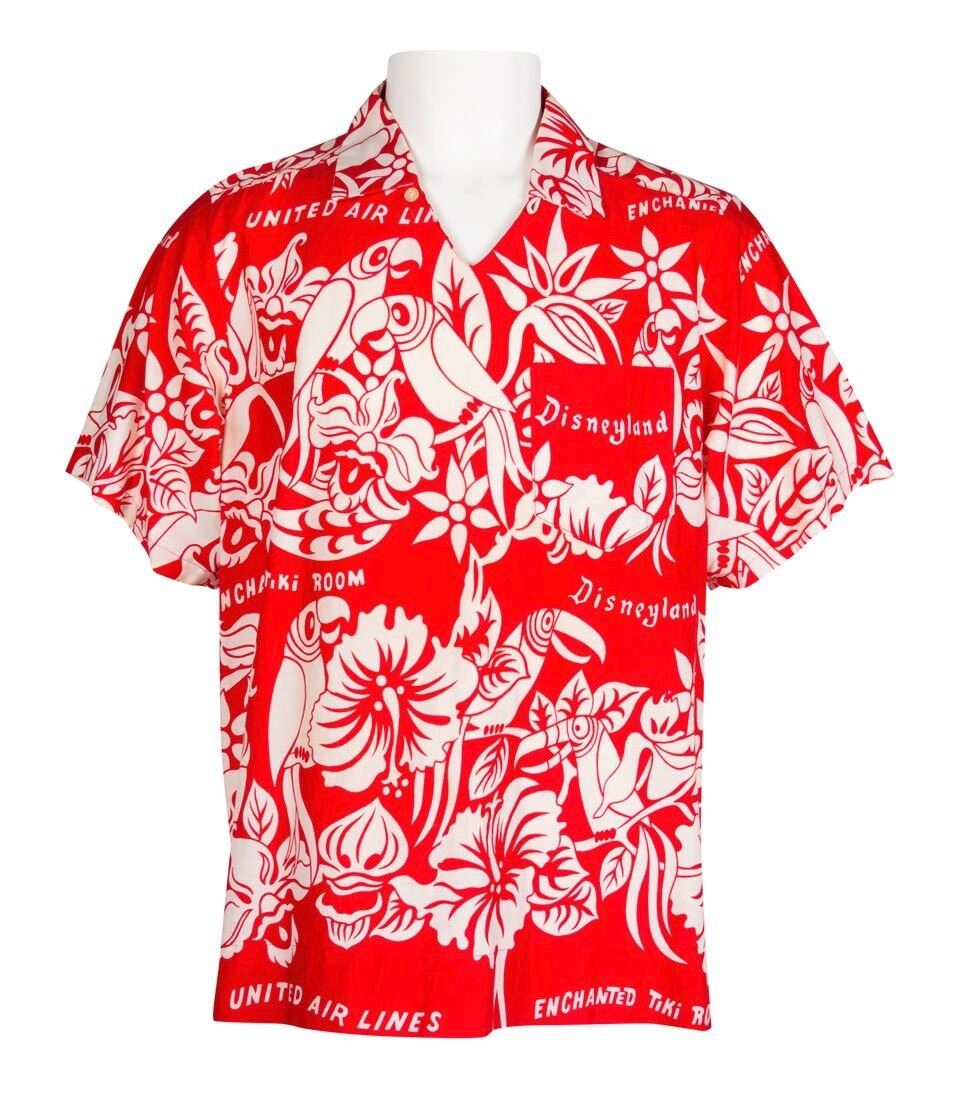 (Disneyland, 1960s) An extremely rare cast member shirt from Disneyland featuring an "Enchanted Tiki Room" pattern with the attraction's original sponsor, United Air Lines, mentioned throughout. This red shirt features imagery of various tiki birds and flowers in white, and still retains its original Disneyland fabric tag within the collar. This shirt was for male cast members while the same fabric pattern was used to create additional dresses for female cast members. No size is listed, but the shirt appears to be a men's XL. This item is in very good condition with little wear.