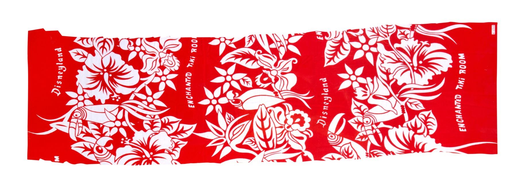 (Disneyland, c.1960s) A swatch of fabric featuring a pattern seen in the "Enchanted Tiki Room" cast member wardrobe of the 1960s. Interspersed throughout the tiki birds and flower imagery are the names "Disneyland" and "Enchanted Tiki Room". The fabric measures approximately 43"x12.5" and is in very good condition.