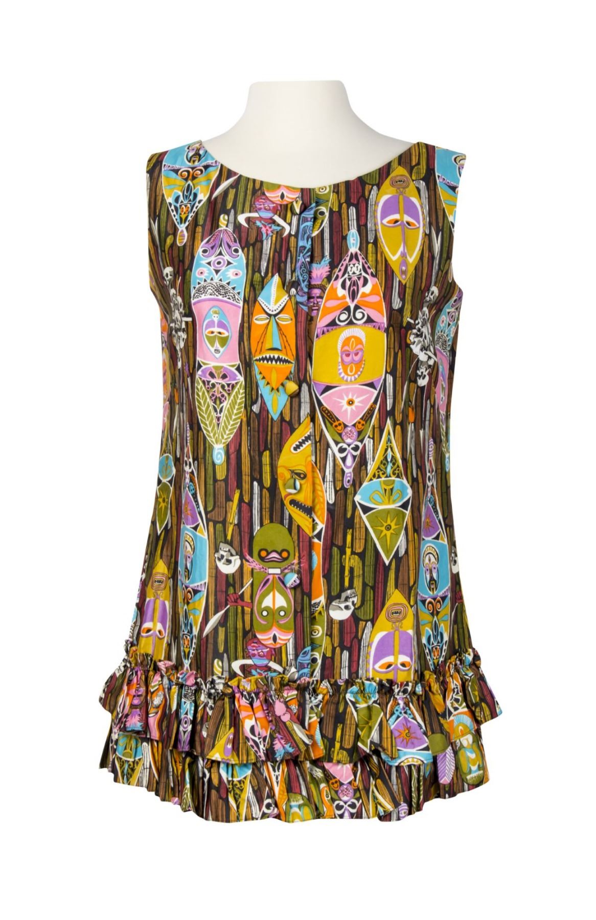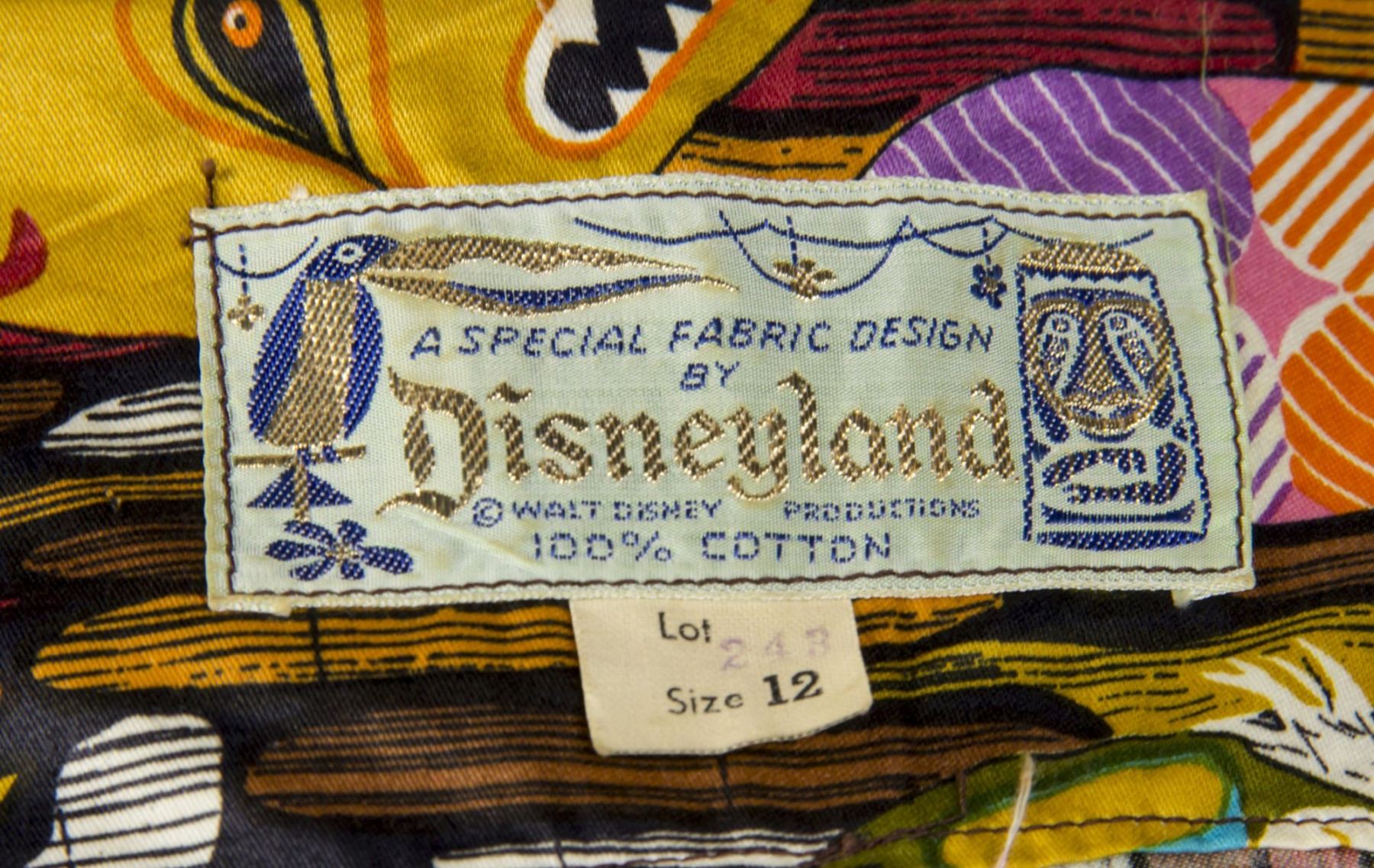 (Disneyland, 1960s) A vintage female Cast Member shirt, inspired by Rolly Crump's original designs, from the "Enchanted Tiki Room" at Disneyland. The shirt features a stylish tiki shield pattern in brown tones, and is marked as a Size 12. The condition is very good with minor wear, and the shirt still retains its Disneyland wardrobe label inside.