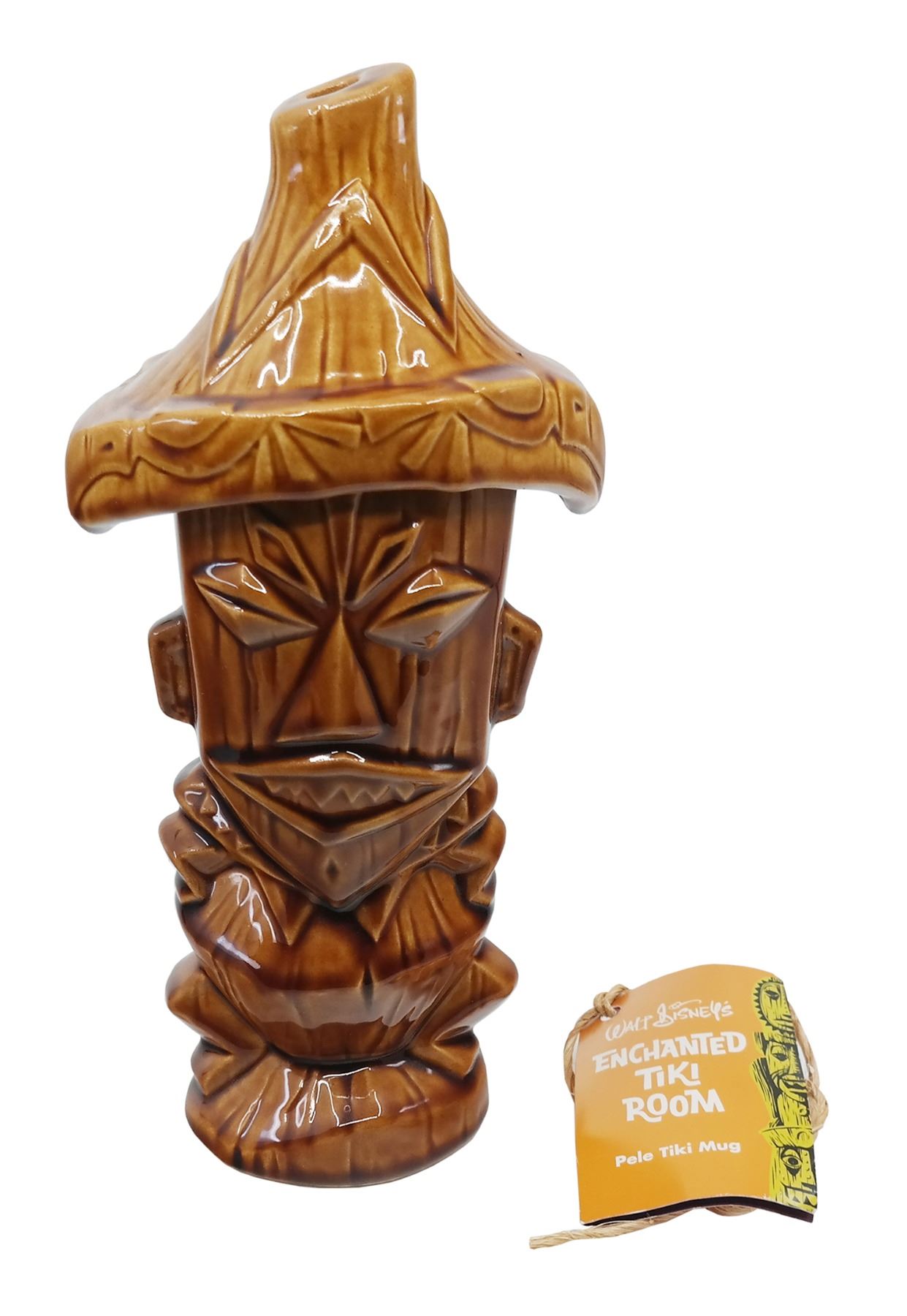 (Disneyland, 2005) A ceramic tiki mug created by Kevin Kidney and Jody Daily for Disneyland's 50th anniversary. The mug represents Pele from the Enchanted Tiki Room and has a removable lid with space to insert a straw. The mug measures 11" tall and is in very good condition with its original themed tag included.