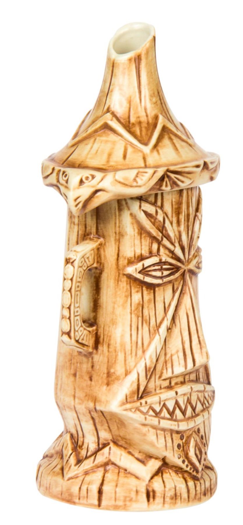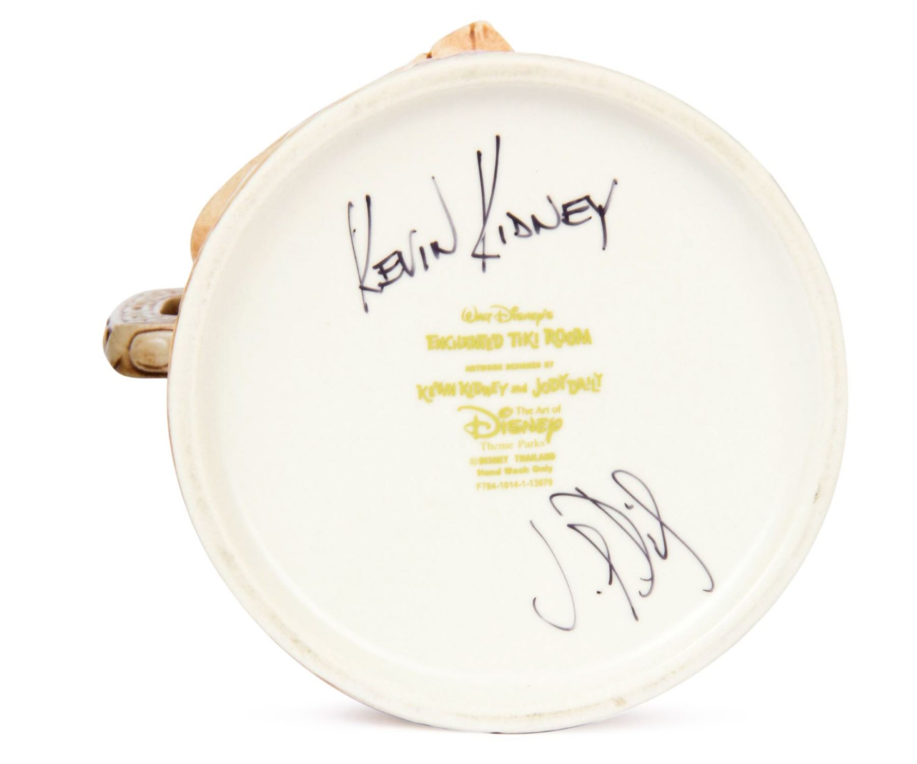 (Disneyland, 2005) A ceramic tiki mug created by Kevin Kidney and Jody Daily for Disneyland's 50th Anniversary celebrations. This mug, inspired by Rolly Crump's original designs, is modeled after Pele from the "Enchanted Tiki Room" and is signed on the base by both Kidney and Daily. The mug measures 10.5" tall and is in very good condition with its original tag.