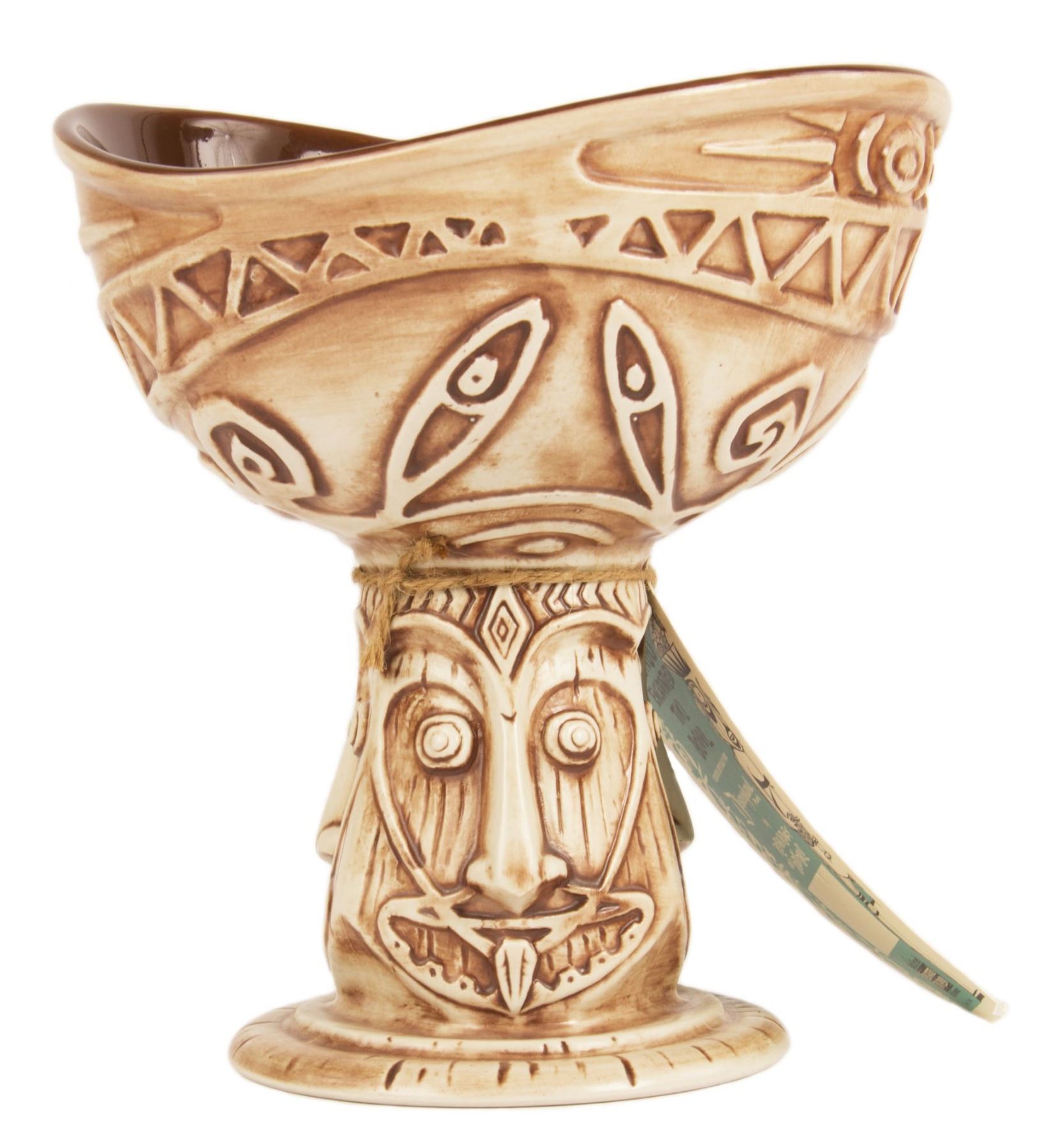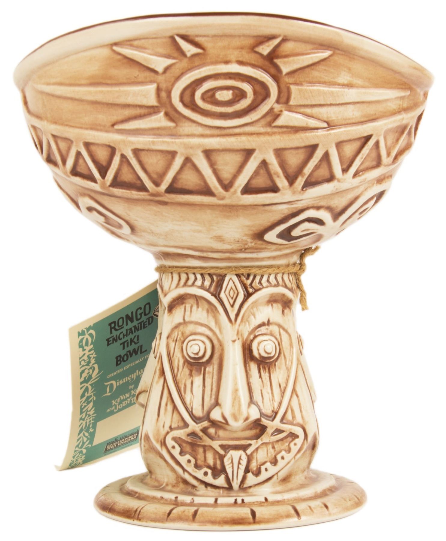 (Disneyland, 2013) A brown ceramic tiki bowl created by Kevin Kidney and Jody Daily for the Tiki Room's 50th anniversary celebration. This bowl, inspired by Imagineer Rolly Crump's original designs, is modeled after Rongo from the Enchanted Tiki Room. The bowl measures 8" tall and is in very good unused condition.