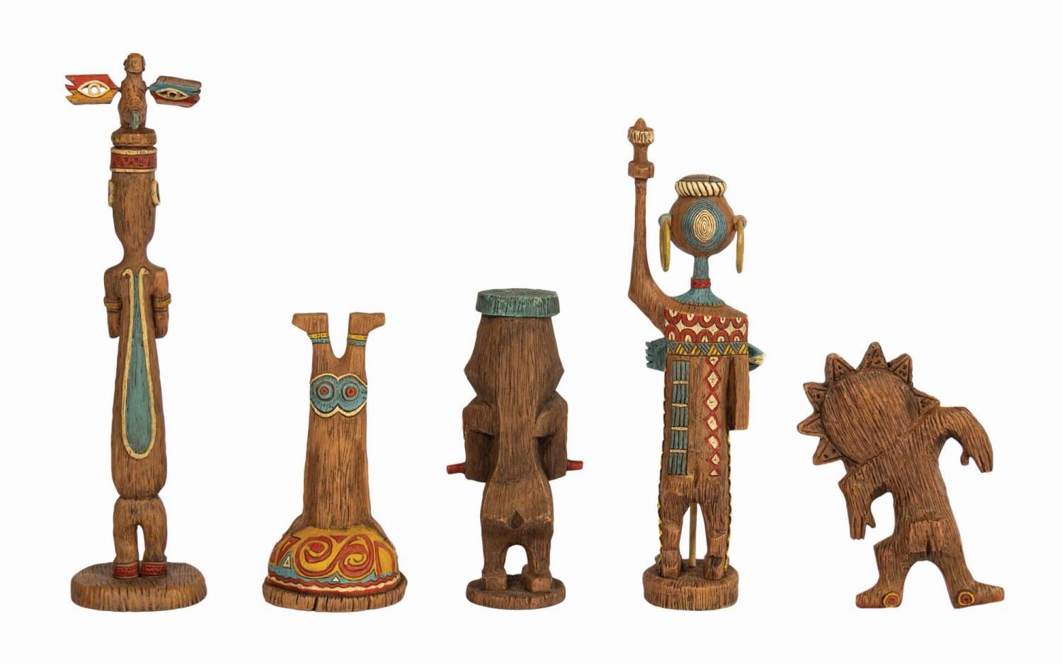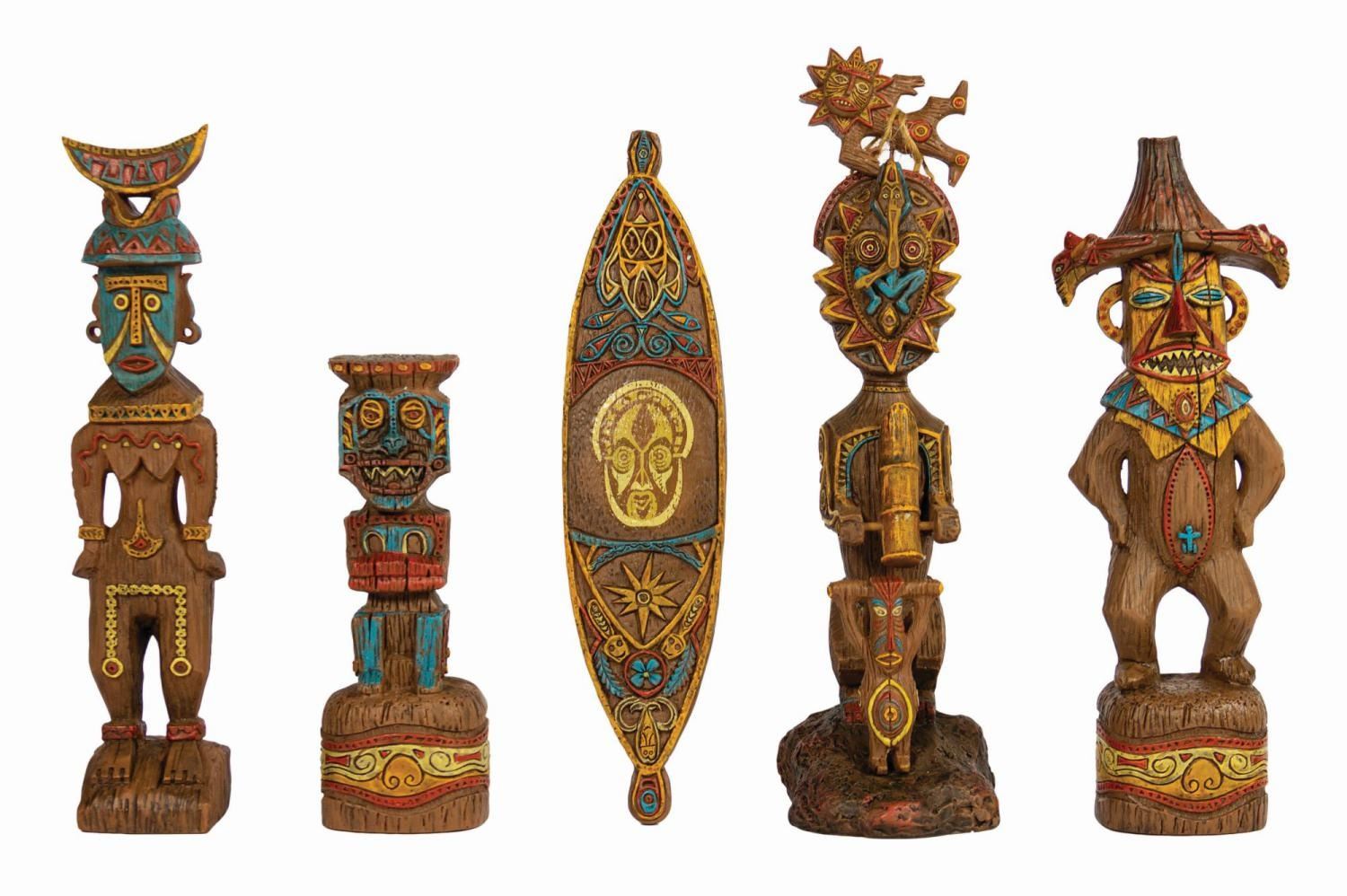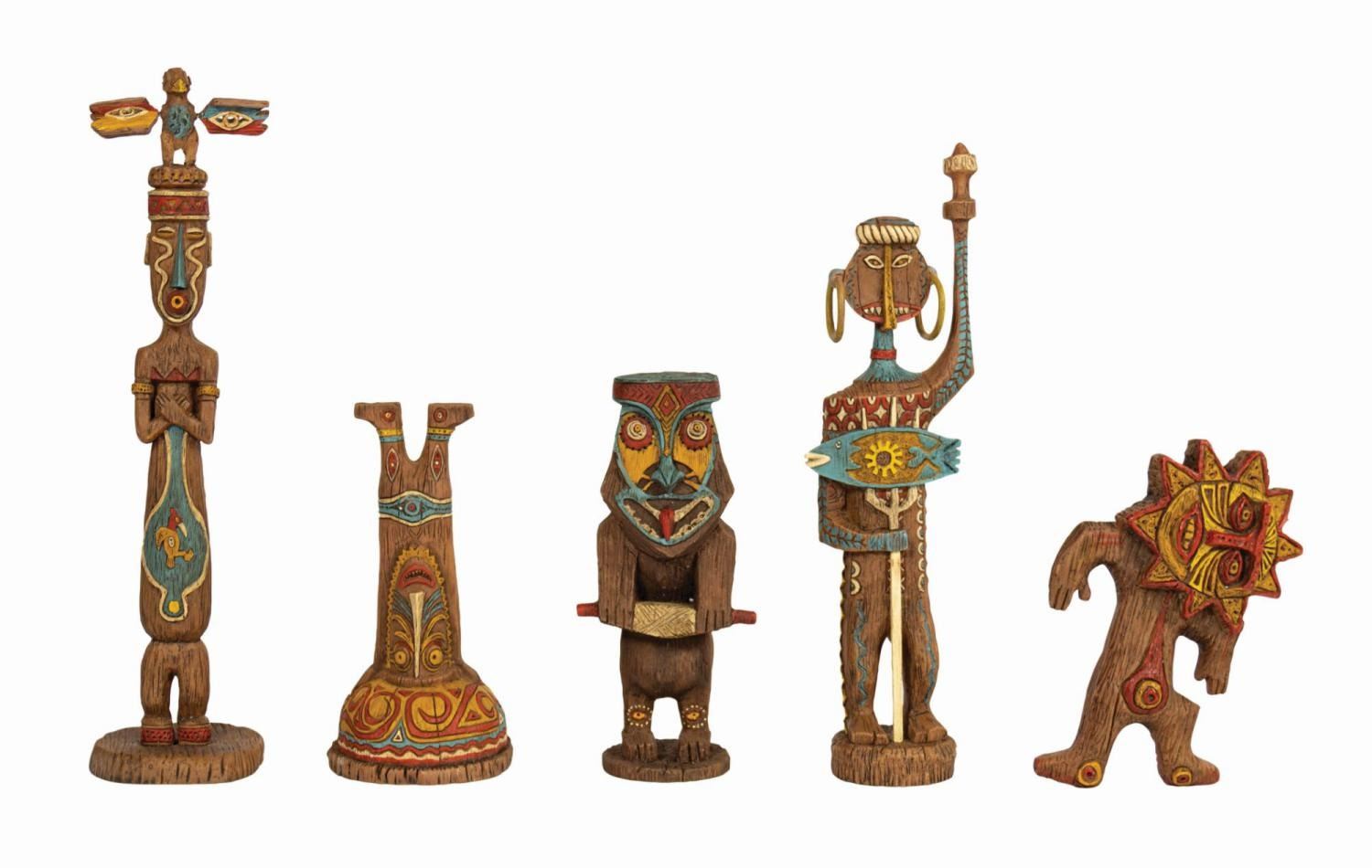 (Disneyland, 2005/2008) A pair of limited edition Enchanted Tiki Garden Gods sets by artists Kevin Kidney and Jody Daily. Constructed of cast resin intricately sculpted to appear as native artisan-carved wood, the sets depict the popular tiki gods from the attraction's pre-show. Both were produced in an edition of 1000 and each set retains its original box. Ranging in size from 4.75" tall to 9" tall, the figures are in very fine, as-new condition. The boxes measure 11.75"x12.5" and 5" deep and 10.75"x15" and 5.25" deep respectively and exhibit only minor wear. The upper right corner of the lid to Set 2's box is split. The sets include their original COAs.