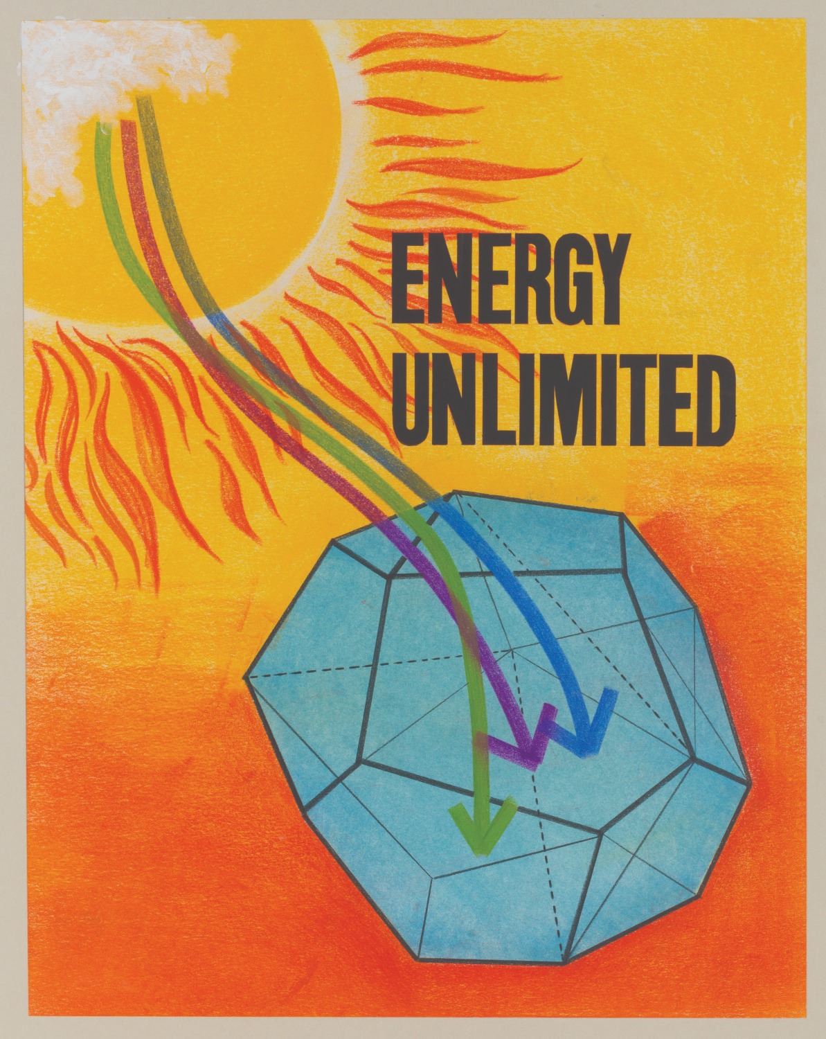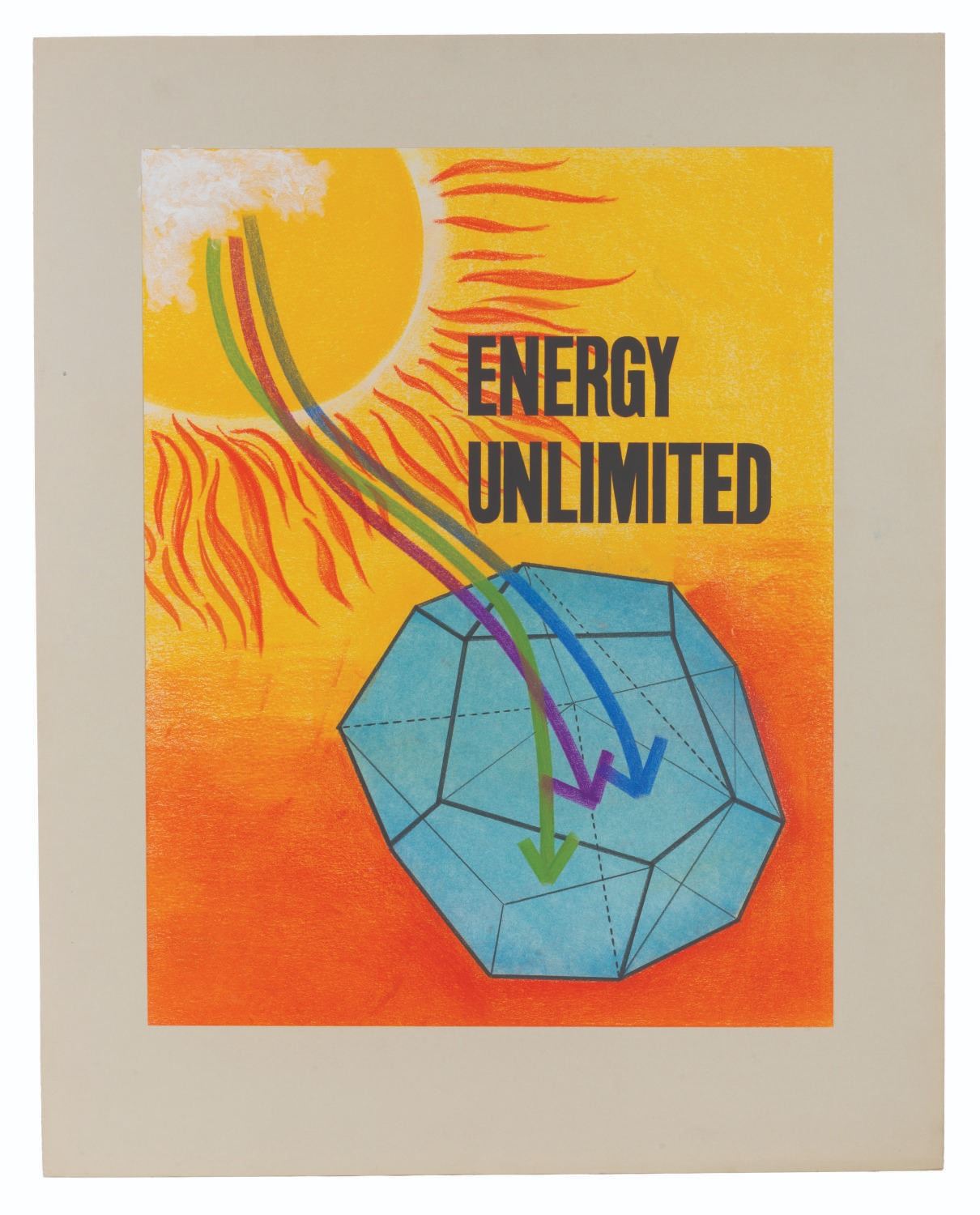 (L.W. Singer, 1959) An original concept design for the cover of a Disney illustrated educational book titled "Energy Unlimited." This concept was likely created for Disney's popular Tomorrowland Adventure series of books in 1959, which contain similar themes, titles, and imagery to this concept design. Accomplished in paint and conté crayon on paper, the illustration measures 14” x 18” and is mounted on 18.75” x 23.25" artist’s board. The artwork is in very good condition with minor edge wear to the board.