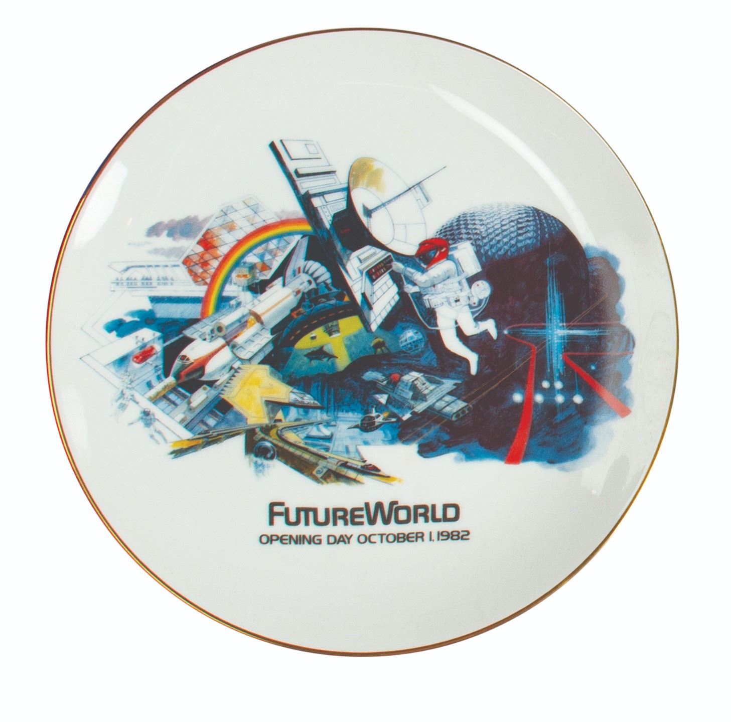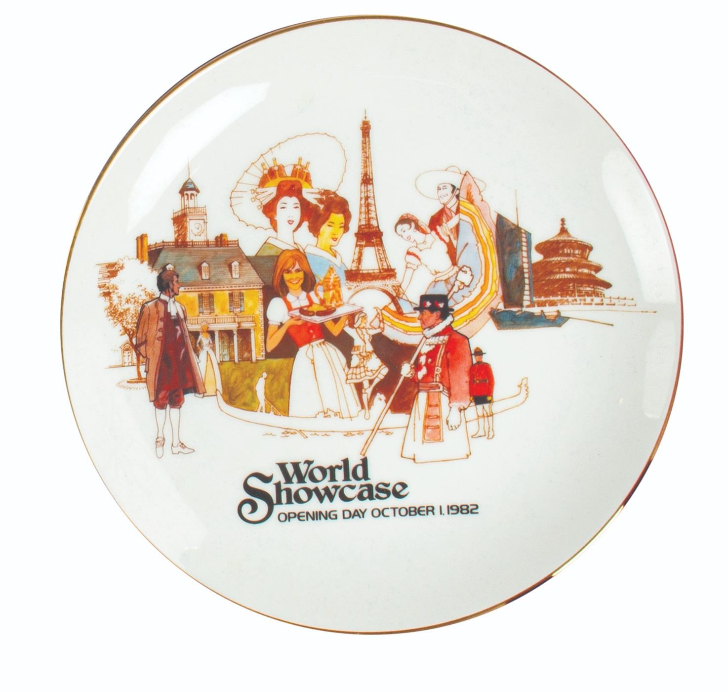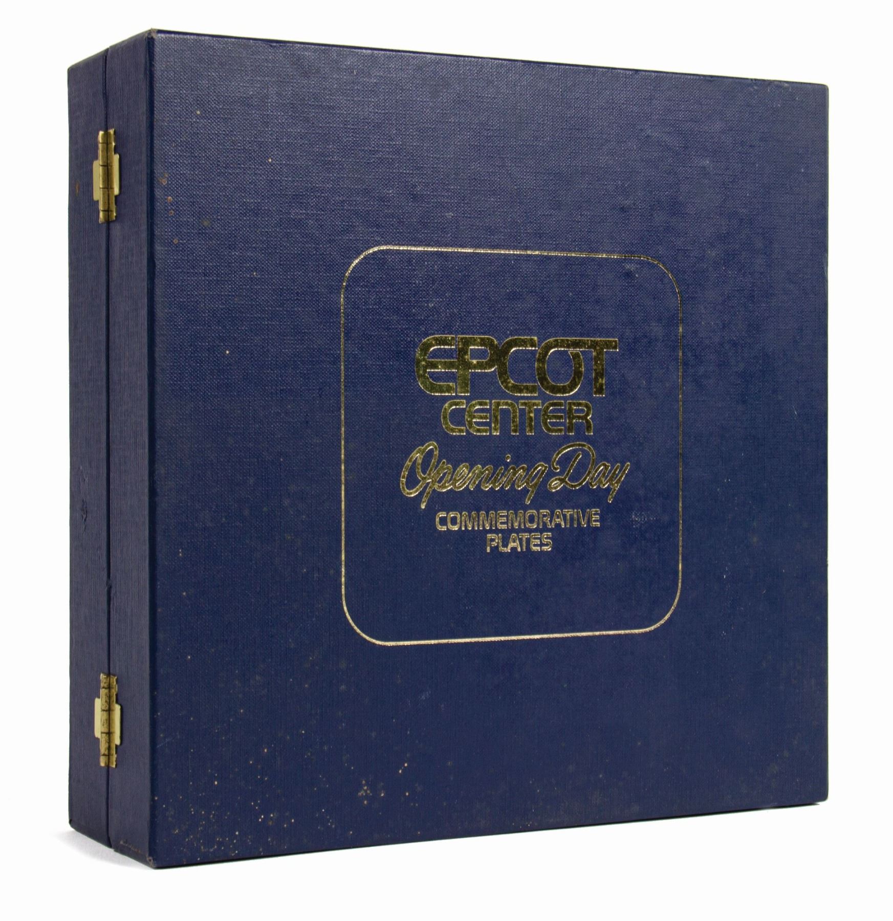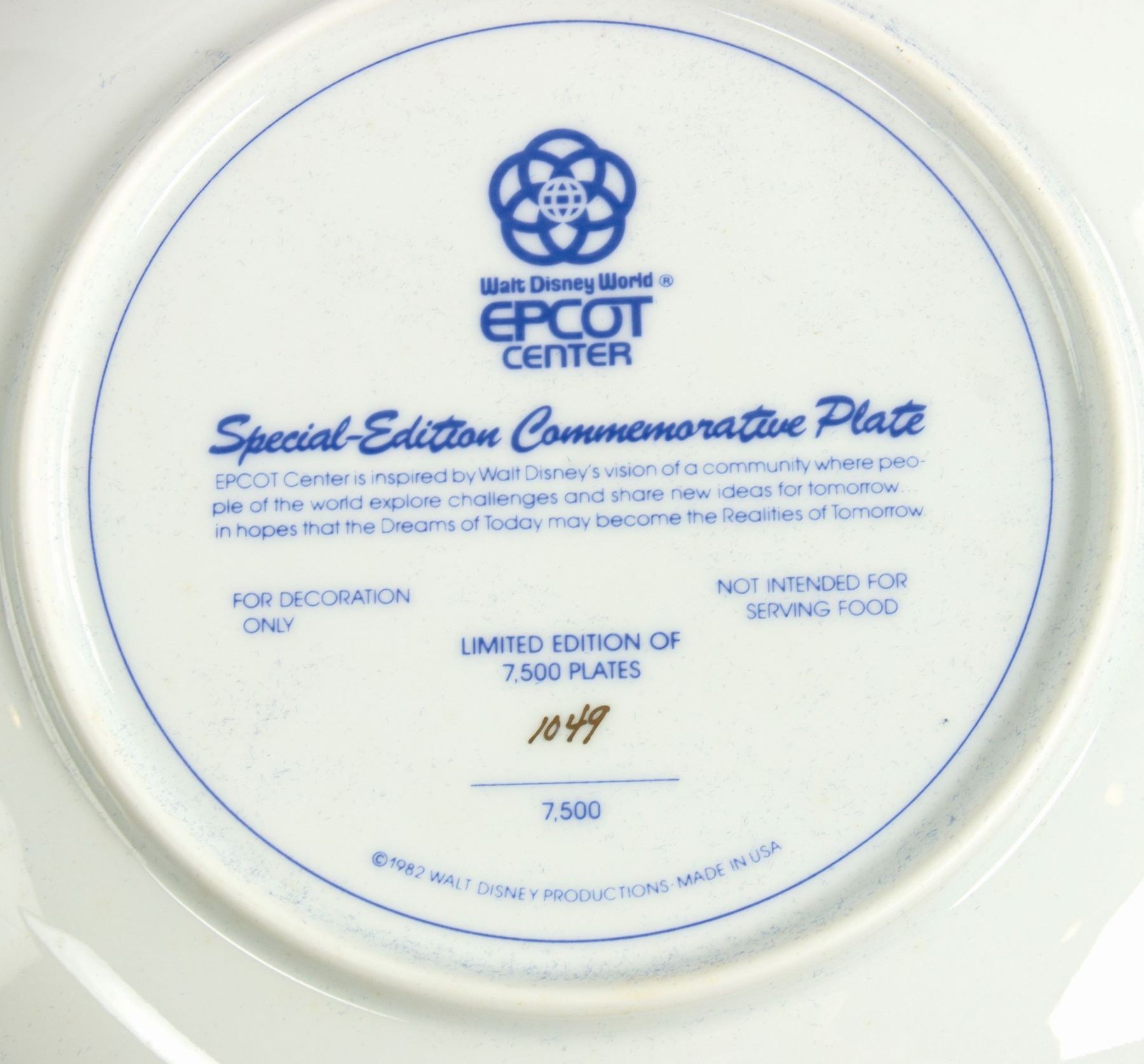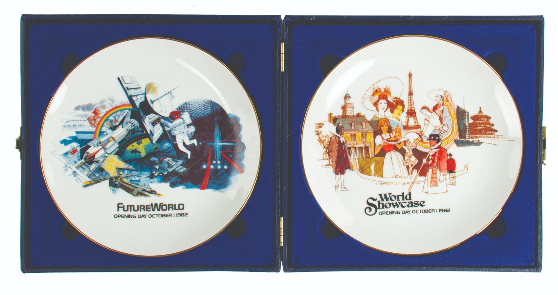 (Epcot, 1982) A limited edition boxed pair of plates created to commemorate the opening day of Epcot Center. The plates are marked as 1049/7500 and feature beautiful renderings for Future World and World Showcase. The plates measure 8.75" each and come in their original commemorative case. The condition is very good overall with minor surface wear.