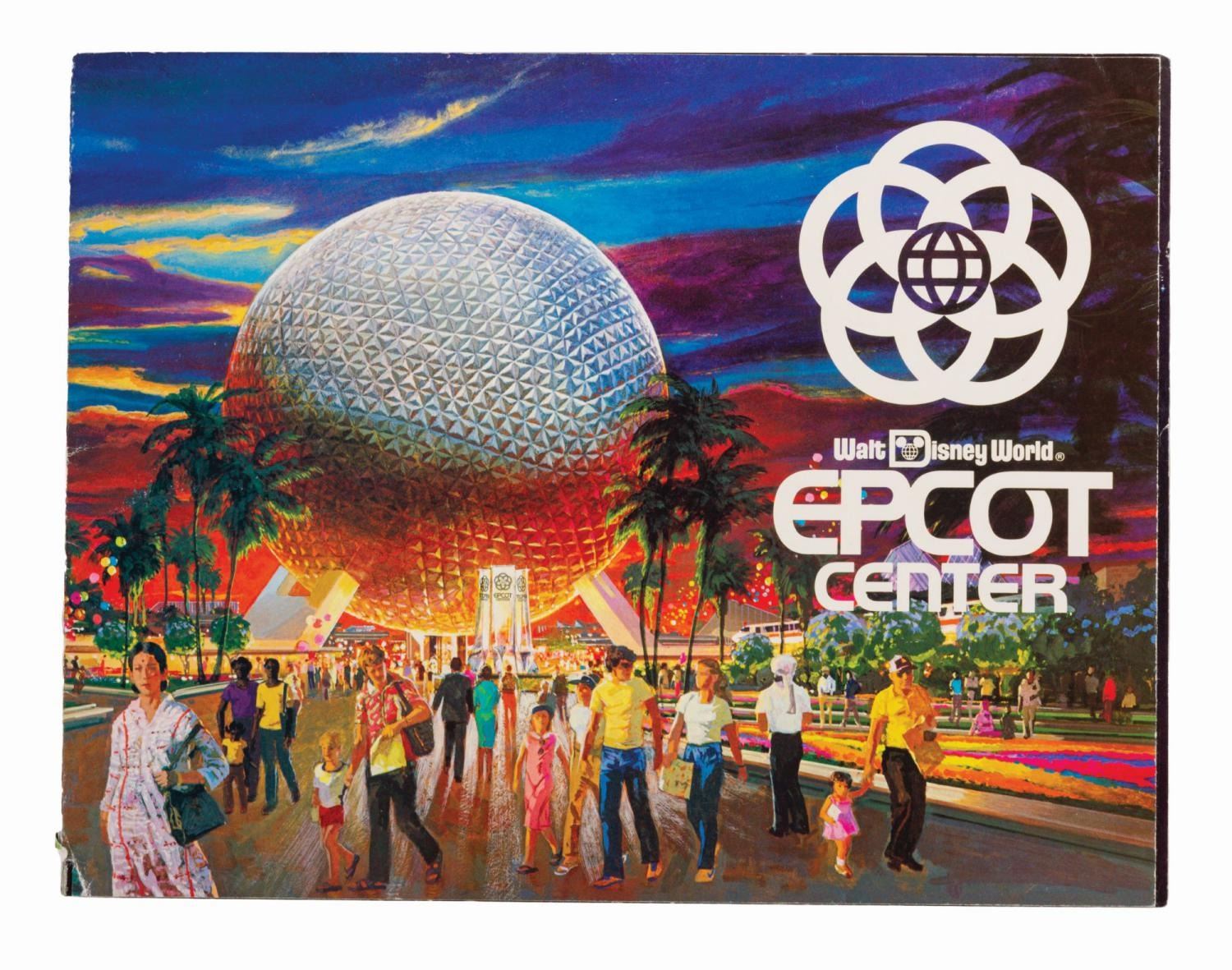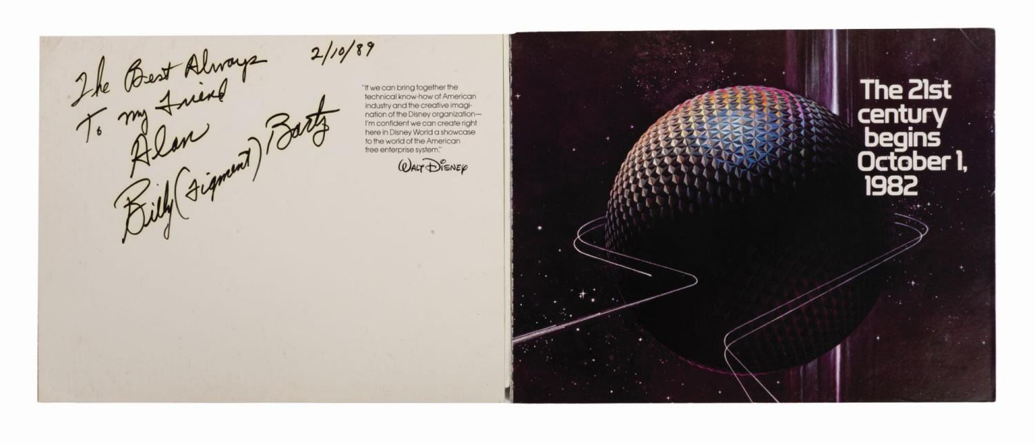 (Epcot, 1982) A 48-page Epcot Center souvenir guide introducing readers to Epcot's realms, attractions, and respective Participant sponsors. It is signed by late actor Billy Barty (known as the original voice of Figment, from Journey into Imagination). The autograph wishes "the best always" to for his friend Alan, dated "2/10/89." In addition, coming attractions Israel, Equatorial Africa, and Spain Pavilions are spotlighted. Measuring 8.5"x11", the Guide is in very good condition with minor wear, creases, and indentations to edges and pages throughout.