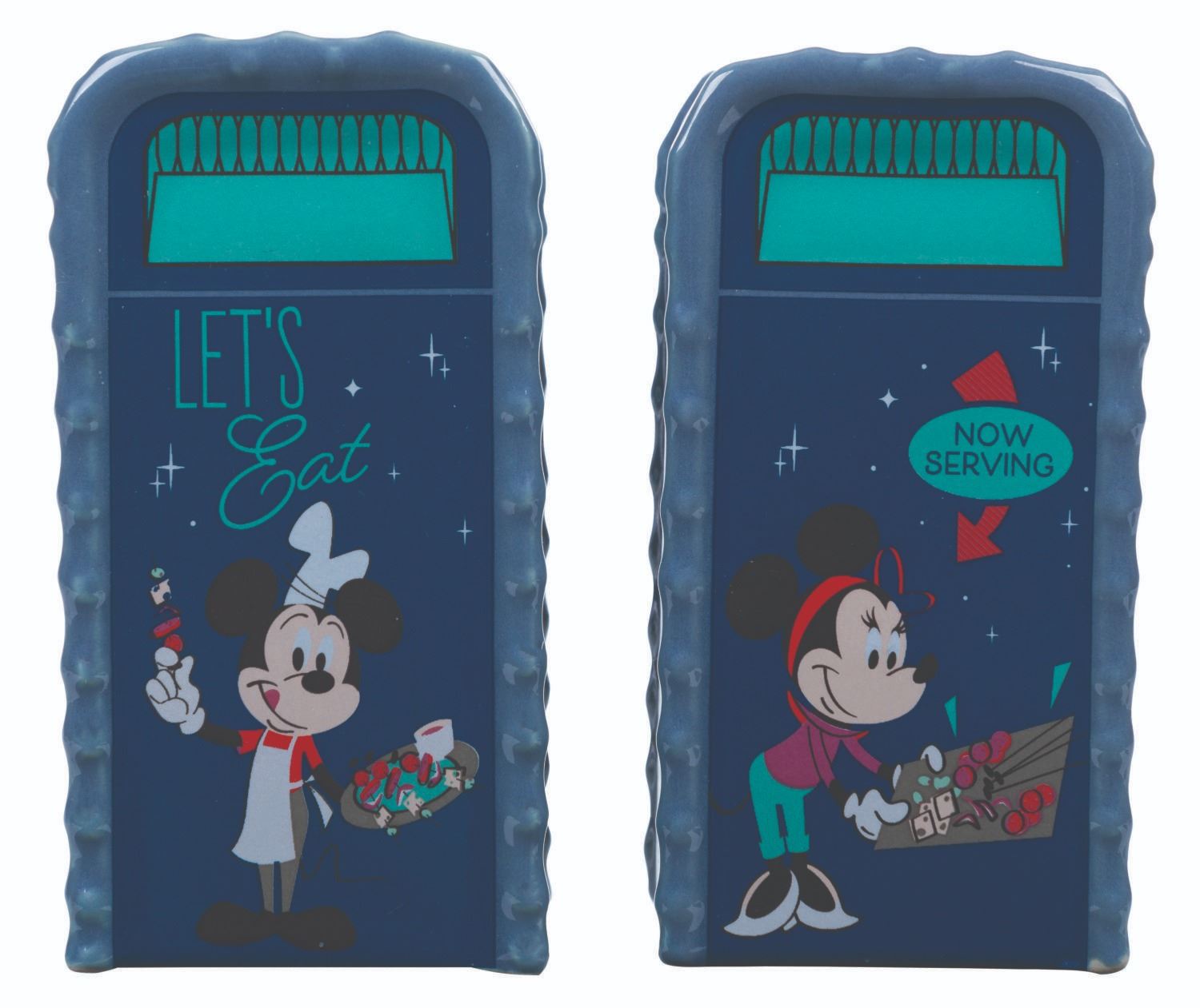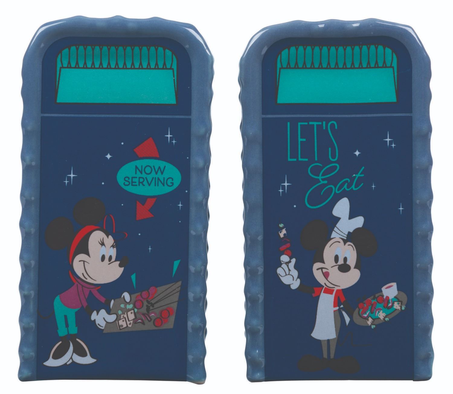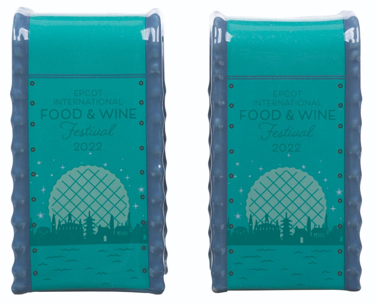 (Epcot, 2022) A set of souvenir salt and pepper shakers from the 2022 Epcot International Food & Wine Festival featuring Spaceship Earth, the World Showcase, and Mickey and Minnie Mouse. Measuring 2” x 3.75” each, the adorable shakers are in fine condition with their original tags and plugs intact.