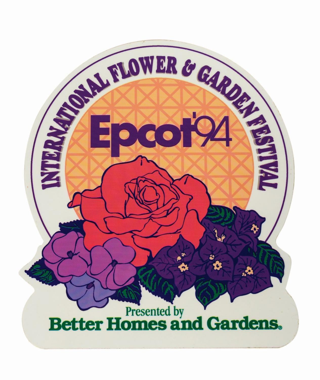 (Epcot, 1994) A small sign created for the International Flower & Garden Festival at Epcot. Mounted to acrylic, the printed sign features the inaugural year of the popular festival celebrating Disney-style gardens and topiaries, which was presented by Better Homes and Gardens. Measuring 8.5"x7.5", the sign is in very good condition with some minor surface scuffs.