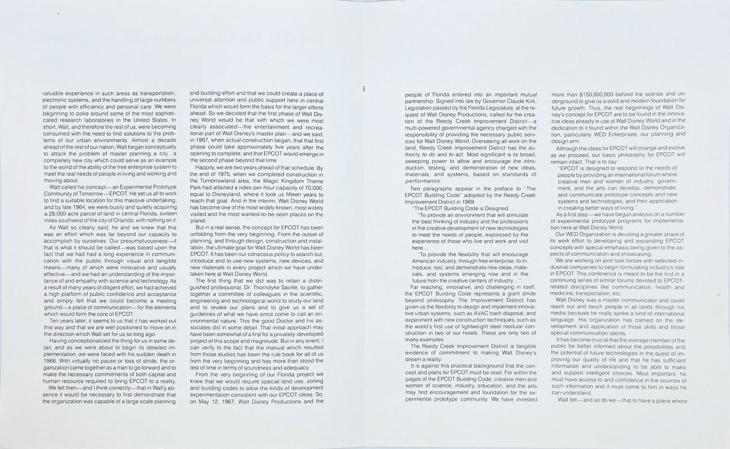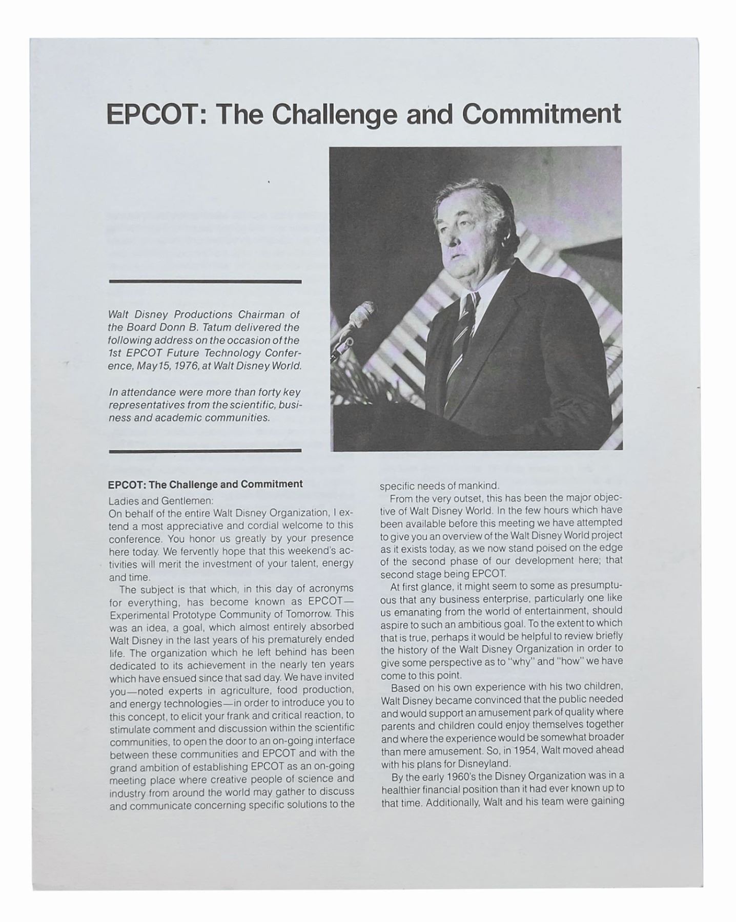 (Walt Disney World, 1976) A rare booklet titled, "EPCOT: The Challenge and Commitment." This booklet contains an address delivered by Walt Disney Productions Chairman of the Board Donn B. Tatum concerning the development of Epcot. The address was given at the 1st Epcot Future Technology Conference, and the booklet measures 10.25"x8.5". The condition is very good with minor wear from use.
