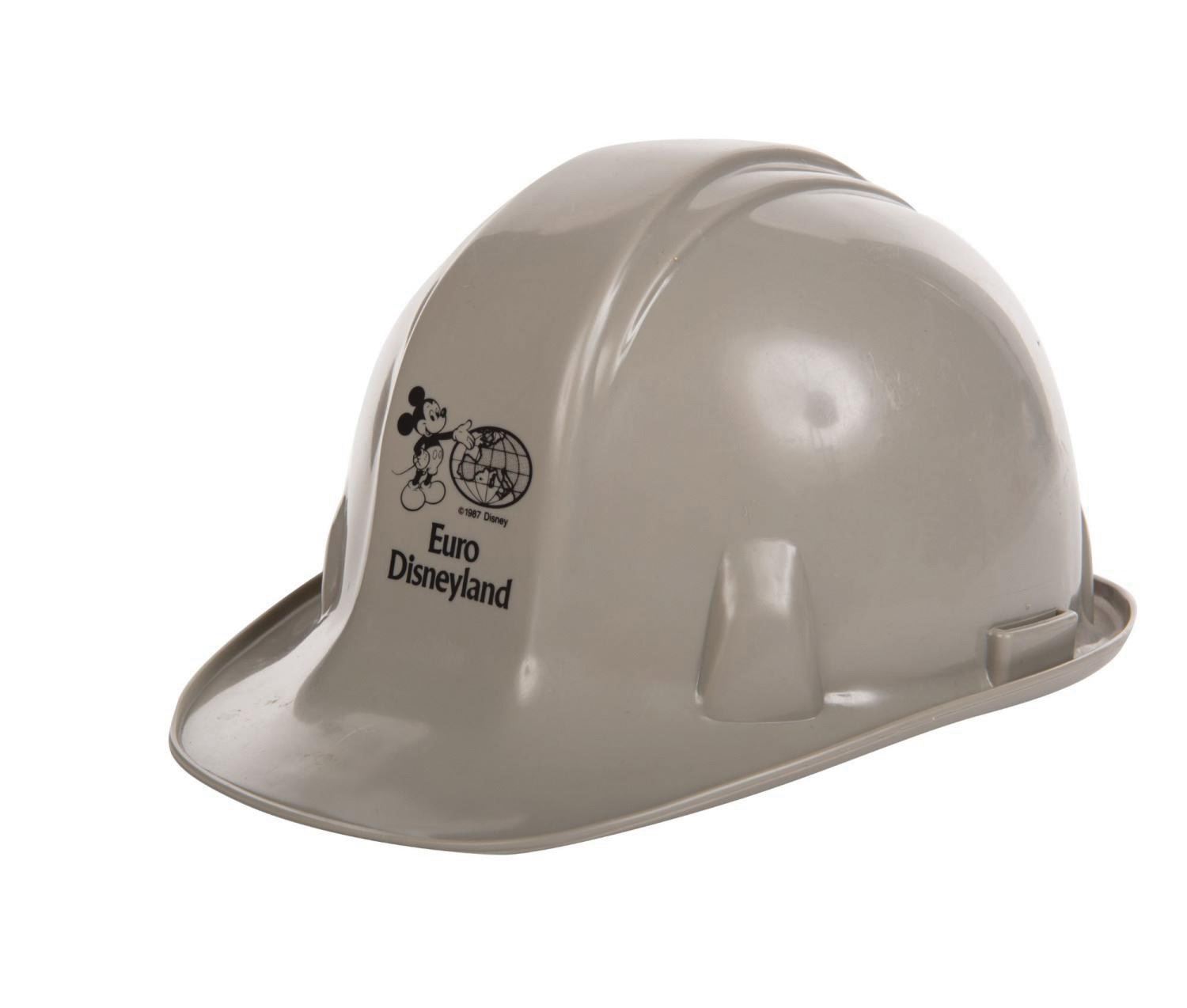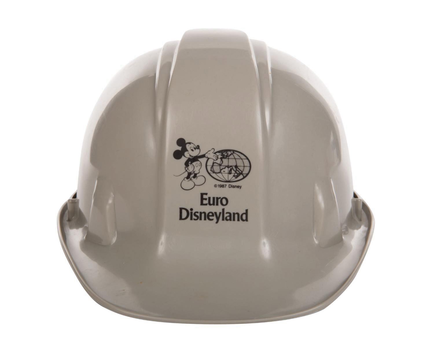 (Disneyland Paris, 1987) A construction hard hat used during the construction of Euro Disneyland. The grey hard plastic hat features a screen printed logo with Mickey presenting a map of Continental Europe, and the interior contains an adjustable plastic suspension with a leather sweatband. Based on usage of Euro Disneyland and copyright date, this hard hat would have been worn to job sites in the earliest construction of what is now known as Disneyland Paris. The piece measures 6"x11.5" and 3.5" deep with included suspension. The piece is in very good condition with only minor wear from intended use.