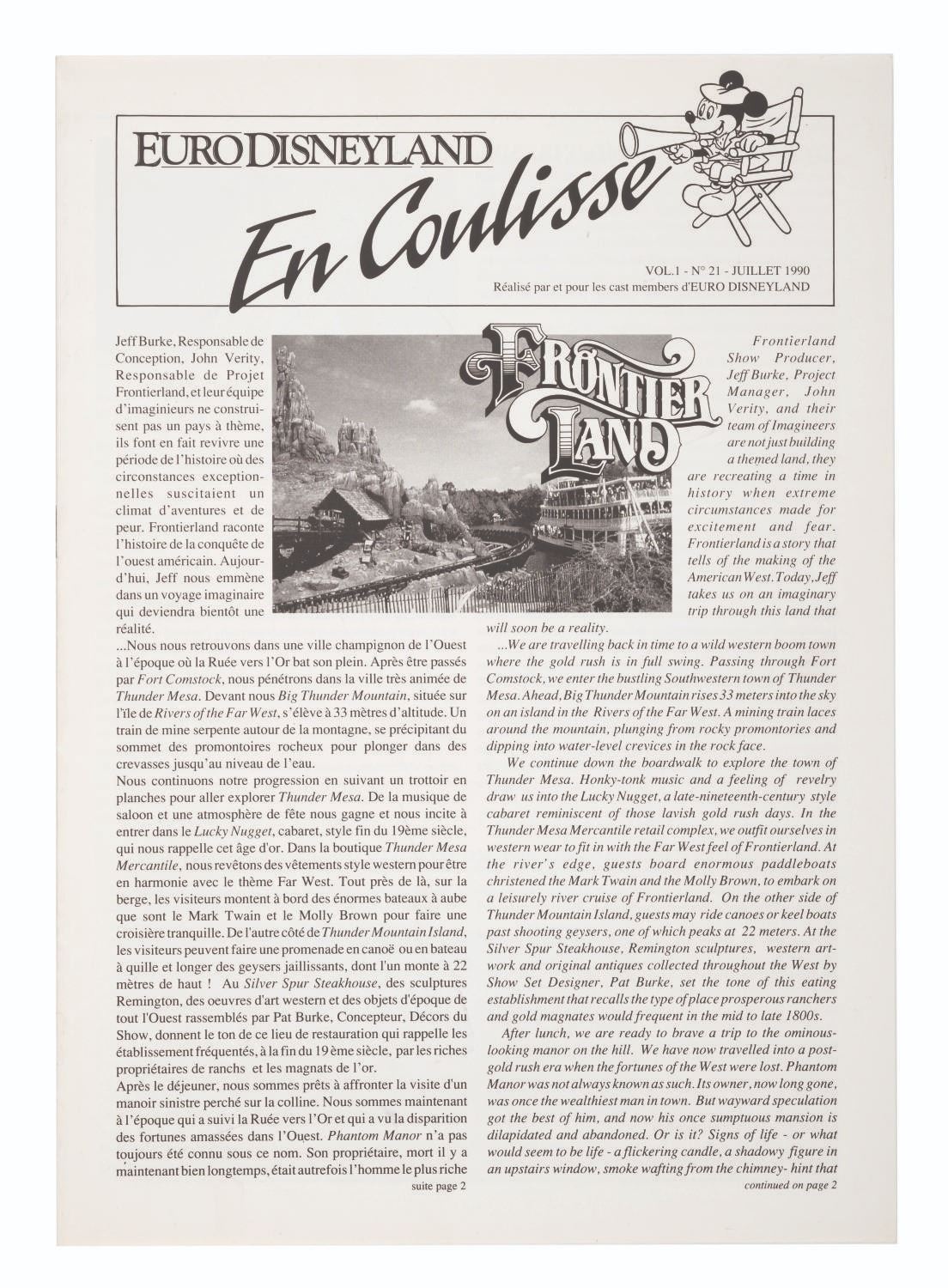 (Euro Disneyland, 1987-90) A collection of three early Euro Disneyland brochures prepared for Cast Members and local area residents of France. The early French-text prospectus brochure highlights the future attractions and adventures awaiting guests of Euro Disneyland, including New Orleans Square (which was unbuilt). The Euro Disneyland "Behind the Scenes" newsletters introduce the Cast, events, and coming attractions of the Resort. Measuring 8.5"x11", the brochures are used, but in fine condition overall with minor wear to their spines.
