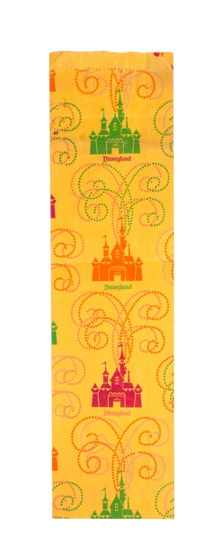 (Disneyland, c.1970s) An extra-long shopping bag from Disneyland featuring a fireworks pattern with Sleeping Beauty Castle. These longer style of bags are much more scarce than the standard souvenir bags, with this example measuring 18.5"x5". The condition is good with a few horizontal fold marks and some small push-pin holes.