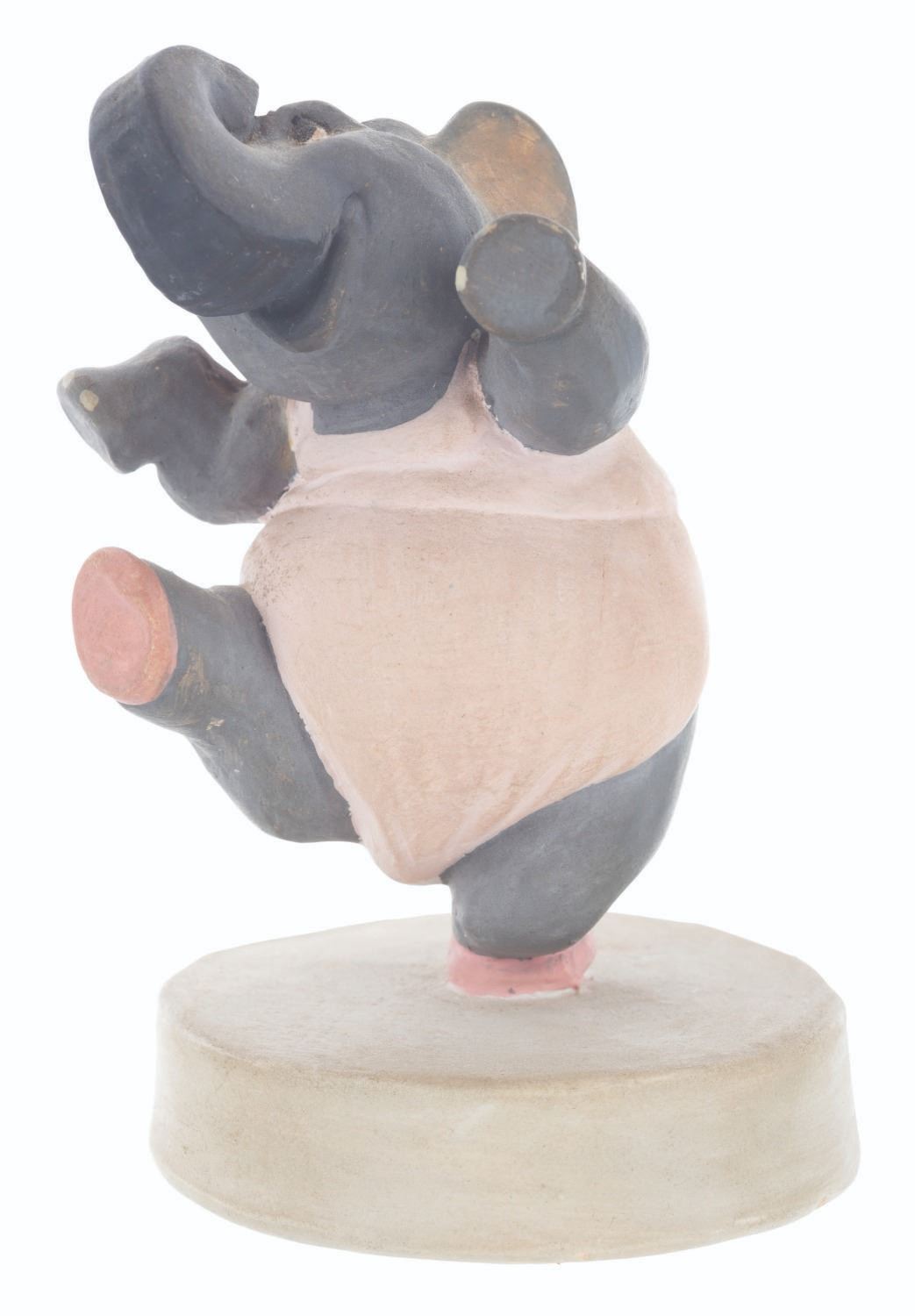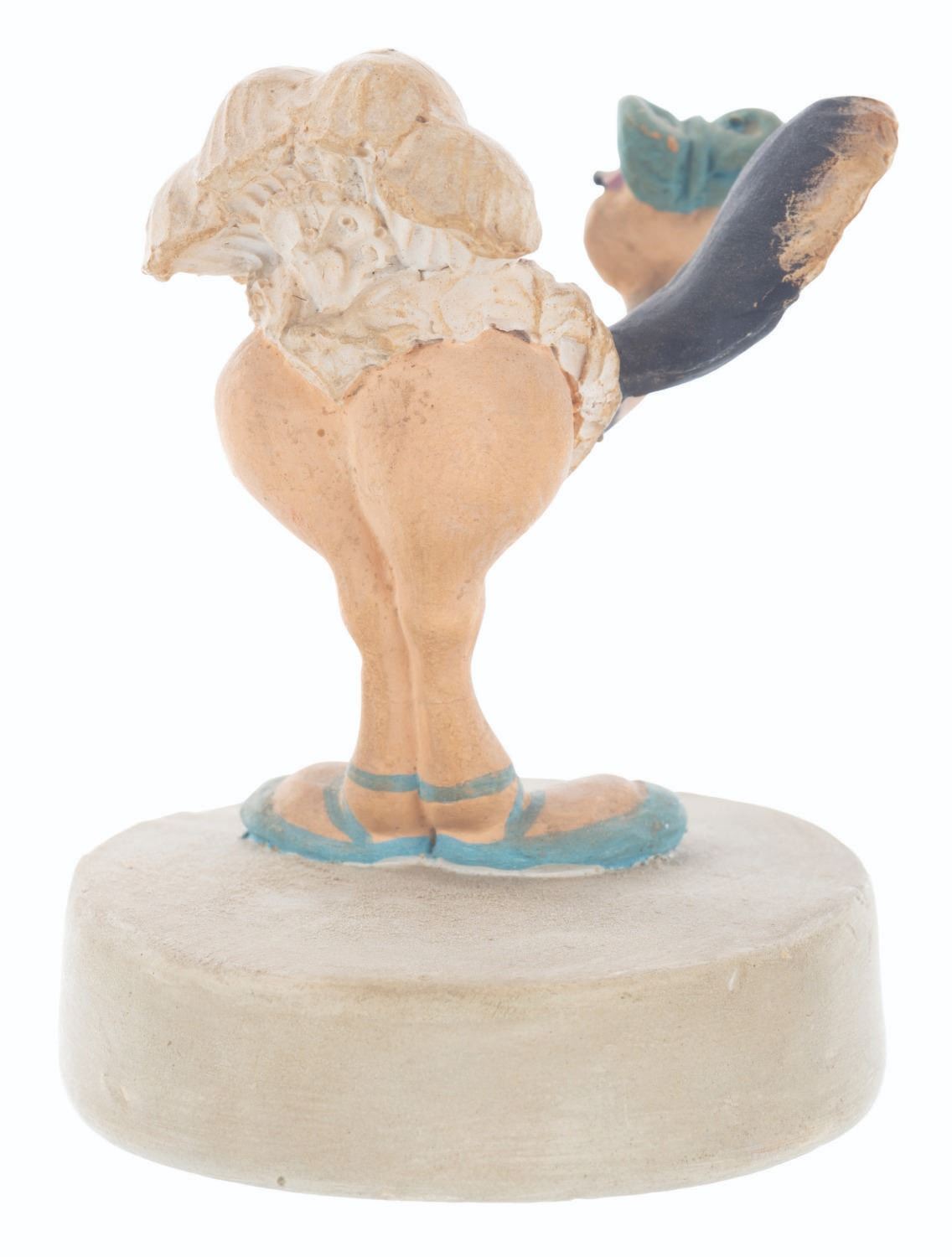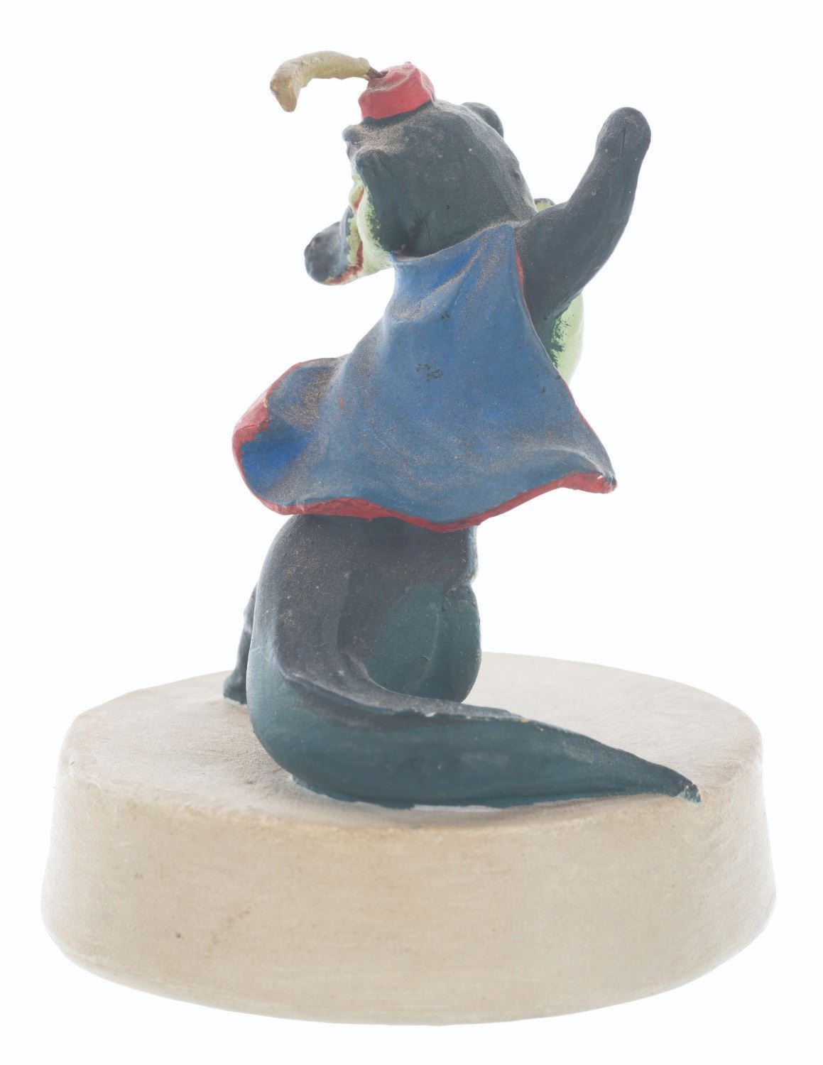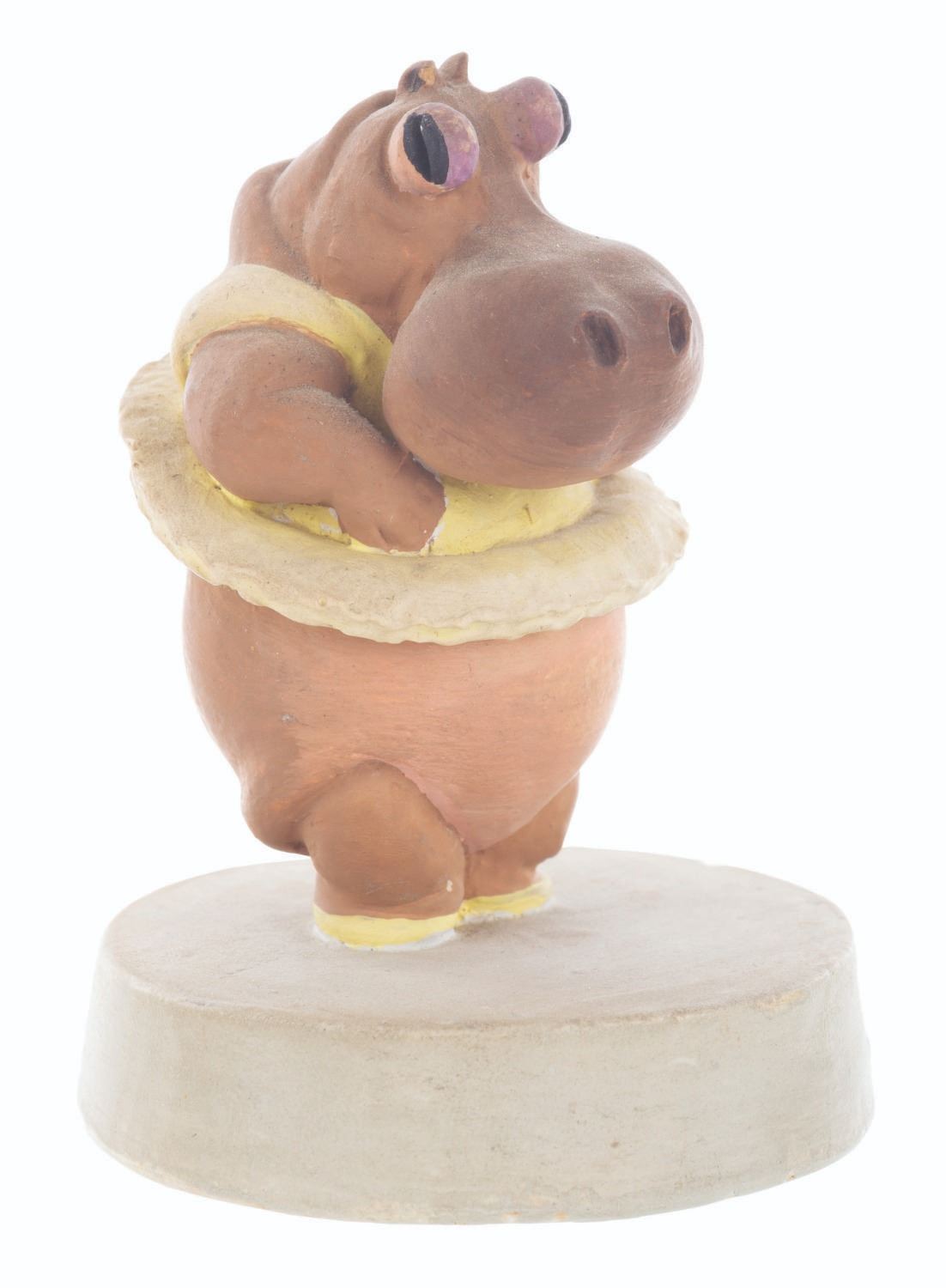 (Disney, 1940) An extremely rare set of four miniature maquettes produced in the Model Department at the Disney Studio during the production of "Fantasia." In order to get a better idea of how to choreograph and light the "Dance Of The Hours" sequence, the model department built a miniature stage and populated it with these miniature figures. The model and figures assisted animators in recreating lighting as it would appear on a real stage. Hand-painted with painstaking detail, the figures range between 2.25" and 3" tall. Most were attached to a metal base, however these four have larger plaster bases and were more likely used to highlight specific scenes. All four are in very good condition with light wear and soiling. Ben Ali-gator has some small chips in his paint. An incredibly rare set and a fascinating part of Disney Studio Animation history.