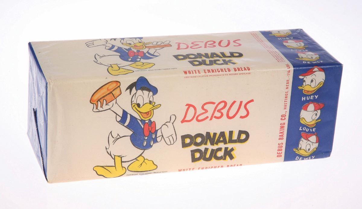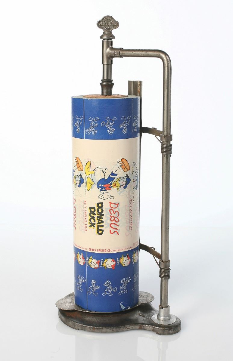 (c. 1950s) Unused roll of wrapping for Debus Donald Duck Bread. The roll is 17" tall and comes on the original dispenser. A very unusual and rare piece of Disneyana.