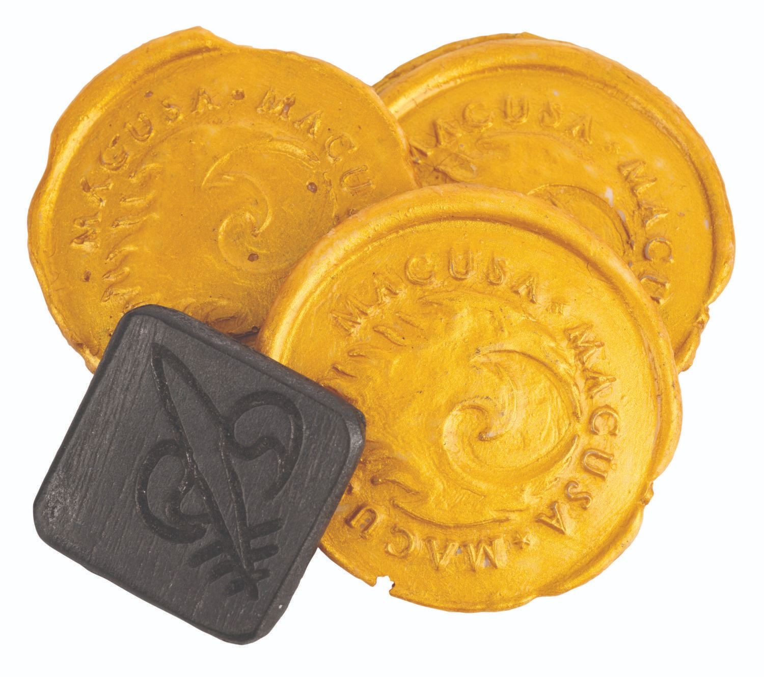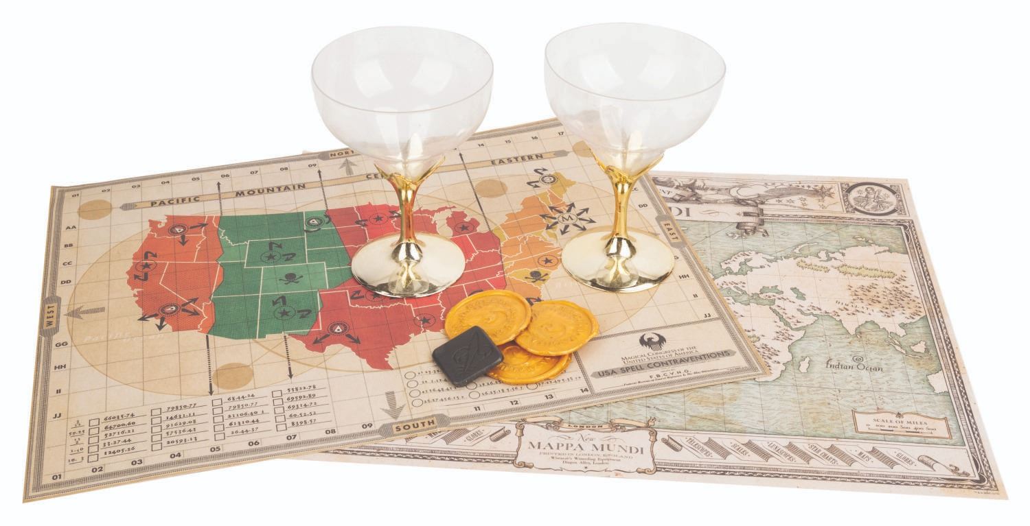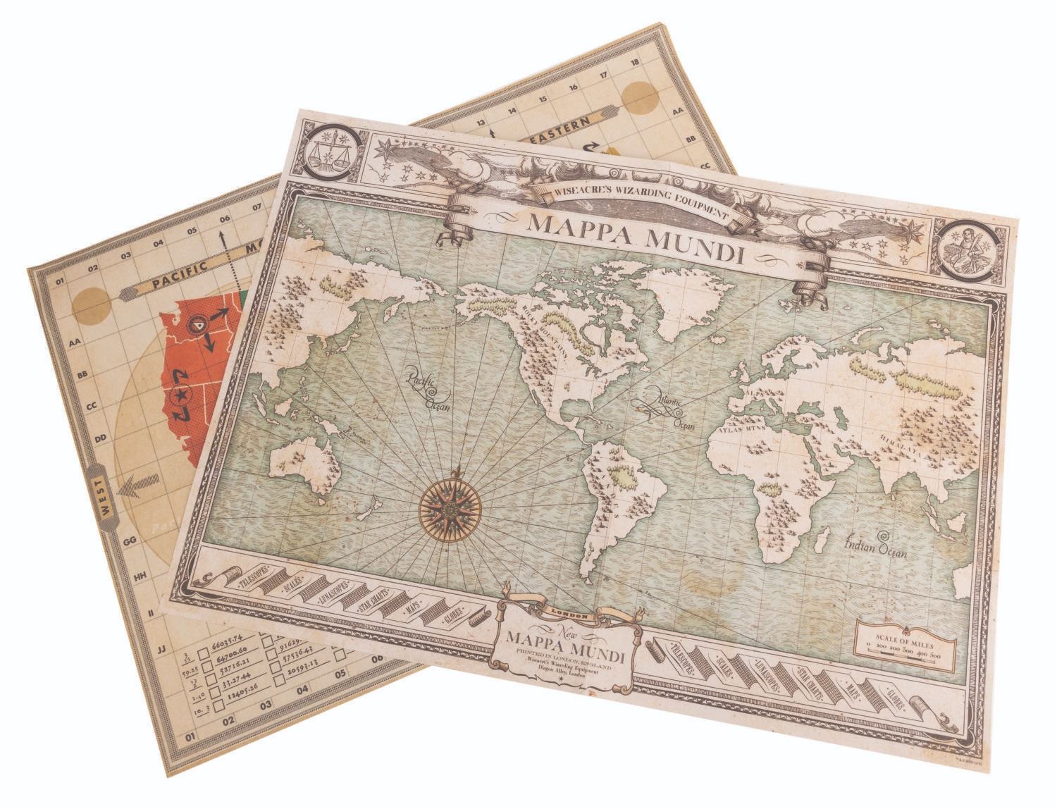 (Warner Bros., 2016-2022) A selection of "Fantastic Beasts” trilogy souvenirs, including a promo Wiseacre’s Wizarding Equipment Mappa Mundi map, a promo USA Spell Contraventions map, three MACUSA wax seal props, one black fleur-de-lis wax game piece prop, two plastic goblets from the crew wrap party, and a Blu-ray collection of the trilogy. Ranging in size from a 1.25” x 1.25” black game token prop to a 10” x 14.25” map, the items display in good to very good condition with scratches, stains, tape on the Blu-ray slipcase, original folds on the map, and wear from production use.