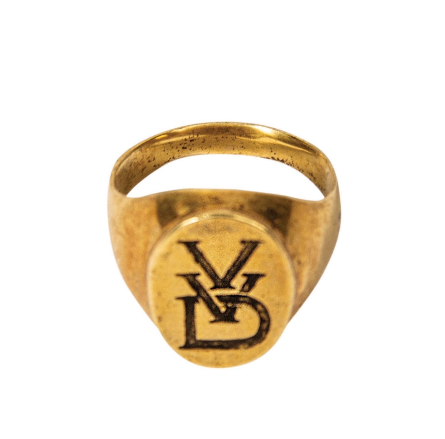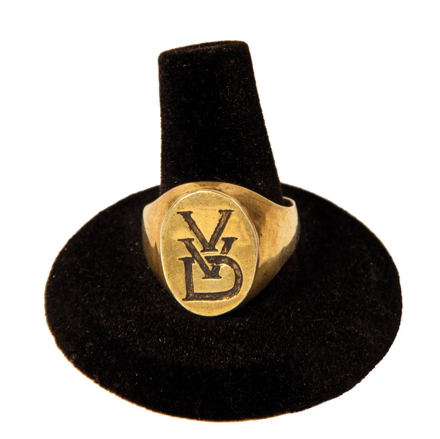 (20th Century Fox, 2005) A screen worn prop signet ring created for Julian McMahon in his portrayal of Dr. Doom in Fantastic Four. The metal ring features the monogram "VVD" for Victor Von Doom, and while the ring is not marked for material or size, it is approximately a size 10. The condition is good, with some tarnishing to the interior and exterior of the band and a small groove inside the band at the reverse of the monogram.