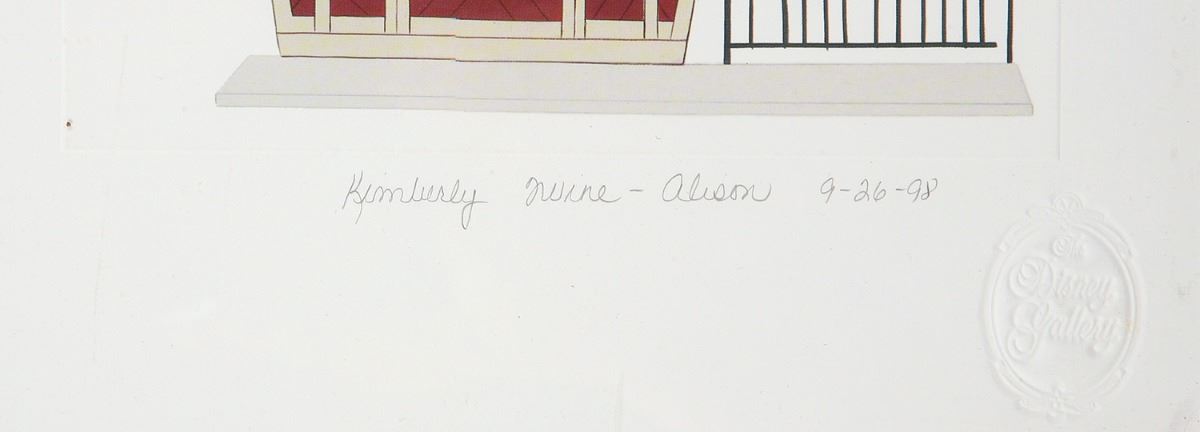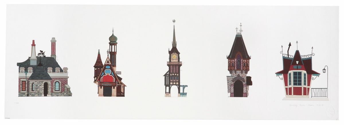 (Disneyland, 1998) A limited edition art print by Imagineer Kim Irvine featuring Fantasyland building elevations, sold at the Disney Gallery. Signed and dated by the artist. Numbered 117/150. Measures 13"x39". In fine condition with minor edge and corner-wear.