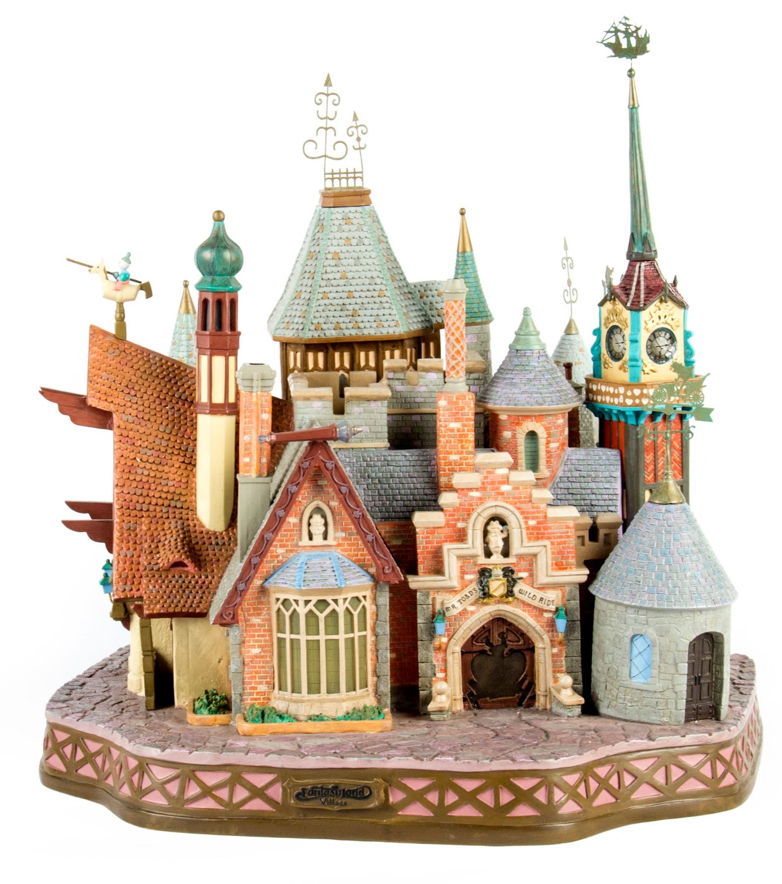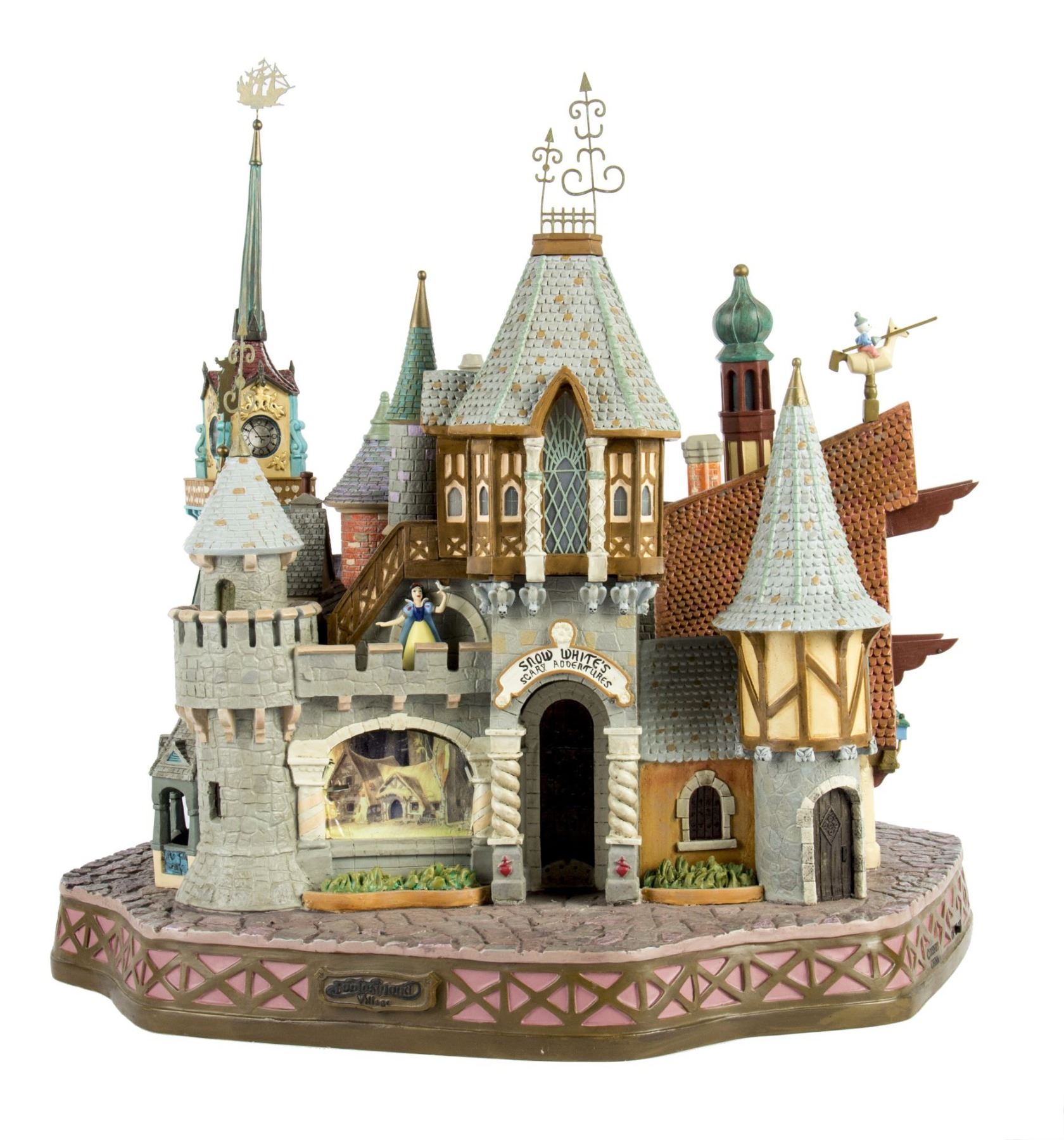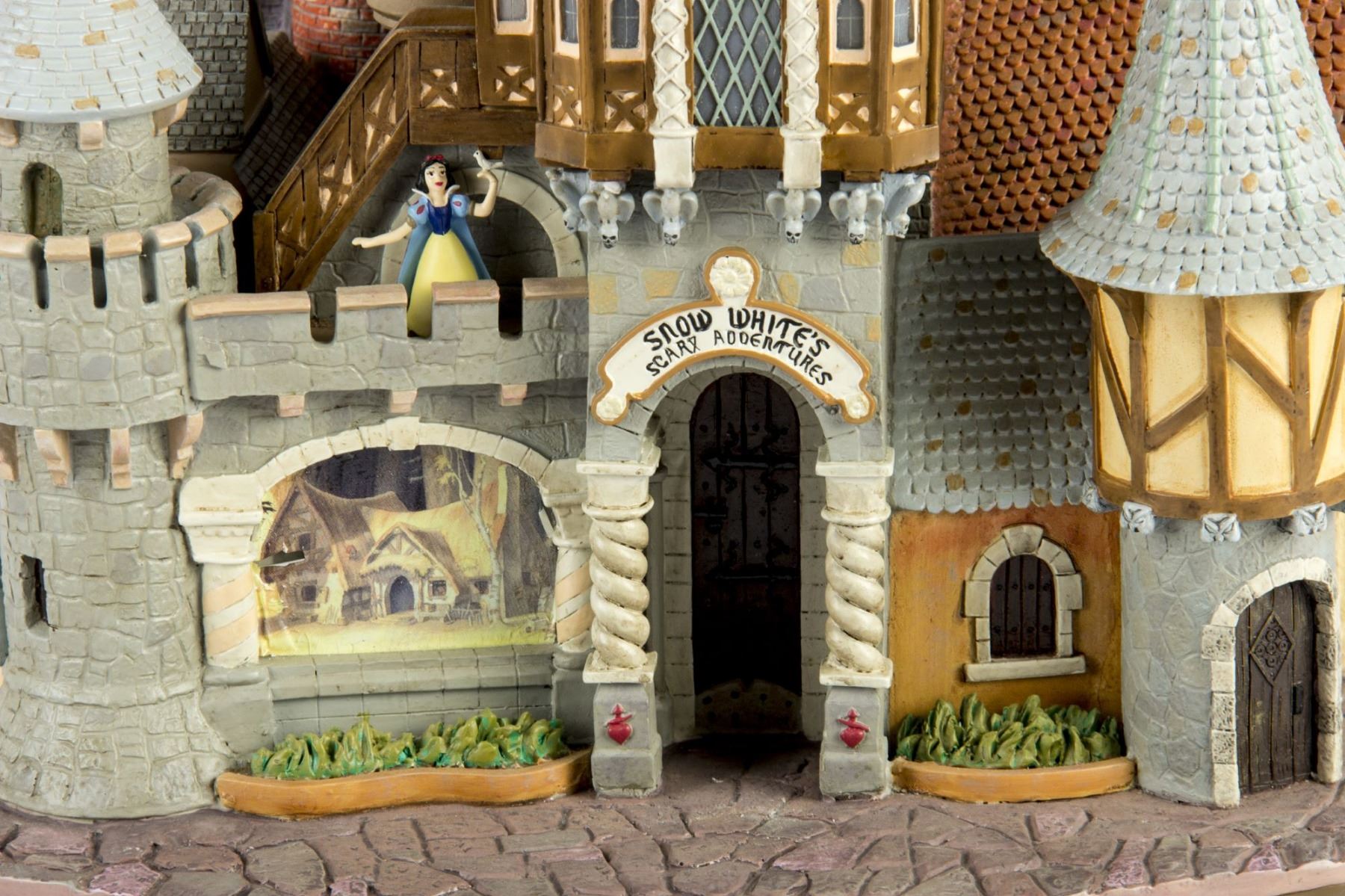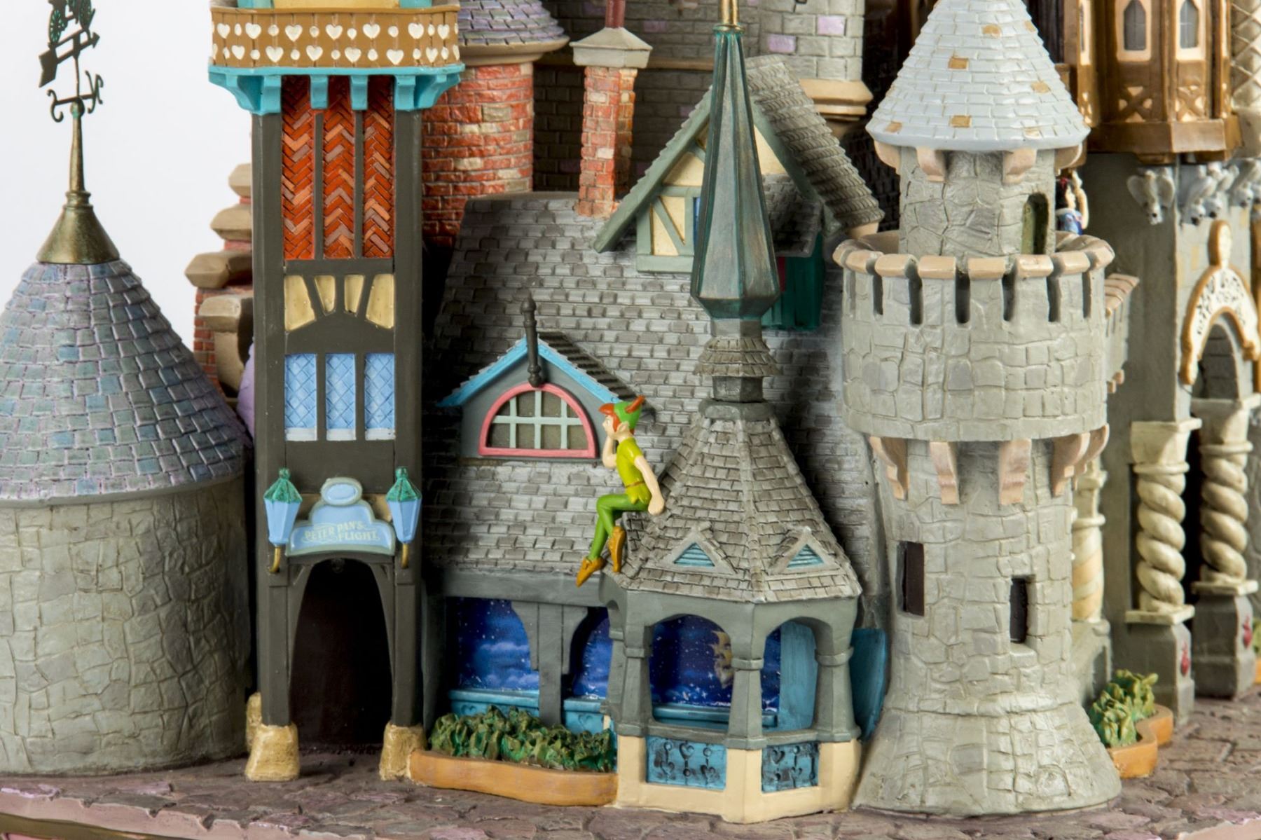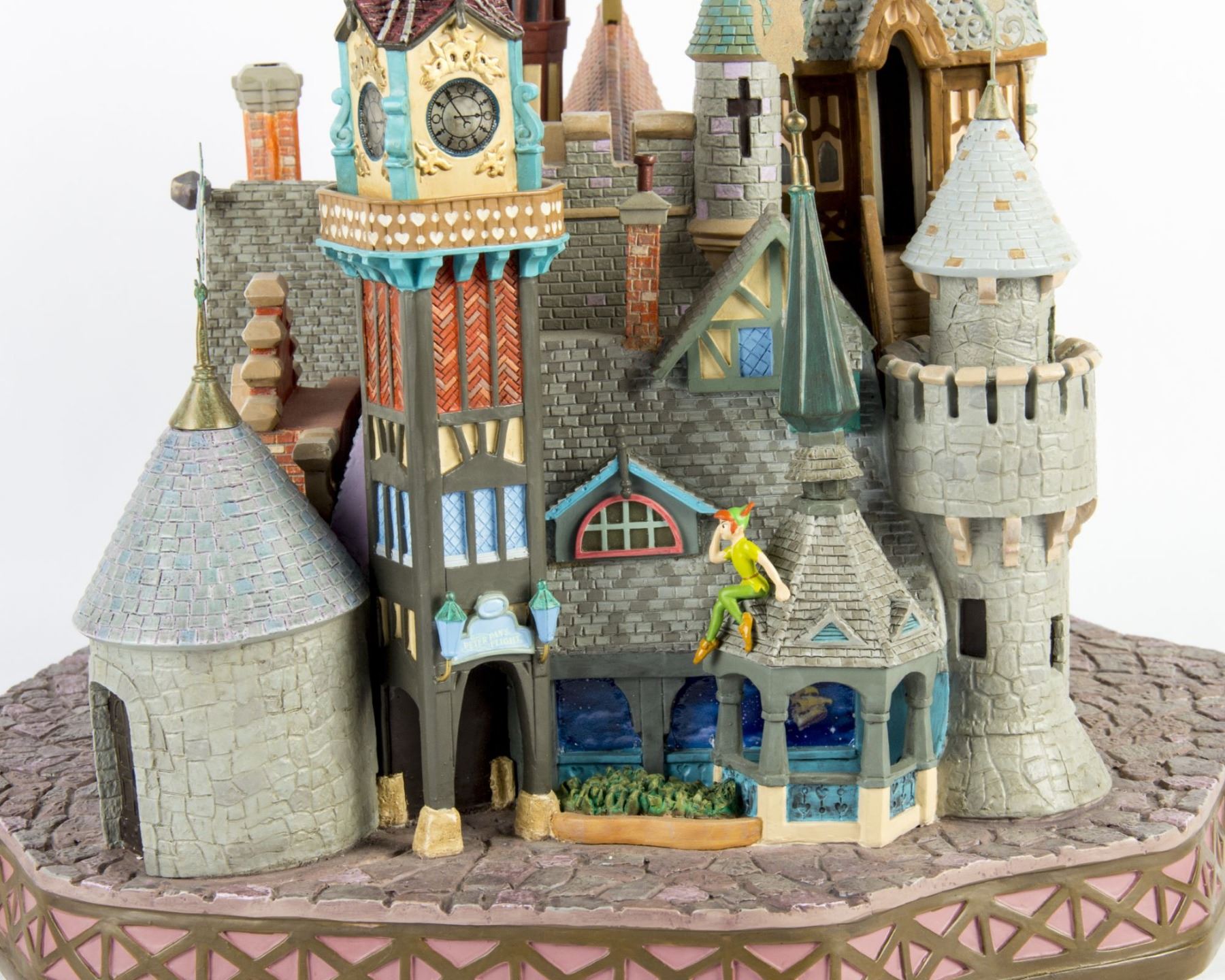 (Disneyland, 2005) A stunning "Magical Big Figurine" created by Larry Nikolai for the 50th Anniversary of Disneyland. This Fantasyland themed "Big Fig" features attractions such as "Snow White's Scary Adventures", "Mr. Toad's Wild Ride", and "Peter Pan's Flight". This "Big Fig" is battery-operated, with lights throughout that cause mural elements and windows to glow. This figurine measures approximately 15" in diameter and 16" tall, and is in fair condition with some wear throughout including a few bent spires. Two magnetically attachable spires appear to be missing.