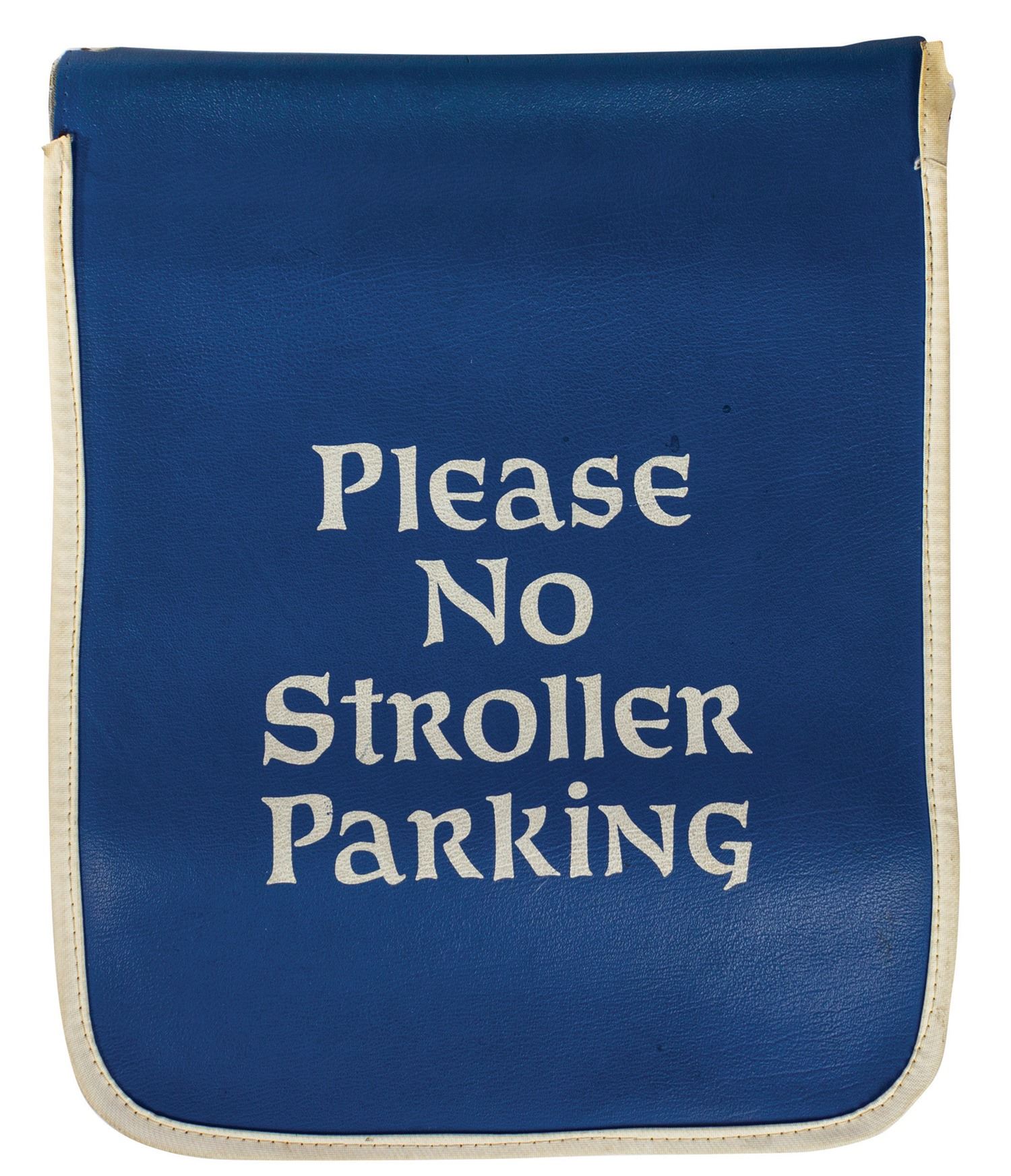 (Disneyland, 2000s) A faux leather flag from Fantasyland used to designate a "No Stroller Parking" area. These types of flags were displayed on ropes near Pinocchio's Daring Journey, and use velcro on the reverse to hold the flag in place over the rope. Measuring 15"x12.5", the single-sided flag is in good condition with some surface and edge wear from use, particularly in the top corners.
