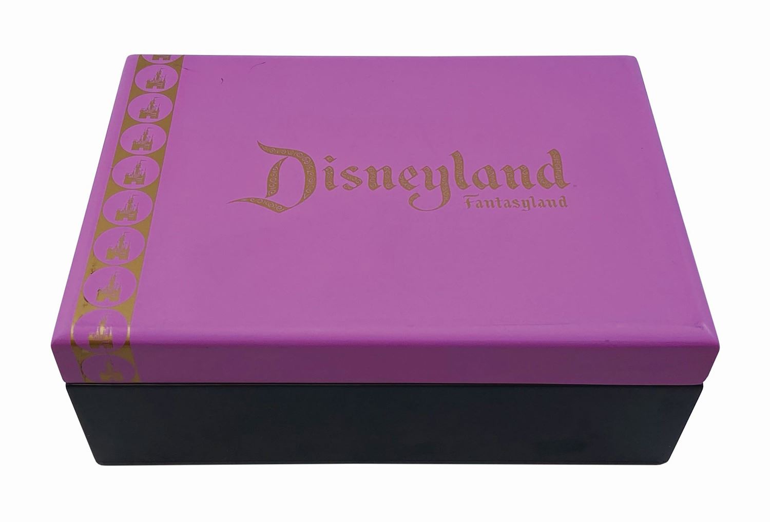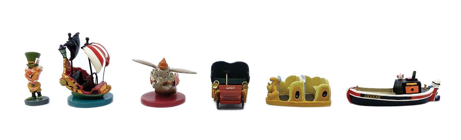 (Disneyland, 2005) A limited edition boxed set of Fantasyland-themed pewter miniatures created by Kevin Kidney and Jody Daily for Disneyland's 50th Anniversary. This set was limited to 1500 pieces and includes miniatures of: the Mad Hatter, a Canal Boat, a Dumbo attraction vehicle, a Mr. Toad attraction vehicle, an Alice attraction vehicle, and a Peter Pan attraction vehicle. This boxed set measures 7"x10" and 3.5" tall and is in very good condition with some scuffing to the box. Does not come with styrofoam in the lid.