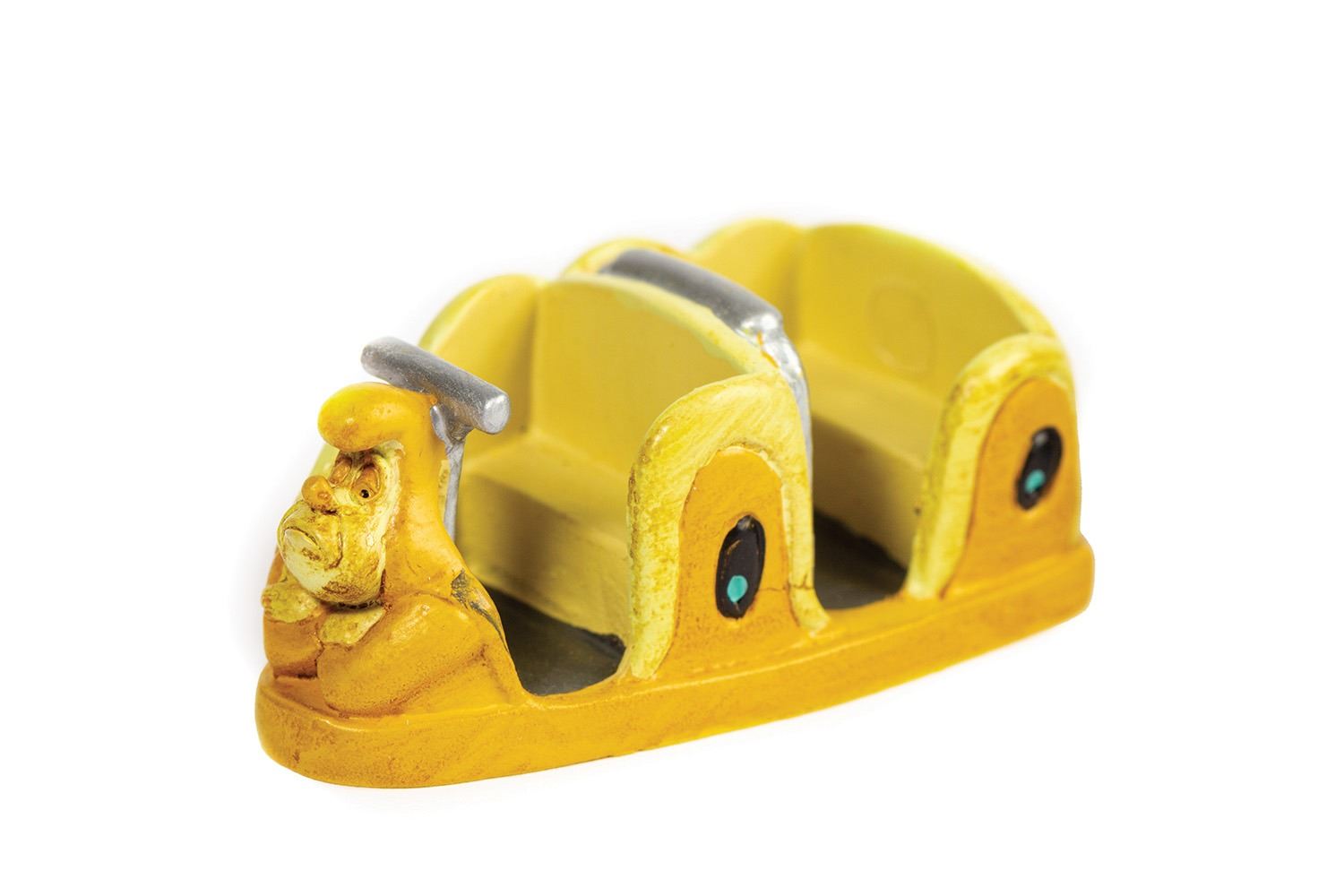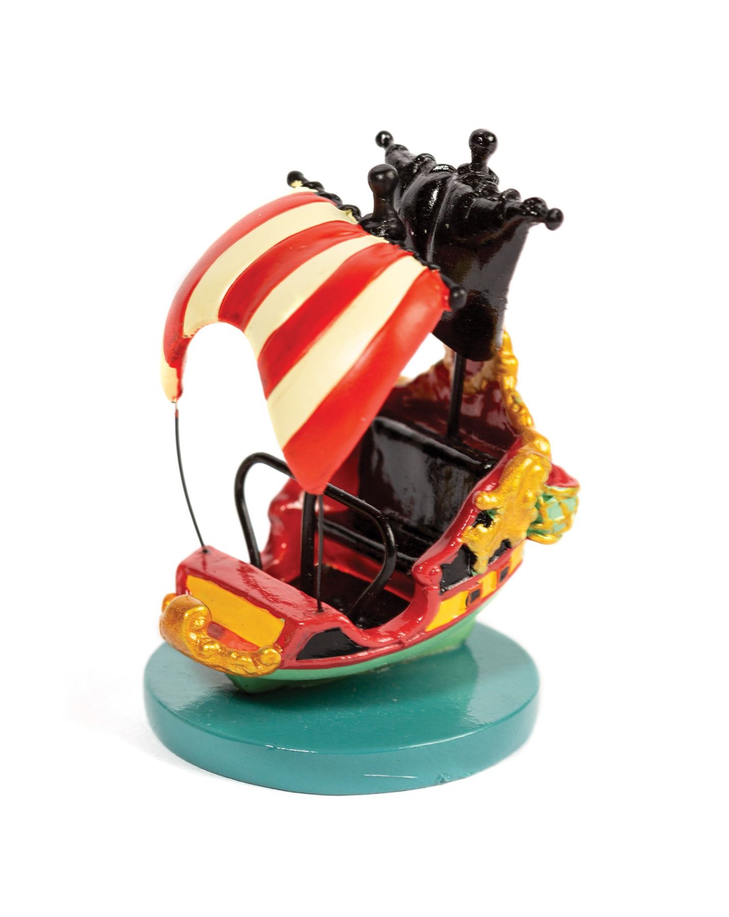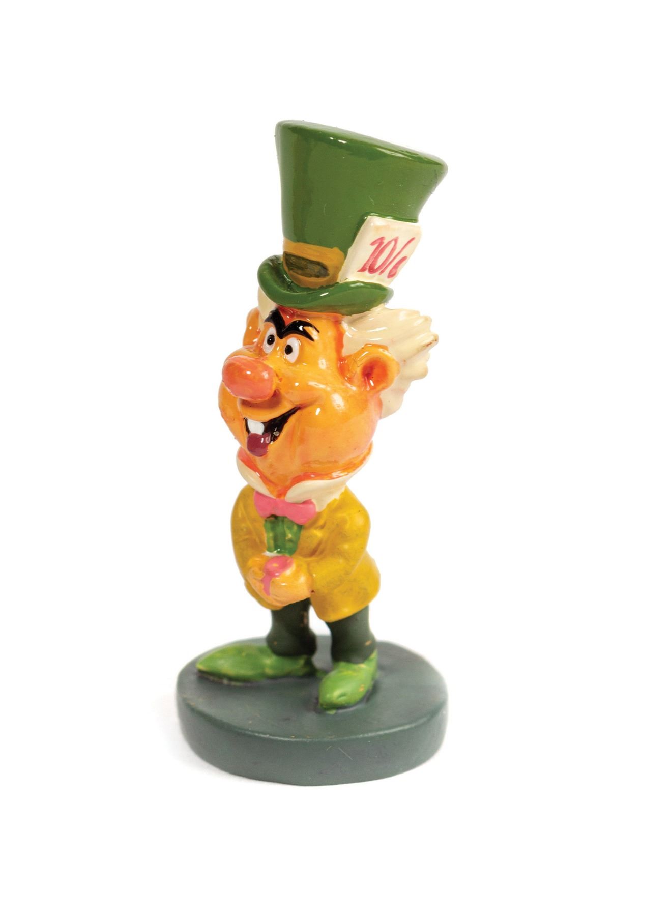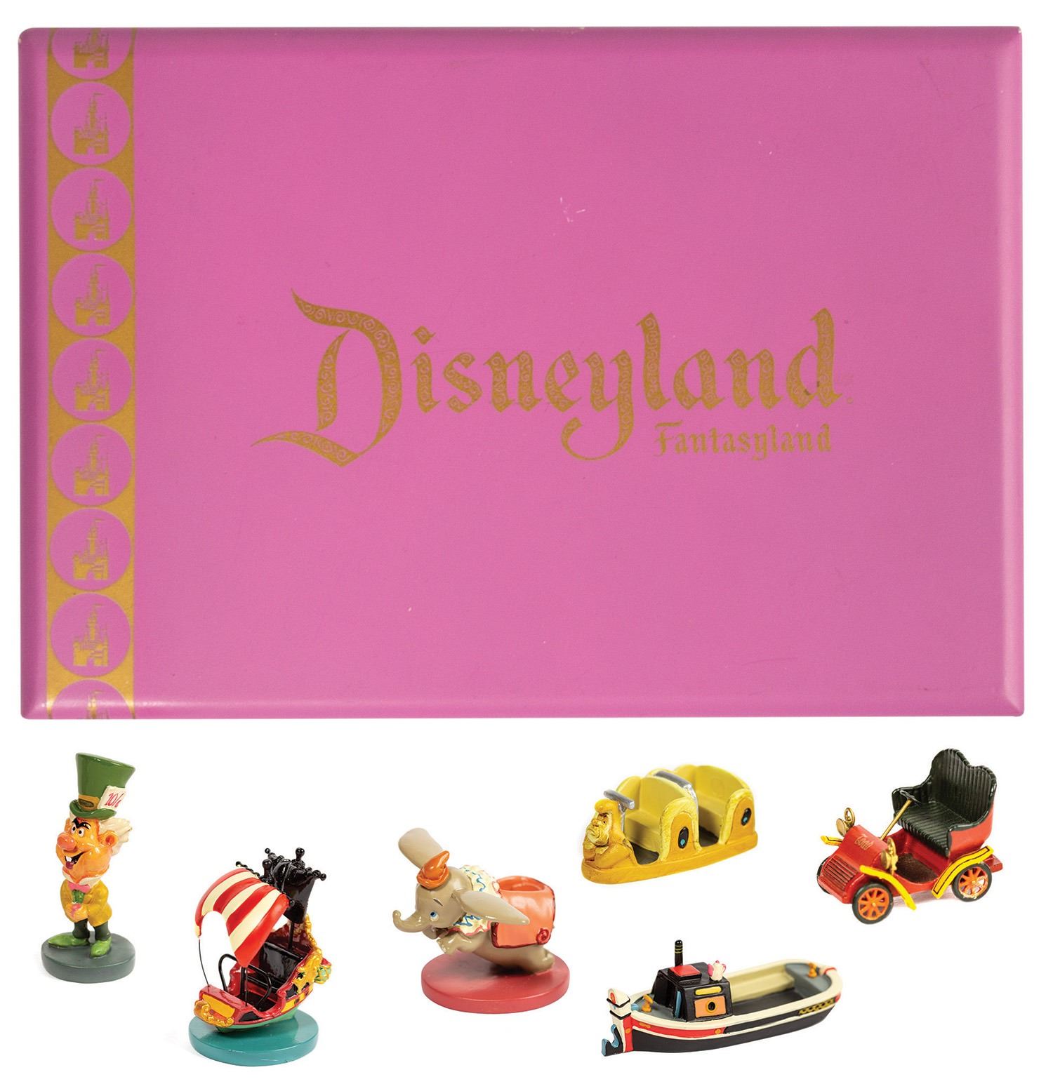 (Disneyland, 2005) This limited edition boxed set of Fantasyland-themed pewter miniatures was created by Kevin Kidney and Jody Daily for Disneyland's 50th anniversary. This set was limited to 1500 pieces and includes miniatures of: a Dumbo ride vehicle, a Peter Pan vehicle, an Alice in Wonderland vehicle, a Storybookland boat, a Mr. Toad vehicle, and a Mad Hatter costumed character. This boxed set measures 7"x10" and 3.5" tall, and is in very good condition with minor wear from use. Some miniatures have some surface wear from previous display. The original COA is included.