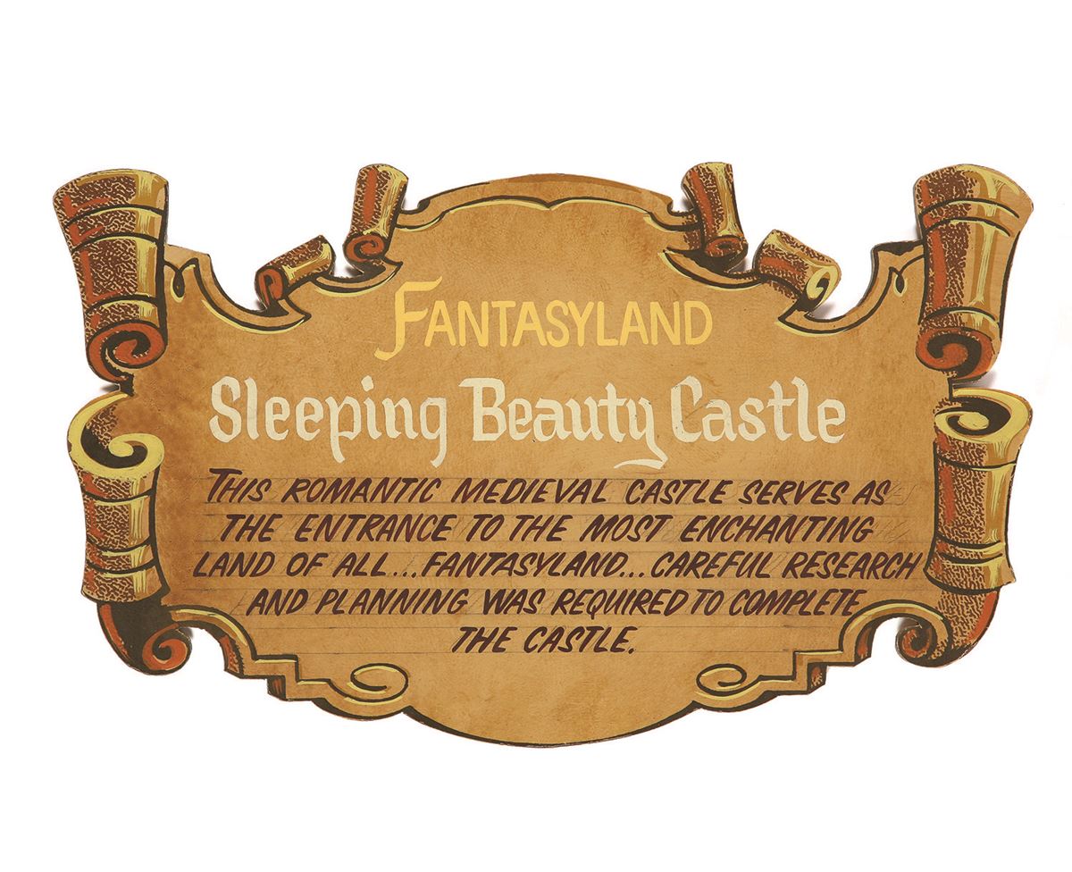 (Disneyland, 1955) After the opening of Disneyland, the Imagineering models used to build the park were put on display at the Red Wagon Inn on Main Street. This hand-painted 7.5”x12.5” Masonite plaque was attached to the model of Sleeping Beauty’s Castle at the display. It stayed with the castle until late 1985 when Imagineer John Stone restored the model for exhibition. A fantastic example of early Imagineering workmanship. In fine condition with very minor scratches and scuffs.