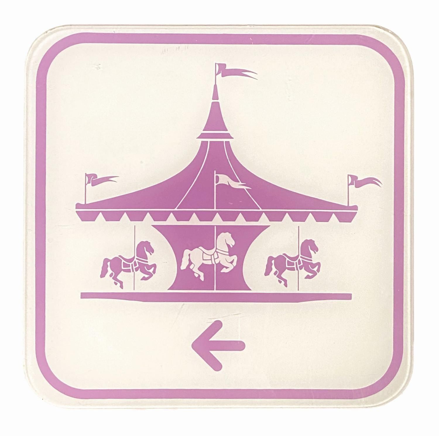 (Walt Disney World, c.1980s) A vintage park-used Fantasyland utilidor directional sign from Walt Disney World. The utilidor is the system of tunnels running under the Magic Kingdom allowing cast members to move throughout the park and perform maintenance tasks without being seen by guests. The walls of the tunnels are color-coded to ascertain location. The acrylic sign has a vinyl backing depicting a carousel icon in a lavender square and would have pointed the way toward Fantasyland. Measuring 14.5"x14.5", the piece is in very good condition with some scuffing, scratches, and adhesive residue to the acrylic, and soiling, scuffs, and scratching to the reverse of the sign.