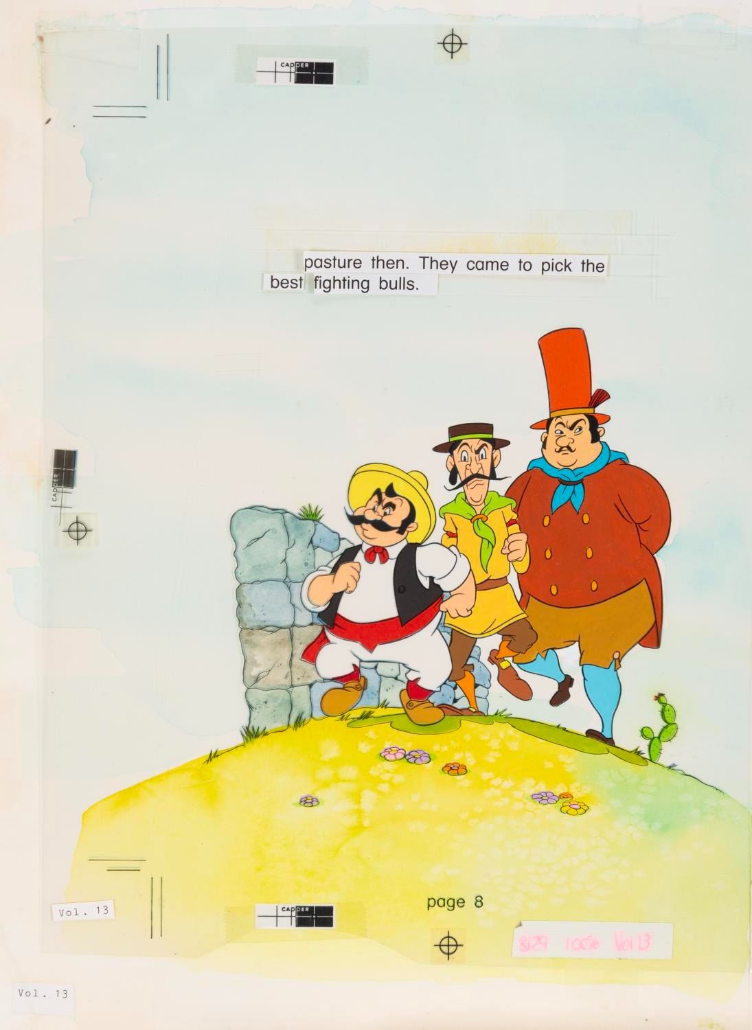 (Bantam, 1986) The original art for two pages of "Ferdinand and the Bullies " published as volume 13 of the Walt Disney Fun-to- Read Library. The art is accomplished in watercolor on artboard, with a black line overlay and text paste-ups on top. Measuring 15 " x 22 " overall, the art is in very good condition with wear mainly outside of the image borders, typical of production use, and art of the text on the left-hand page missing.