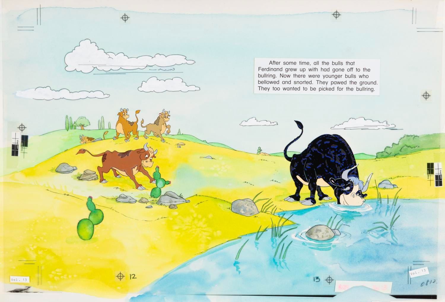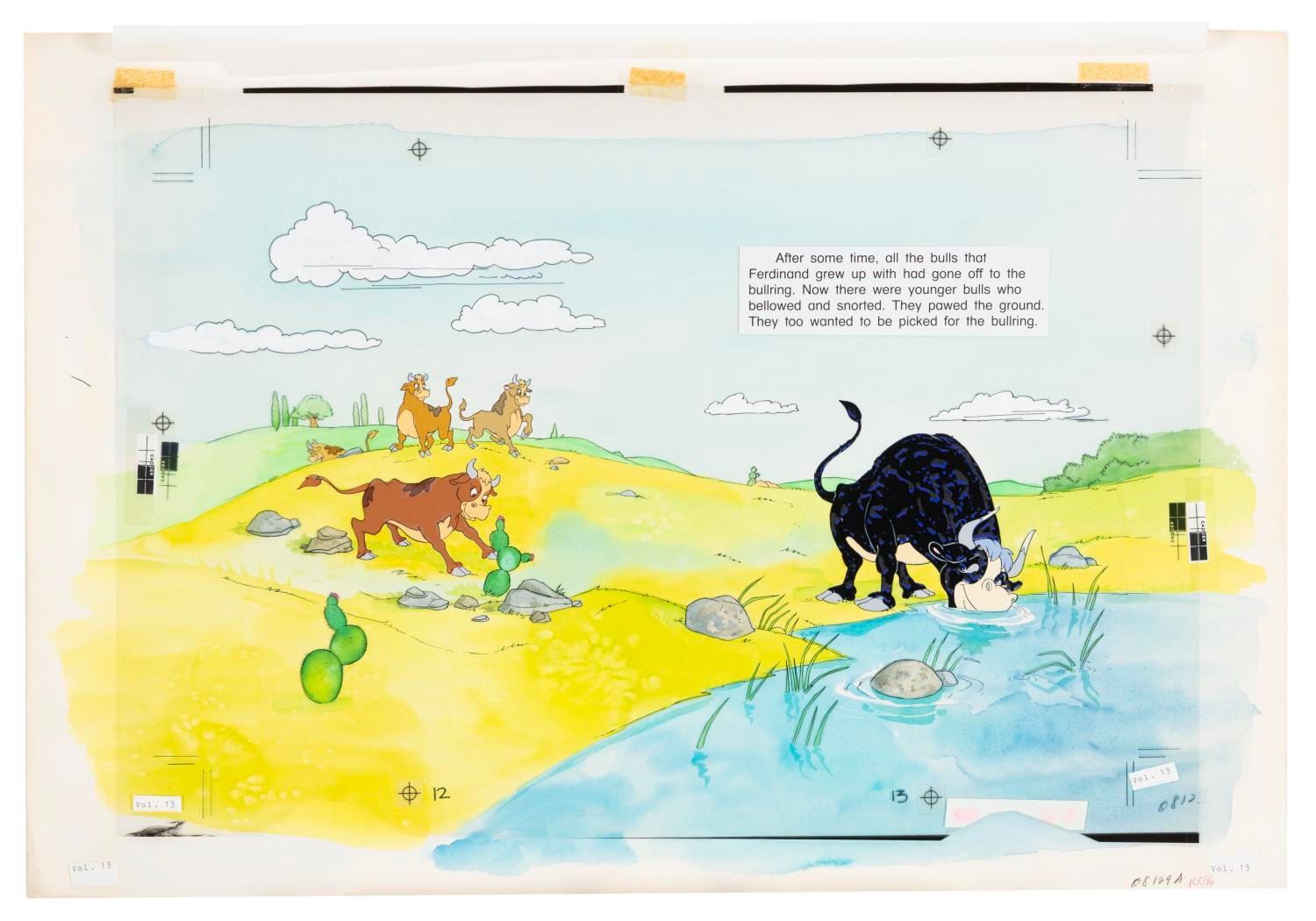 (Bantam, 1986) The original art for two pages of "Ferdinand and the Bullies " published as volume 13 of the Walt Disney Fun-to-Read Library. The art is accomplished in watercolor on artboard, with a black line overlay and text paste-ups on top. Measuring 15 " x 22 " overall, the art is in good condition with paint transfer, discoloration from age, and wear from production use.